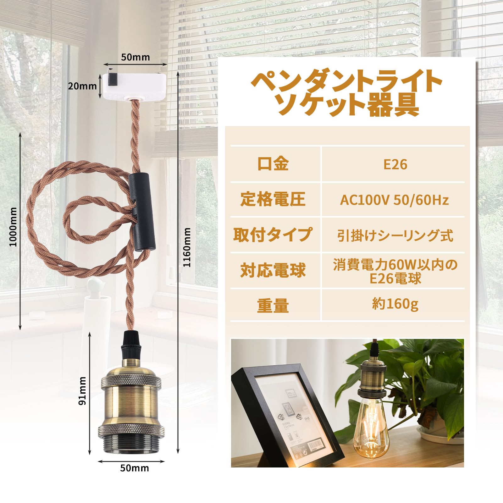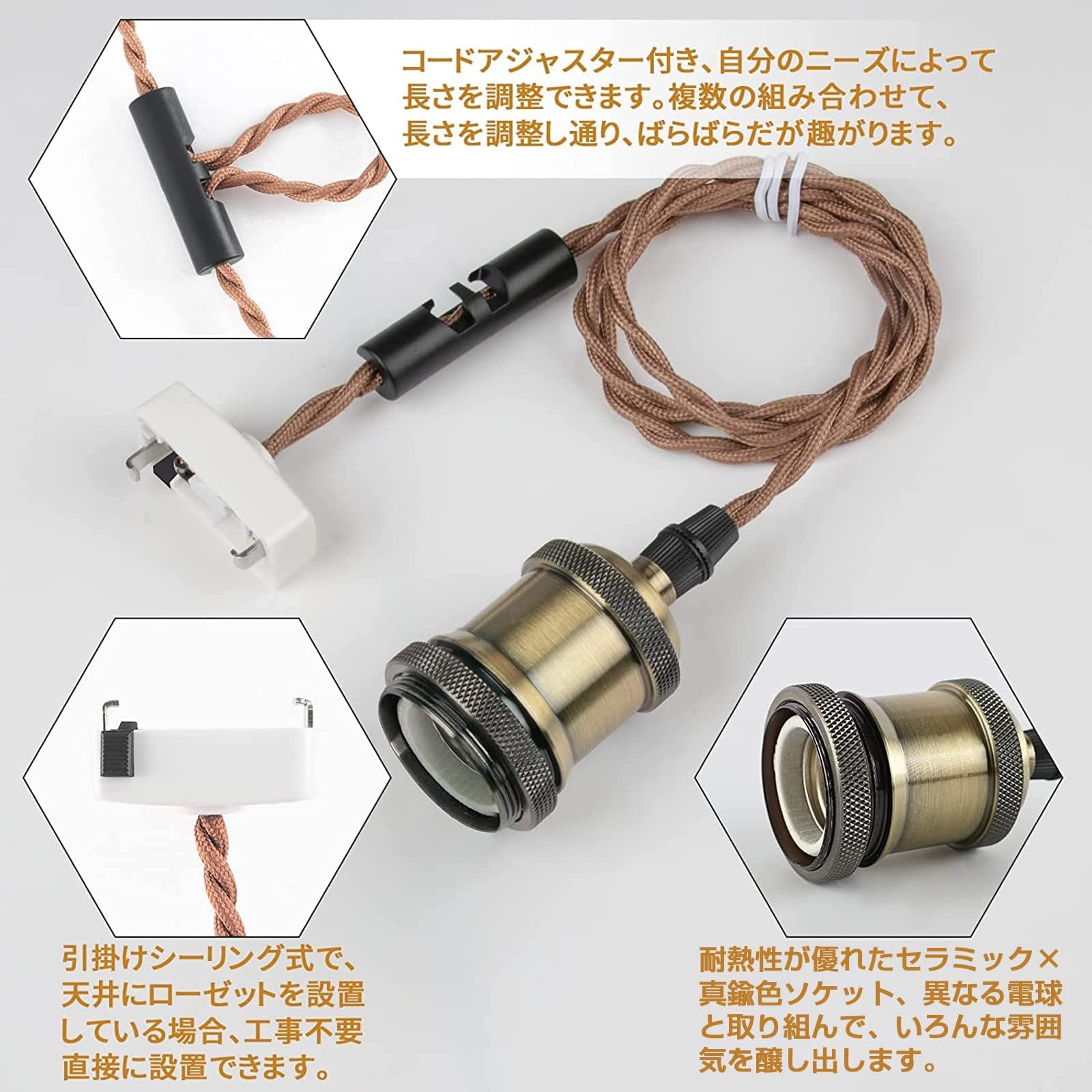 szbritelight 引掛シーリング用 電球ソケット3個セット E26 吊り下げ LED電球対応 ペンダントライト裸電球用 真鍮色 100cm コード調整可能 レトロ おしゃれ 天井照明 ヴィンテージ【電球なし】
