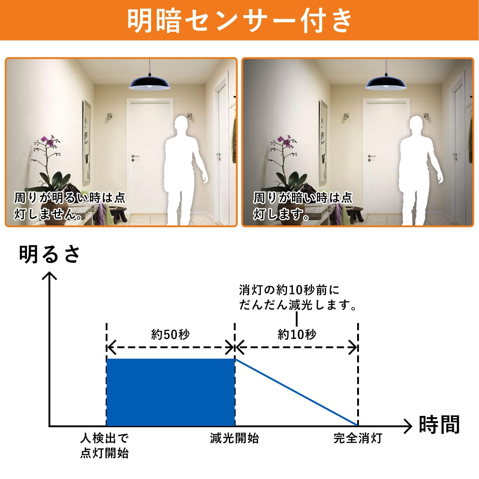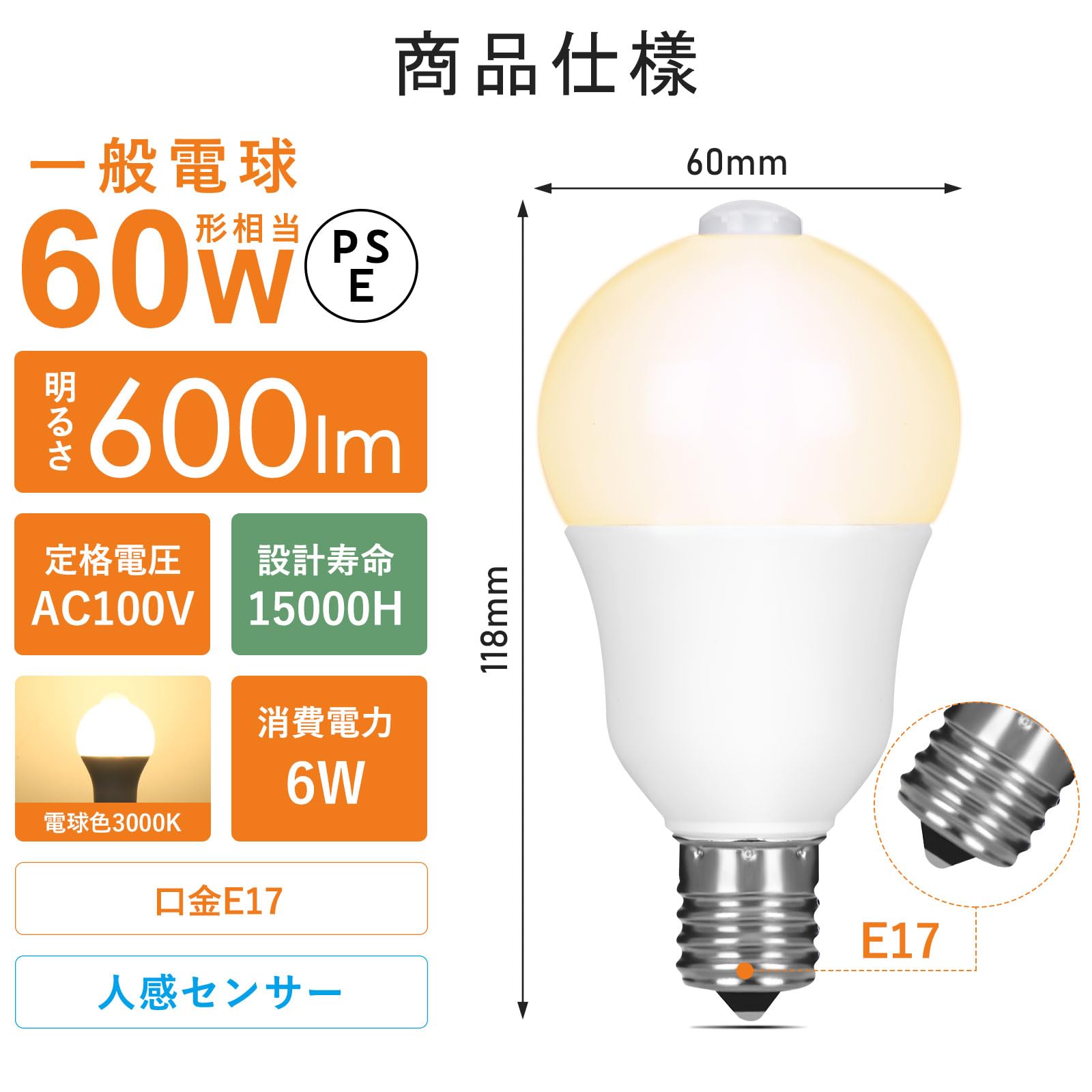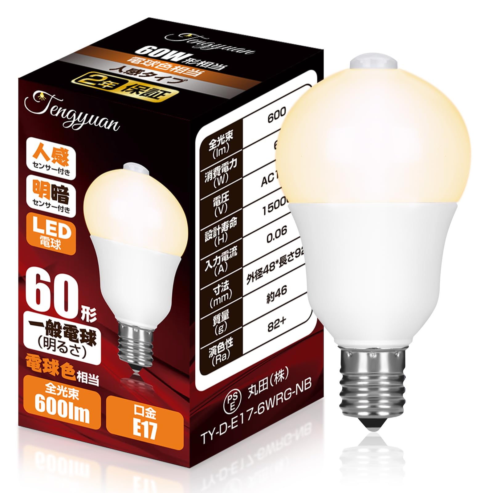Tengyuan LED電球 E17口金 人感センサー電球 60W形 6W 600lm 電球色 自動点灯 消灯忘れ防止 明暗センサー付き 調光不可 省エネ 玄関 廊下 階段 1個入
