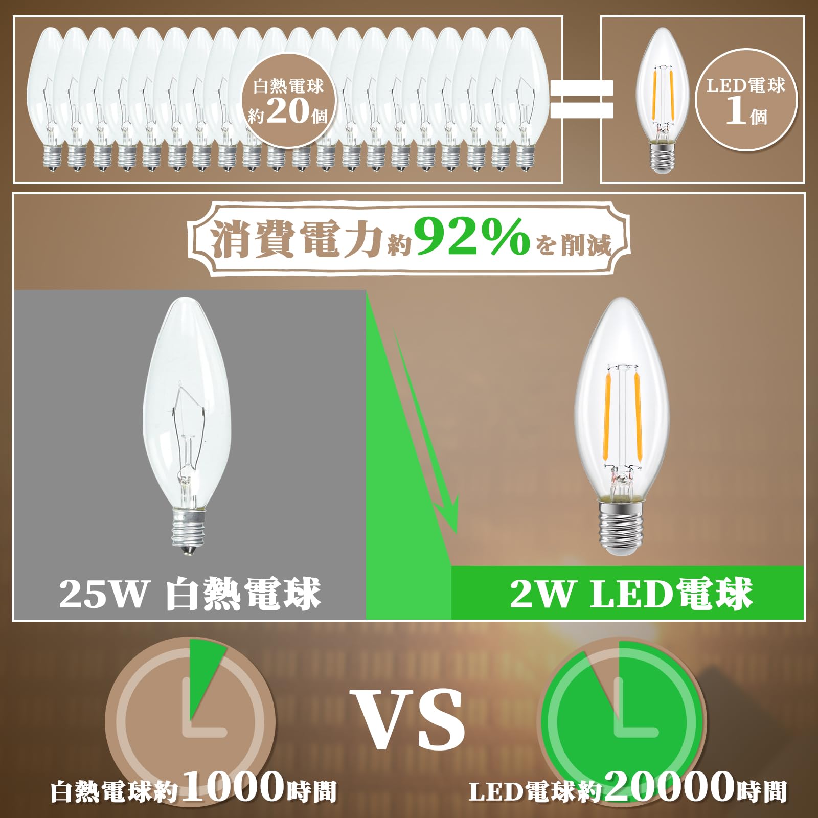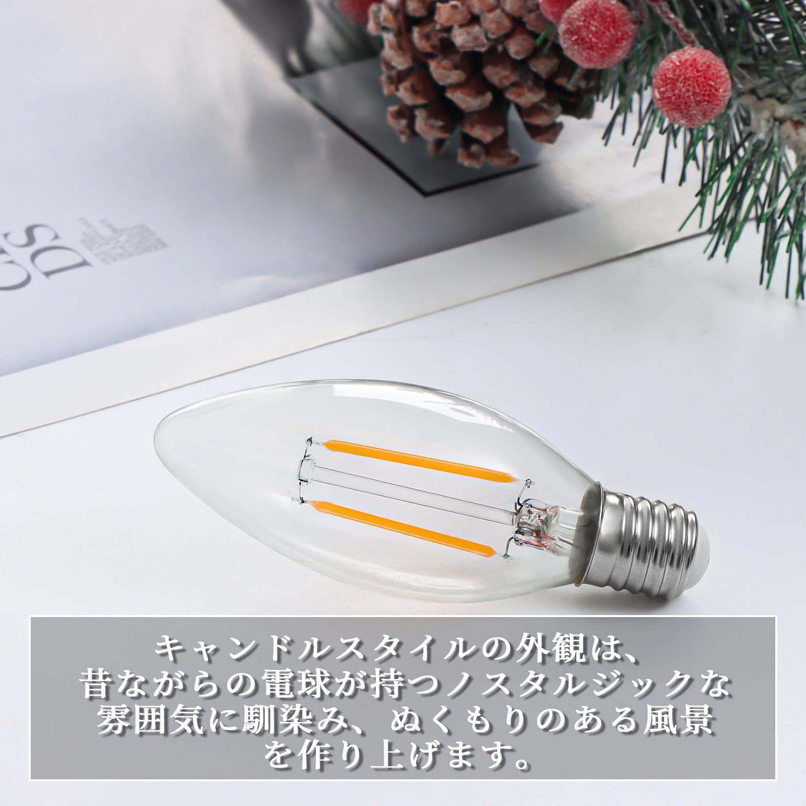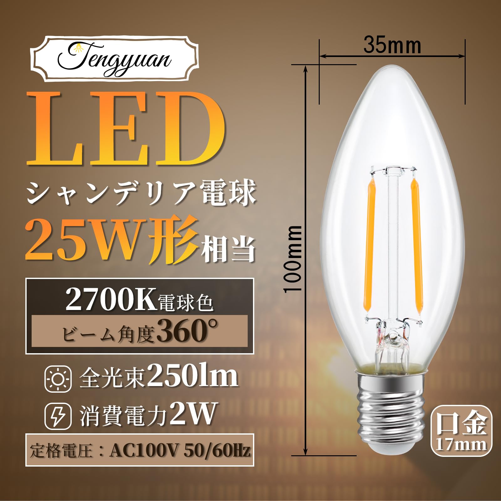 Tengyuan LED電球 シャンデリア電球 E17 25W形相当 2W C35 電球色2700K フィラメント エジソン電球 250lm 広配光360°全方向 クリア キャンドル電球【6個入り】蝋燭型 小型 高演色性 省エネ レトロ