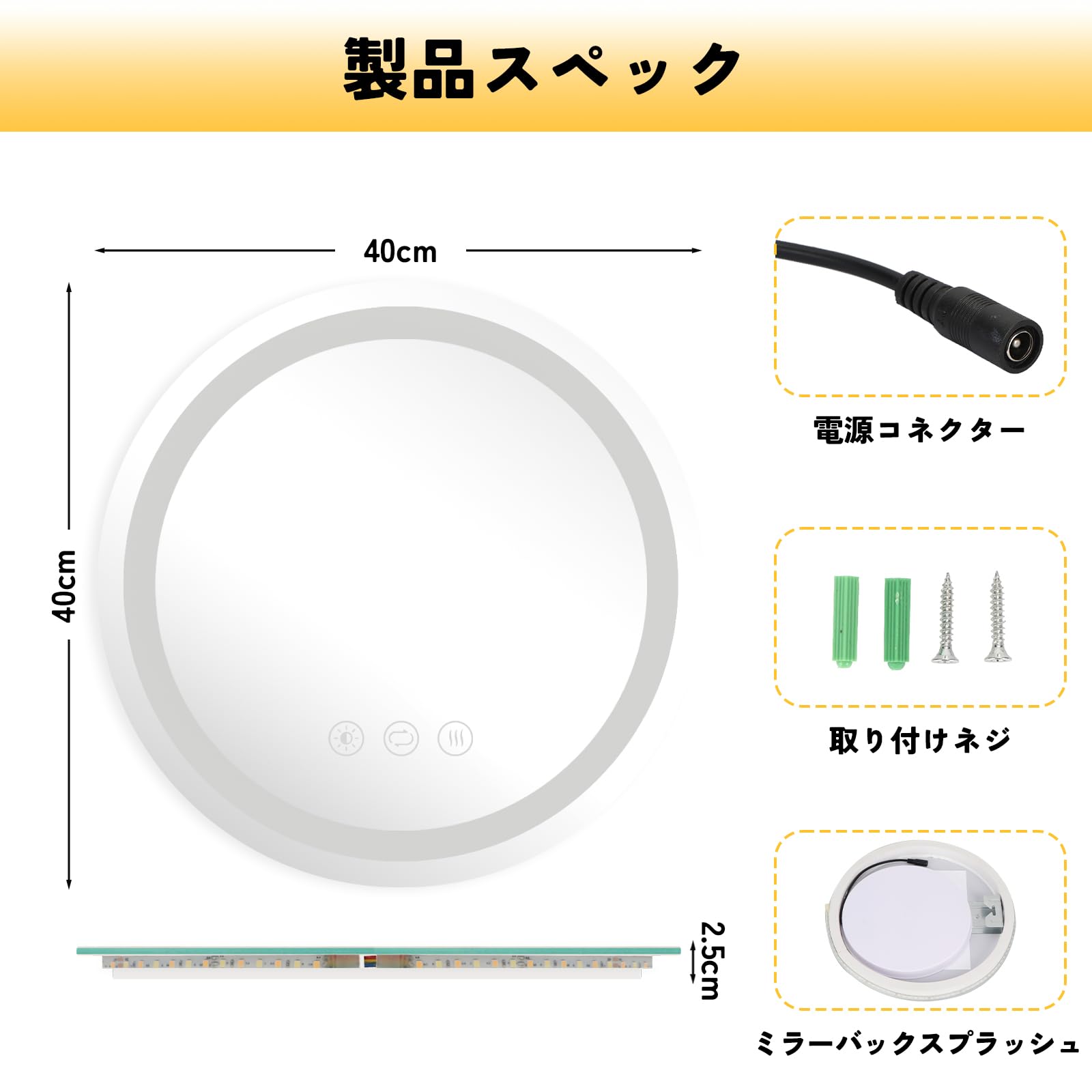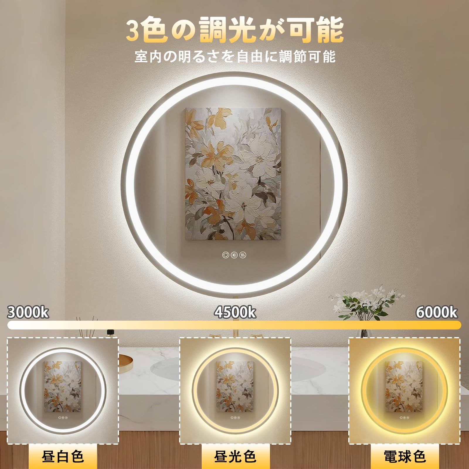 FLYOUNG LED 照明付き バスルーム ミラー キャビネット,円形,60cm,除霧機能付き,調光機能付き,三色温度