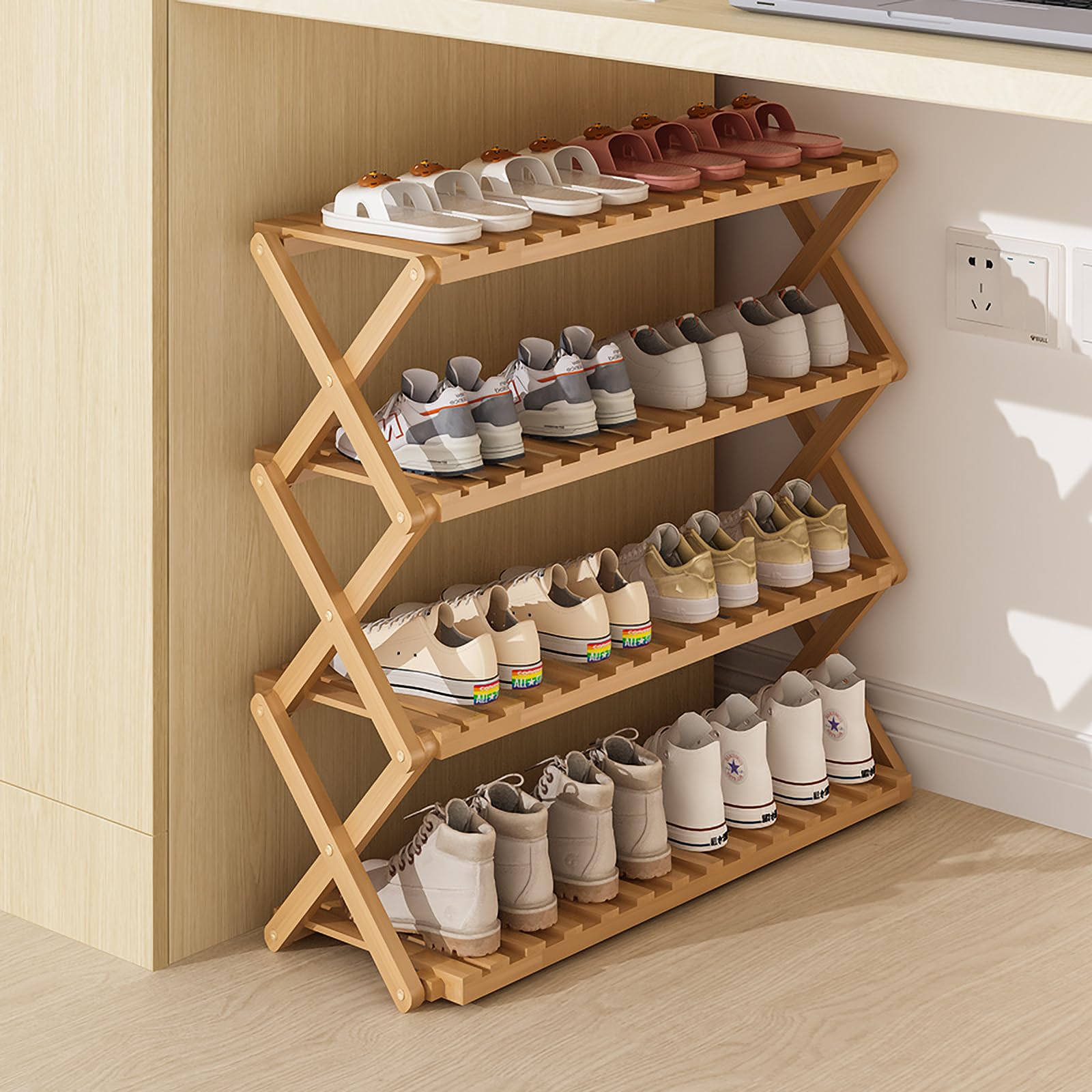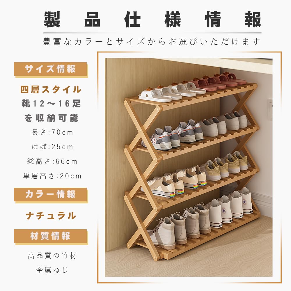 SKW 竹製 折りたたみ シューズラック 組み立て不要、玄関 コンパクト 多機能 収納 (ナチュラル, 幅70cm (4層))