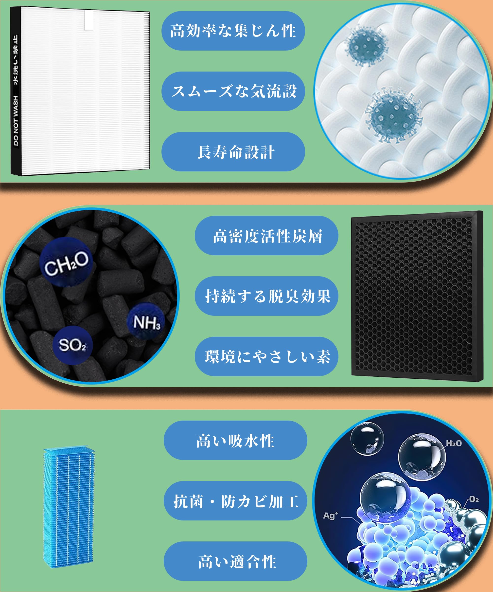 J&H F-ZXJP50 集じんフィルター F-ZXFD45 脱臭フィルター 1セット 空気清浄機フィルター 合計2枚入 互換品 F-VXT55 F-VXS55 F-VXR55 F-VC55X F-VXJ50 F-VXL55 交換用フィルター