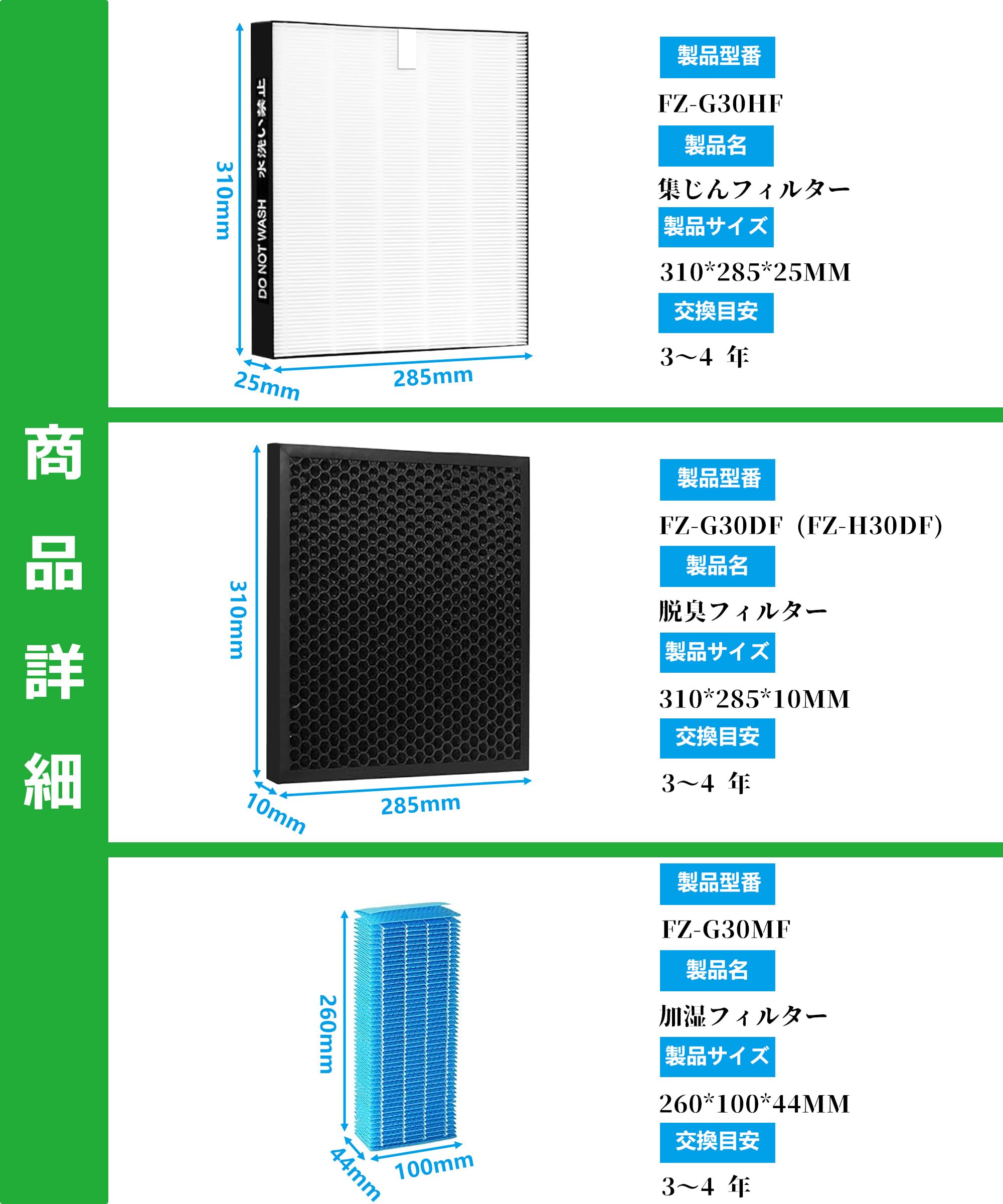 MRICH 静電 HEPA 集じんフィルター FZ-G30HF 高密度 活性炭 脱臭フィルター FZ-G30DF/FZ-H30DF 抗菌 加湿フィルター FZ-G30MF(3点セット)シャープ(SHARP)加湿器 空気清浄機 KC-30T5 KC-30T6 KC-30T7 KC-35T7 交換用フィルター 互換品