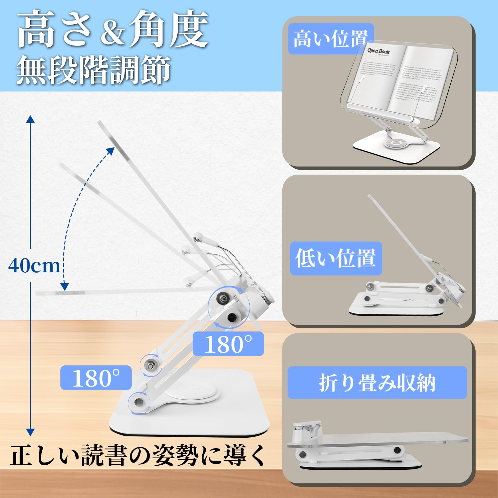 SupeDesk ブックスタンド 卓上 本立て おしゃれ 書見台 無階段高さ調整 角度調整 軽量 Ⅴ型台座 勉強用 子供 学生 ブックホルダー レシピ台 読書台 シンプル