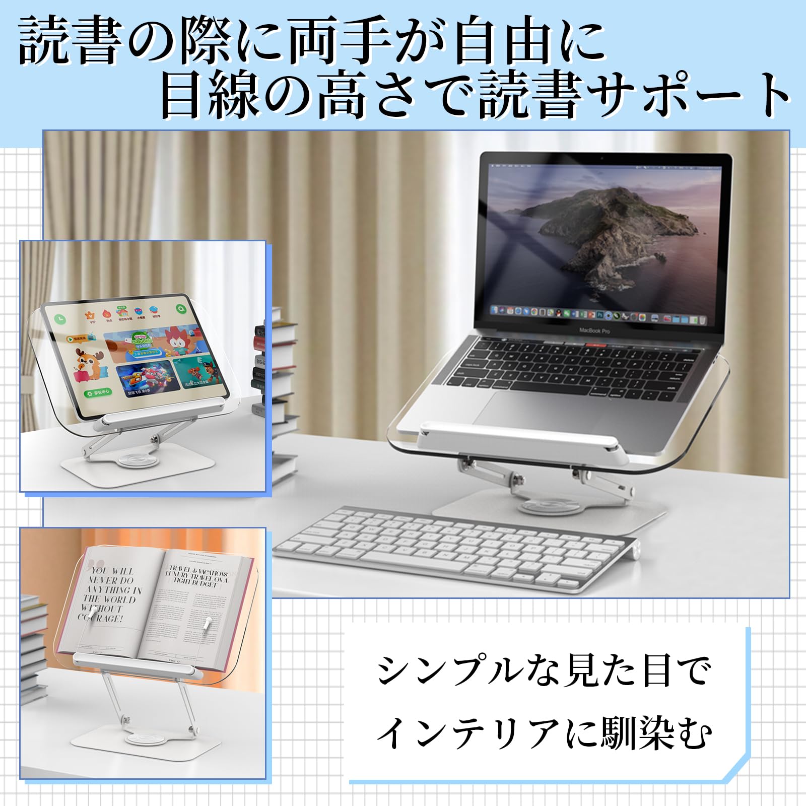 Wallfire ブックスタンド 卓上 書見台 読書台 パソコン台 譜面台 透明 ipadスタンド 本棚卓上 本立て 高さ・角度調整可能 折りたたみ式&持ち出し R22