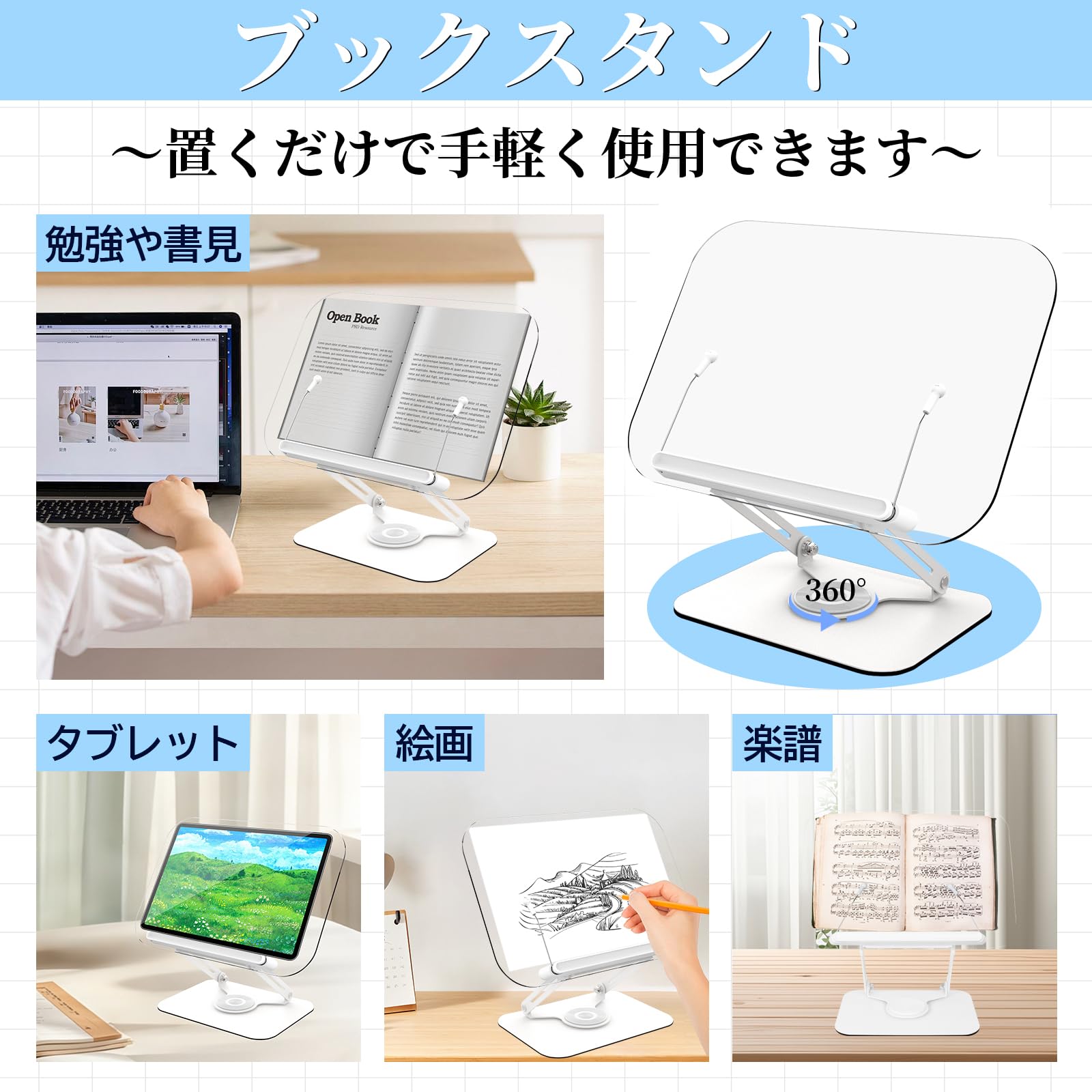 Athvcht 書見台 ブックスタンド 読書台 読書スタンド 卓上 折りたたみ式 アクリル製 ブックホルダー 360°回転 アルミ合金 角度/高さ無段階調節 安定性抜群 持ち運びやすい 勉強 本/ラップトップ/タブレット/楽譜/教科書用 (アクリル)