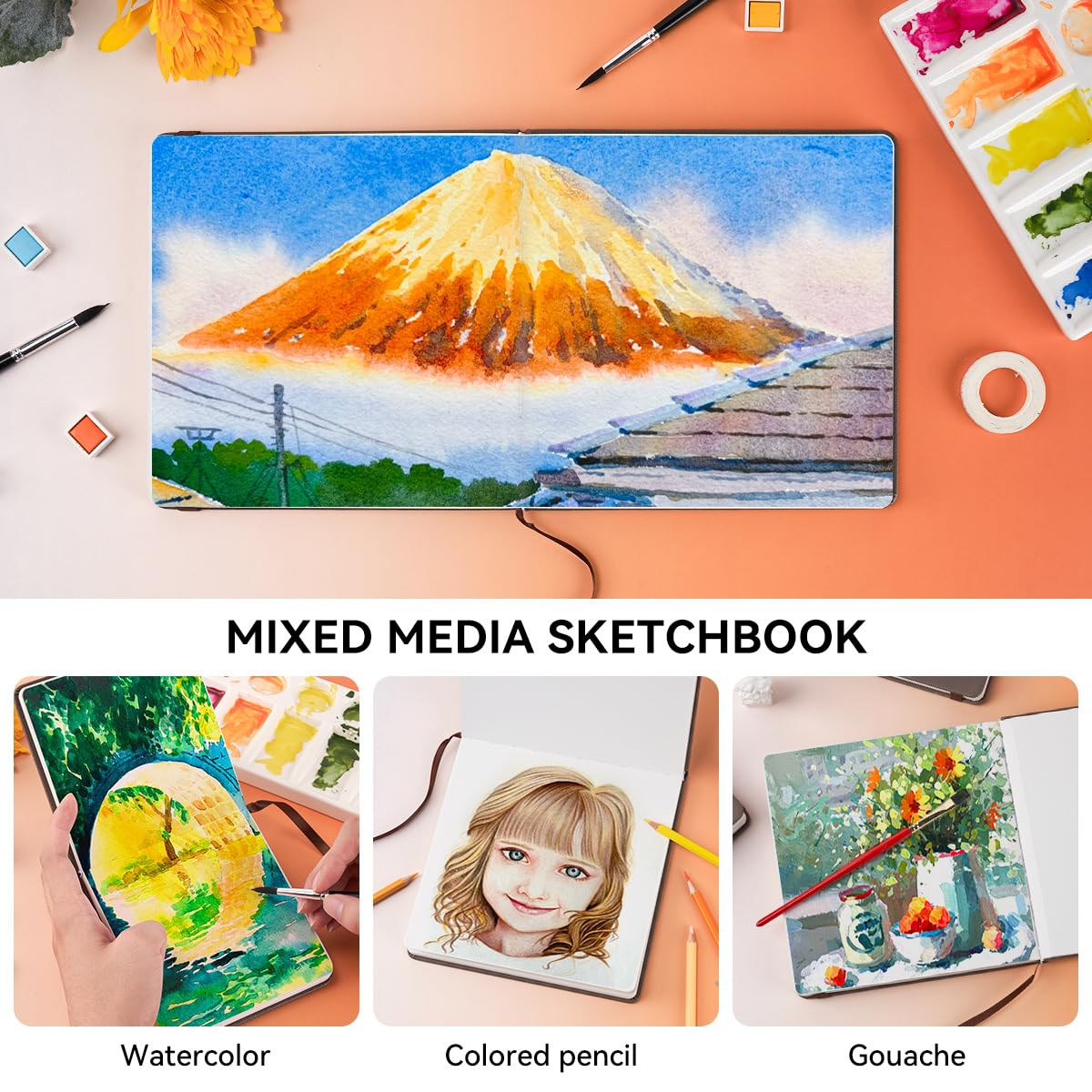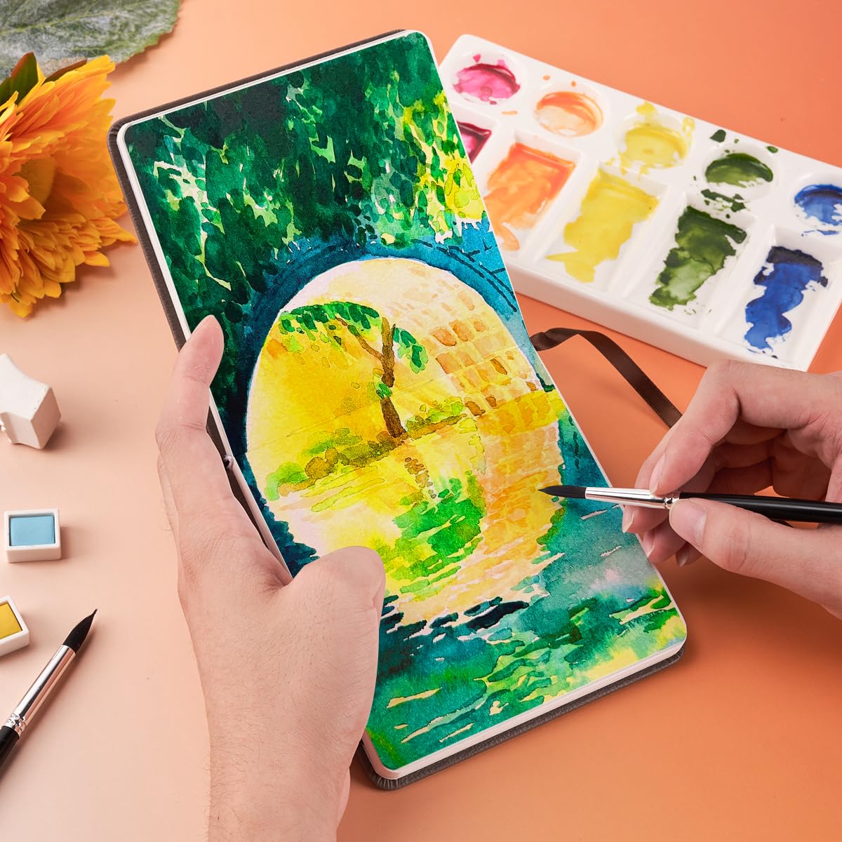 Arrtx 水彩画用紙 スケッチブック、100%コットン 水彩紙 アシッドフリー 300g ハードカバー 水彩ジャーナルノート、2冊セット 40枚 136mm x 98mm 細目 水彩絵具/水彩毛筆/水性ペン/水性色鉛筆など用