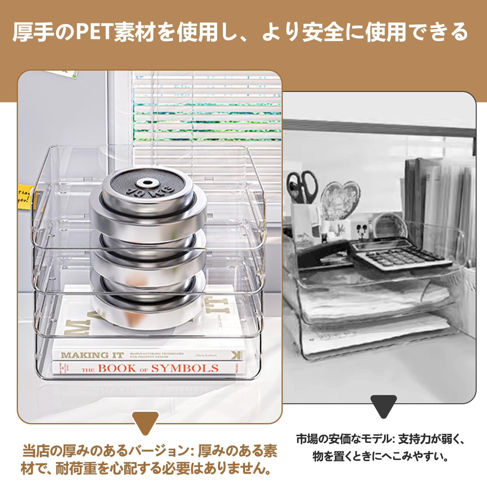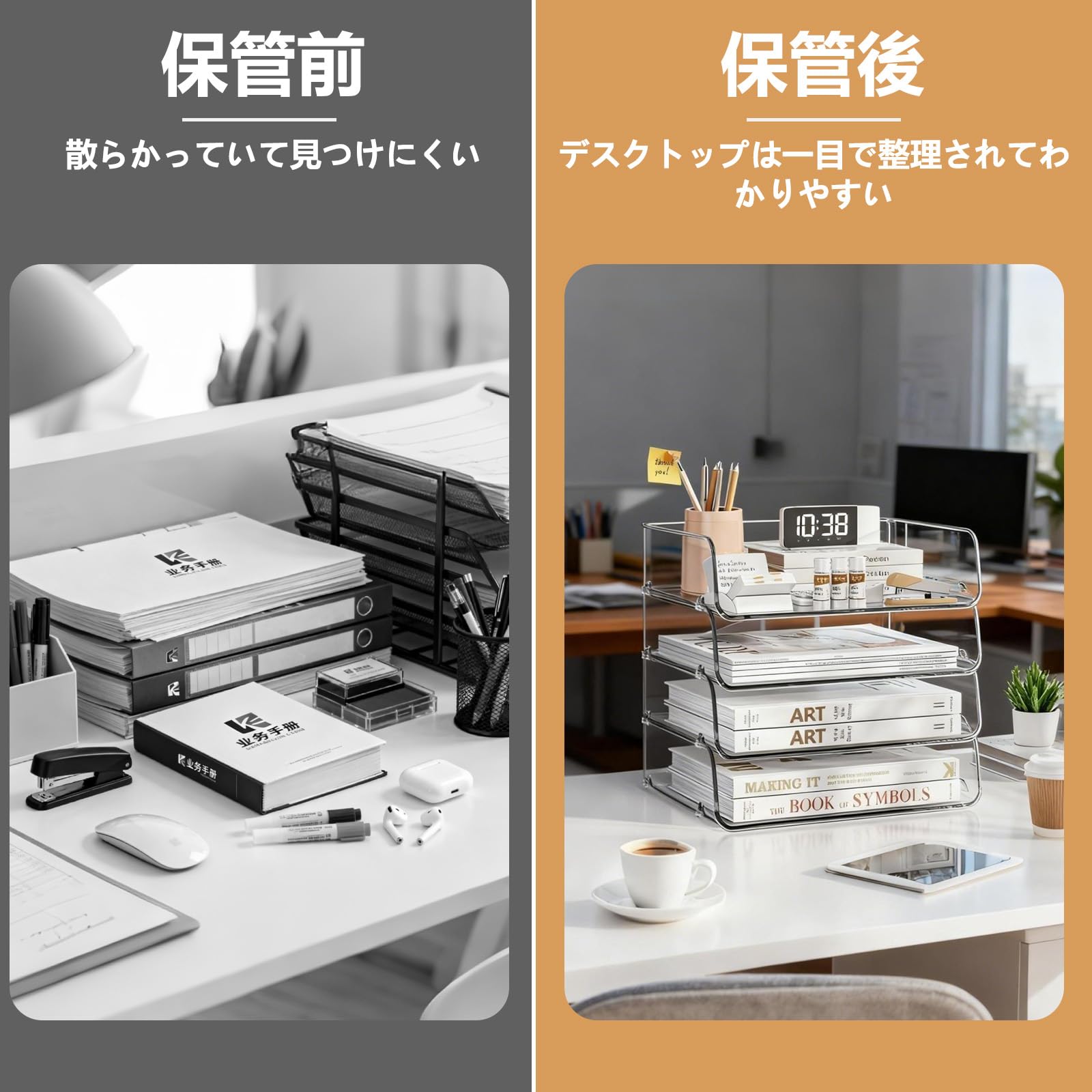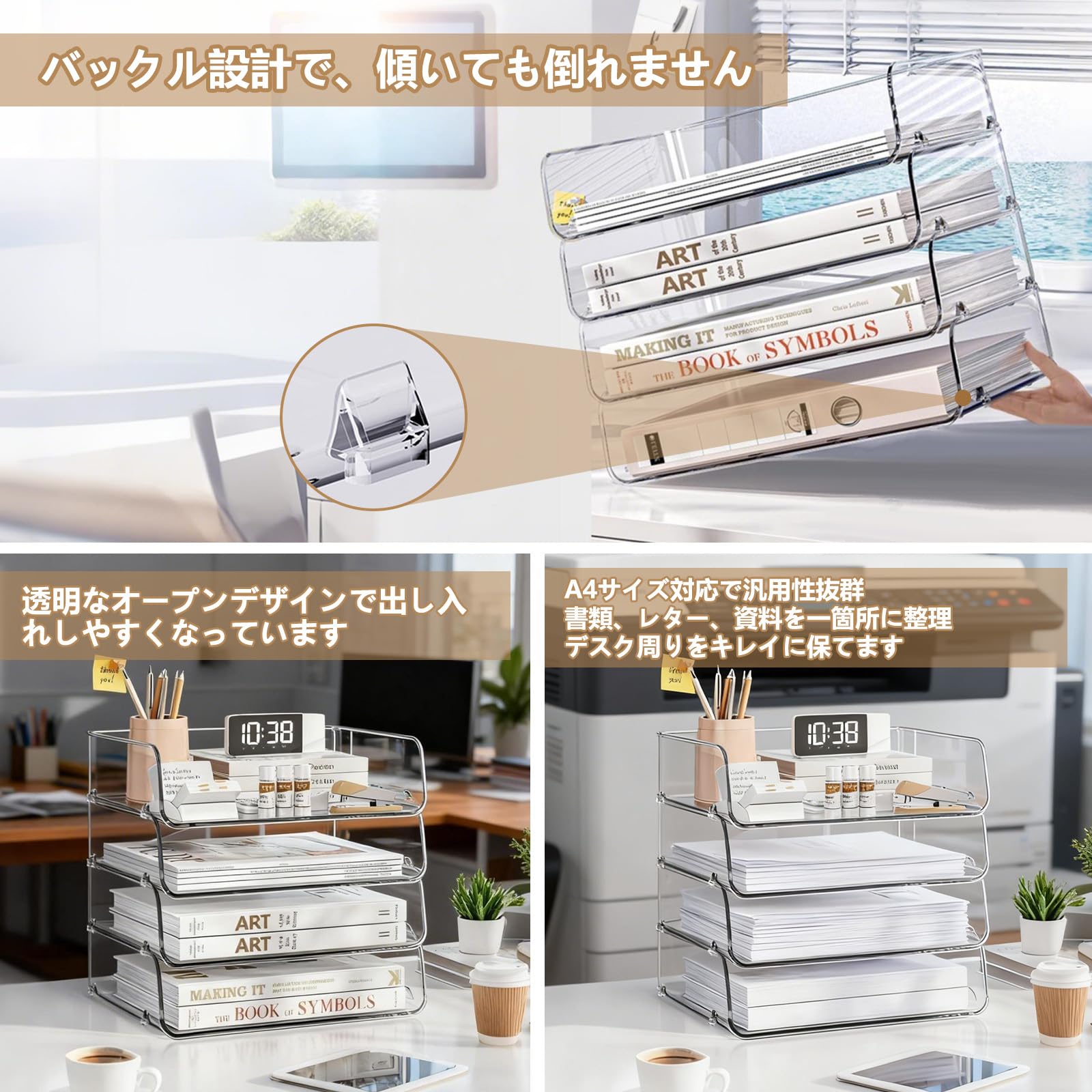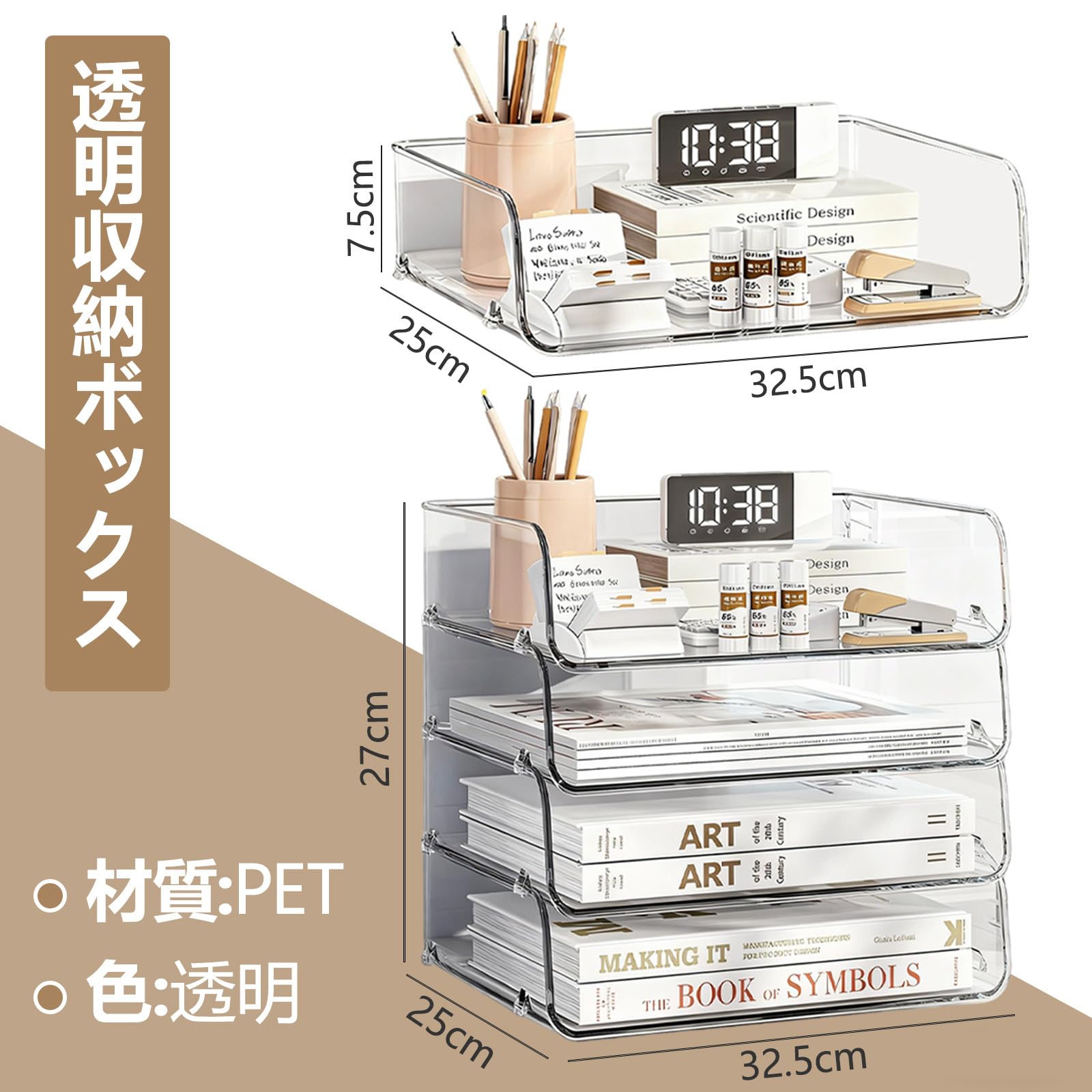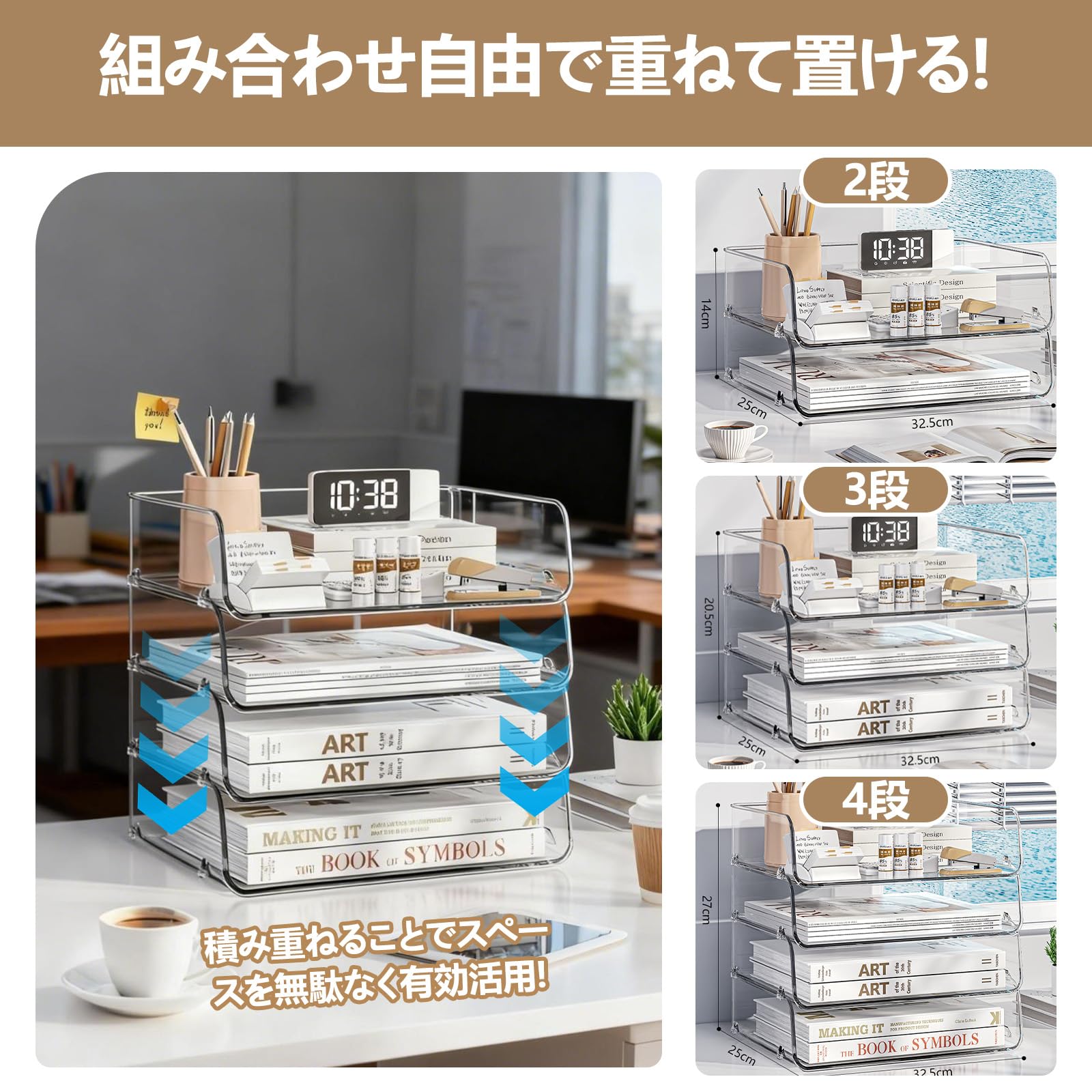 書類収納 レターケース 書類ケース 卓上ラック 文房具収納 小物入れボックス 卓上 おしゃれ A4 レタートレー 文房具収納 小物入れ ヨコ置4段書類トレー 積み重ね可能 新聞/雑誌/A4ファイル/フォルダー/書類入れ オフィス レタートレイ ブックなど収納 透明 32.5*25*27cm