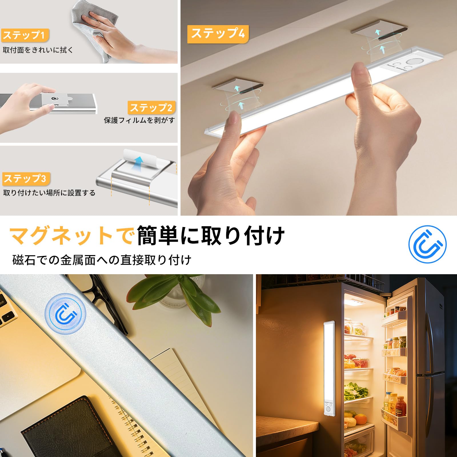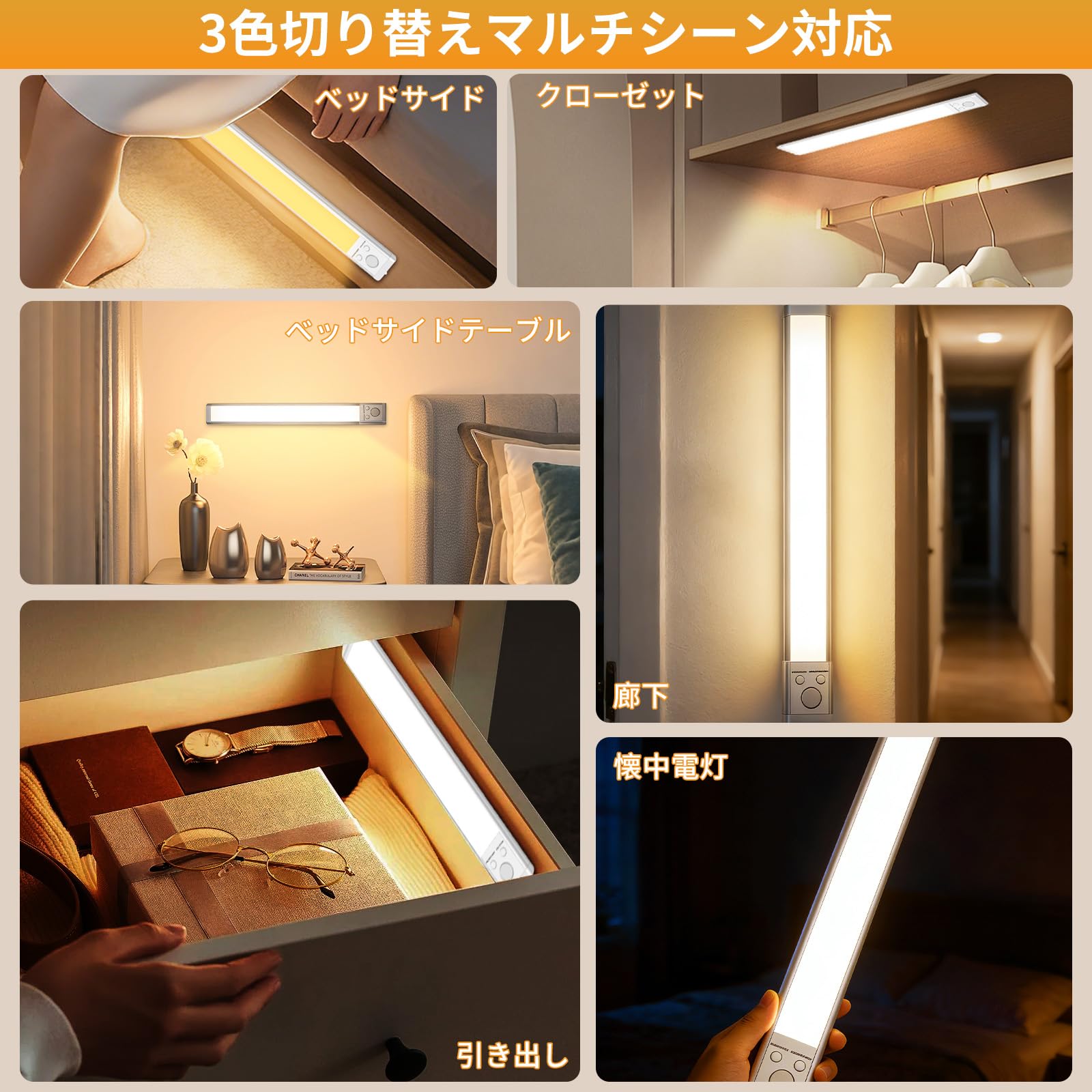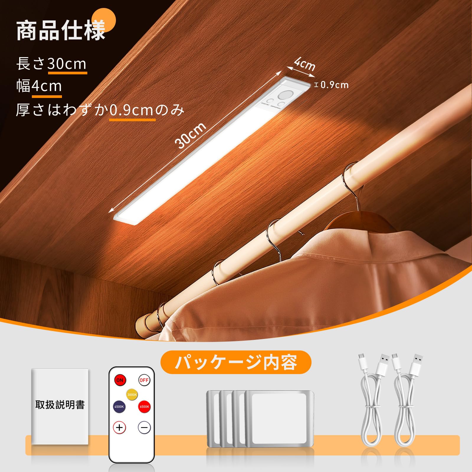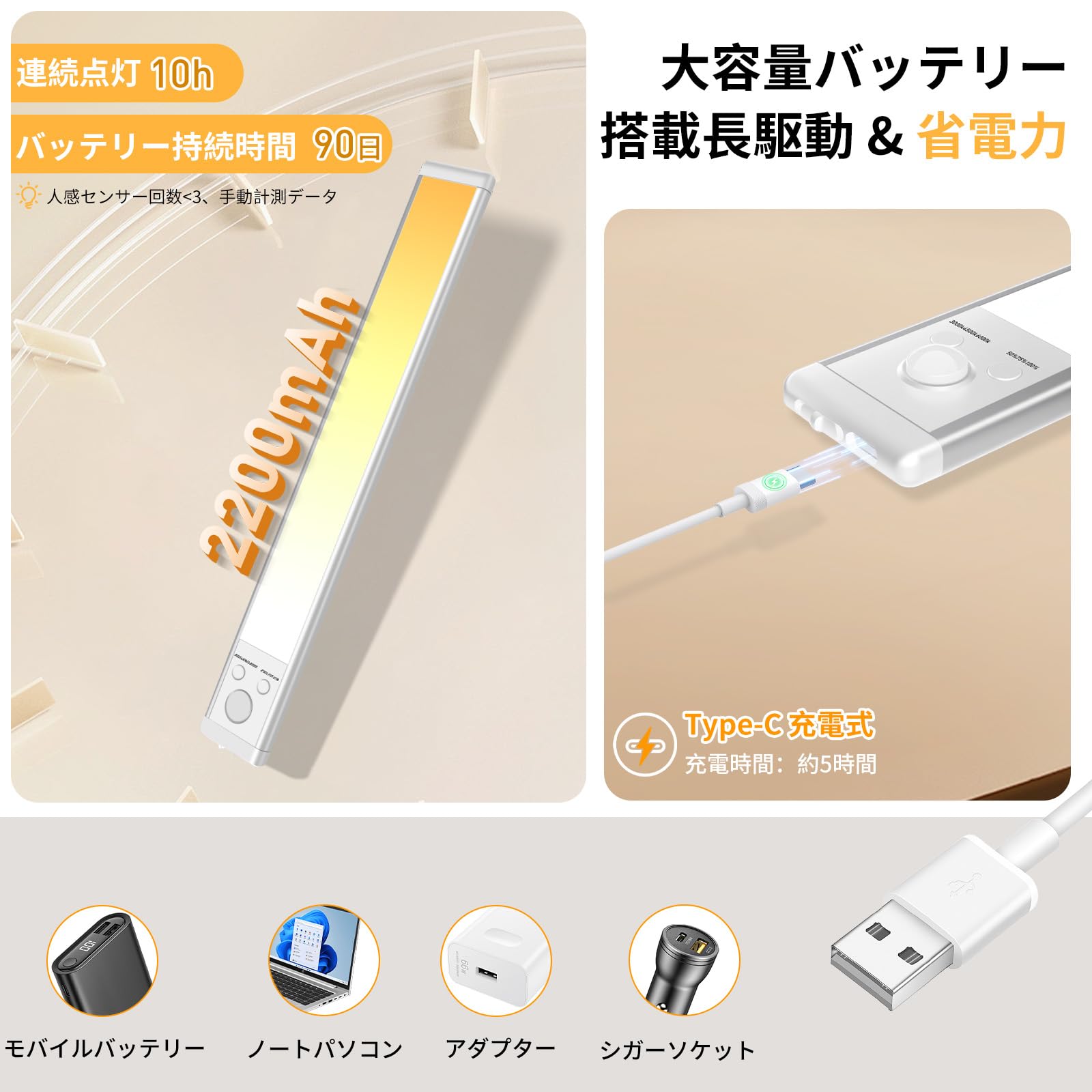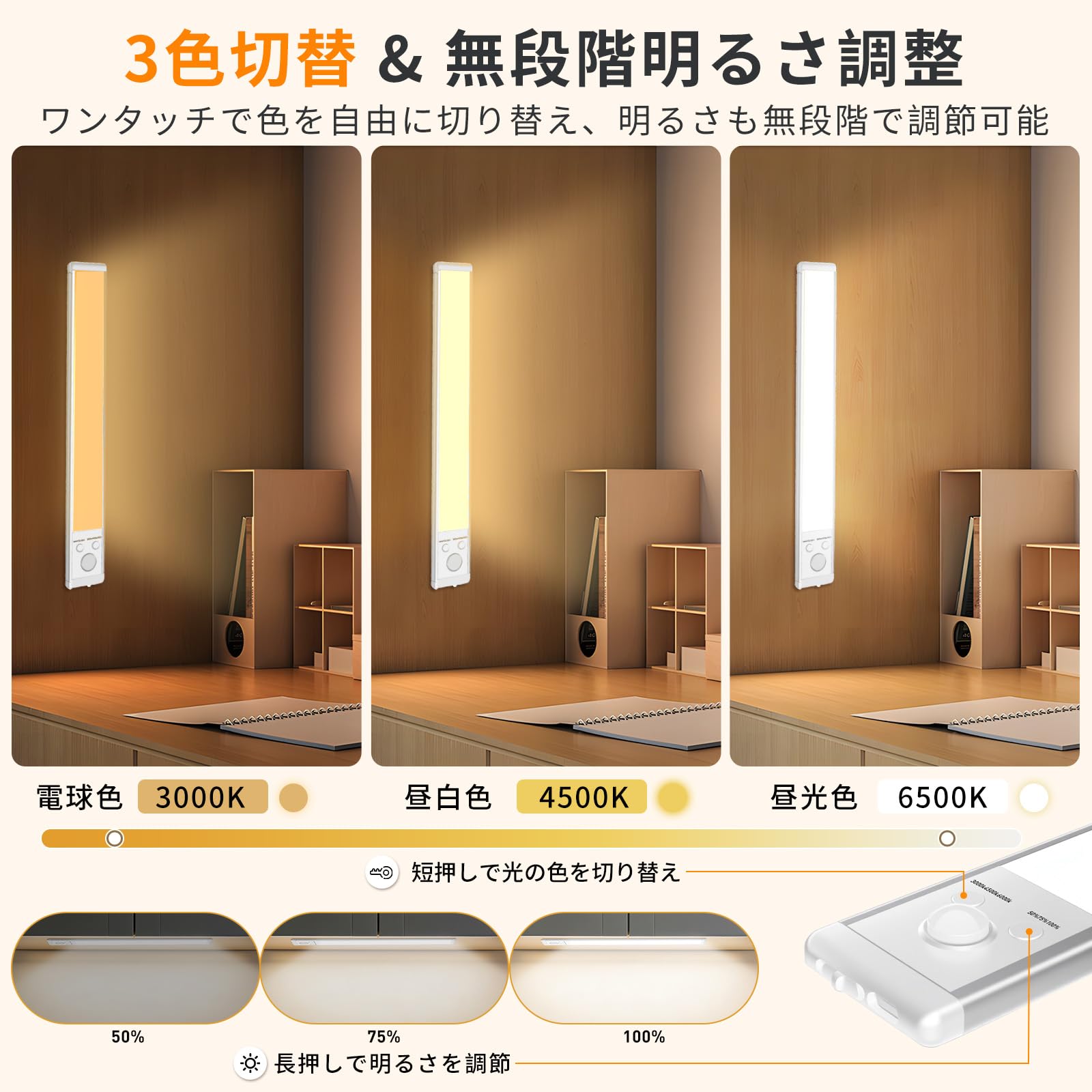 【連続点灯60時間可】人感センサーライト 充電式 室内 マグネット ライト ledライトバー LEDバーライト 読書灯 棚下ライト Type-C 充電式 無段階調光 キッチン用 屋内 寝室 廊下 階段 玄関 階段 3000K/4500K/6000K 電球色 昼白色 昼光色調整 30cm 2本