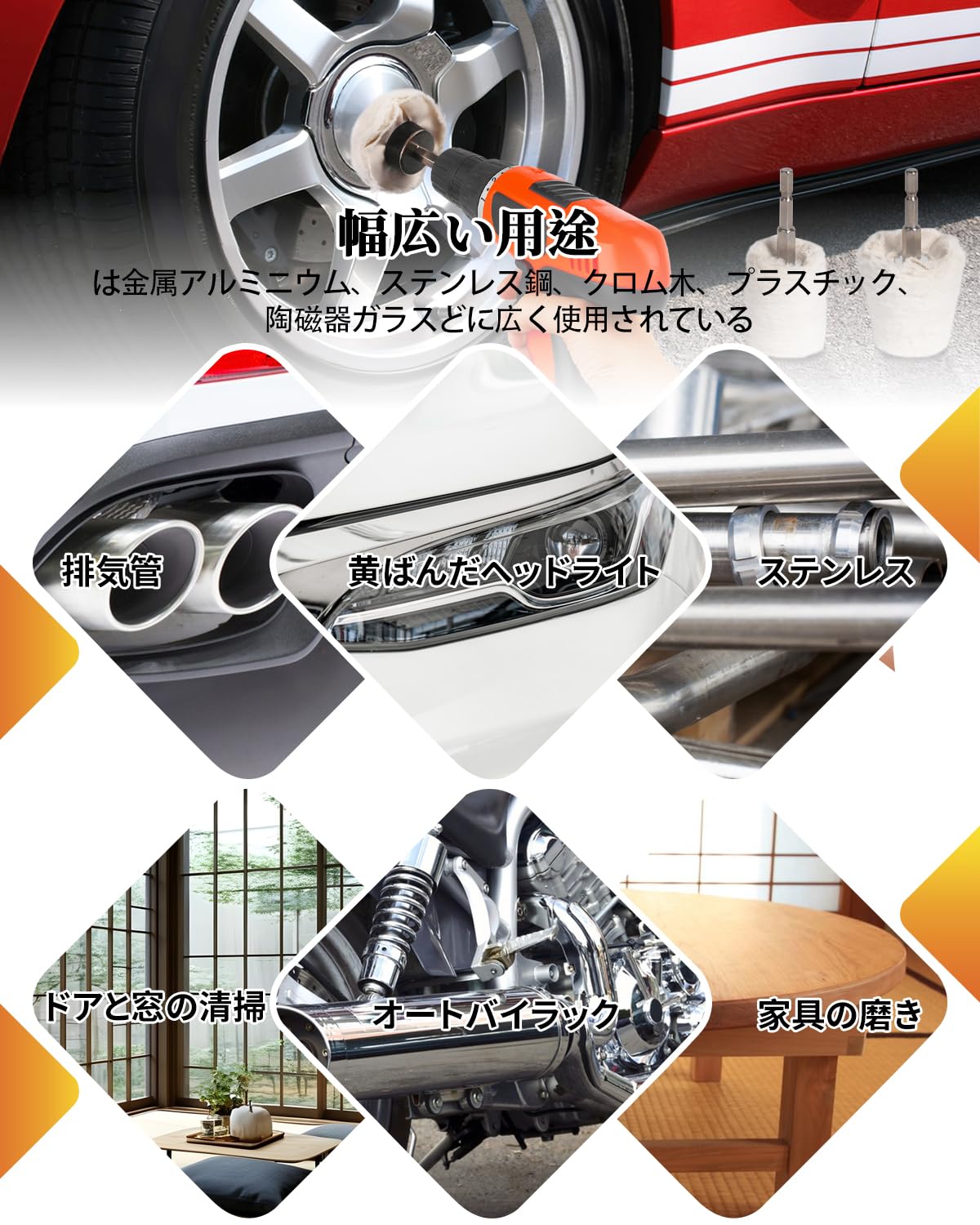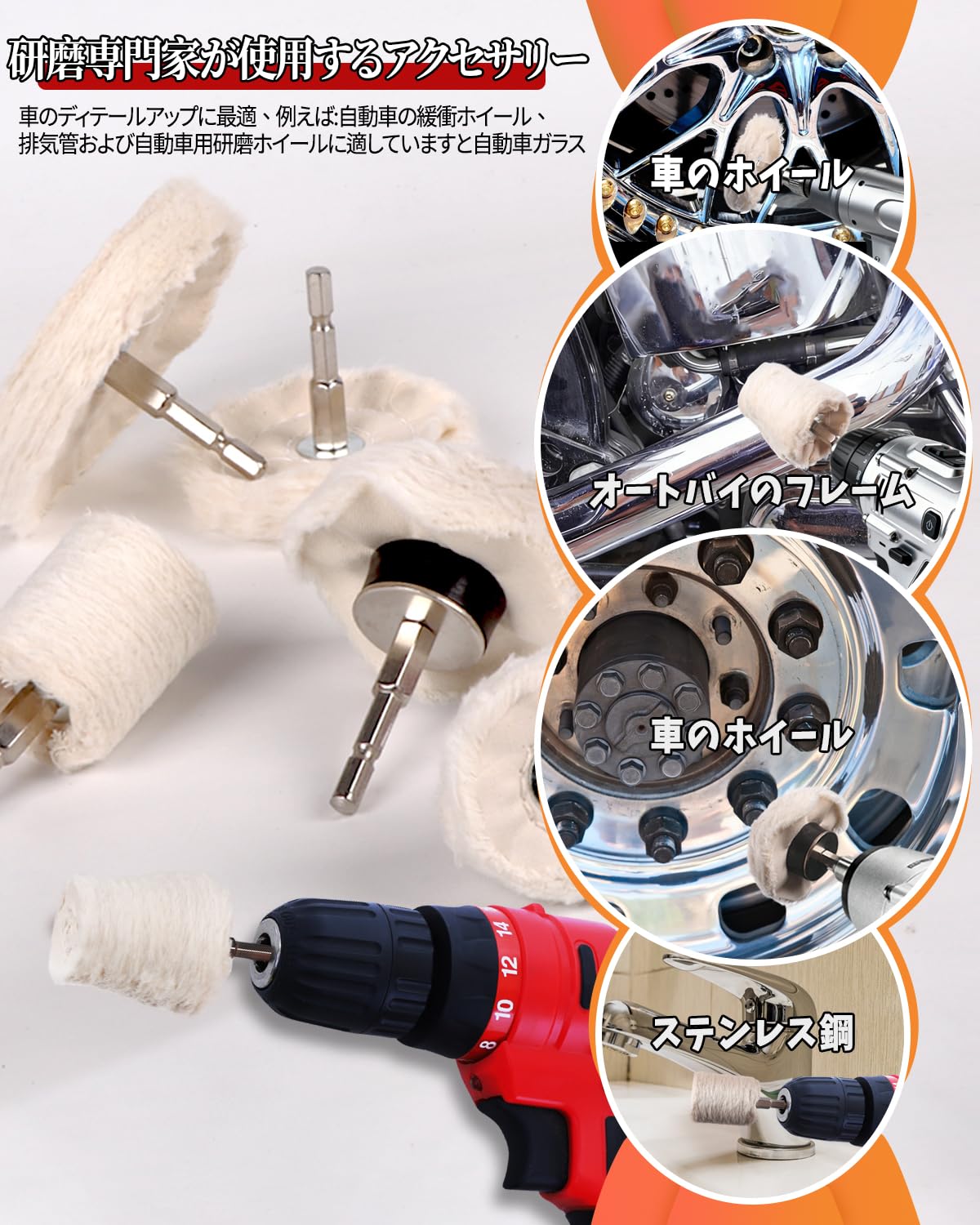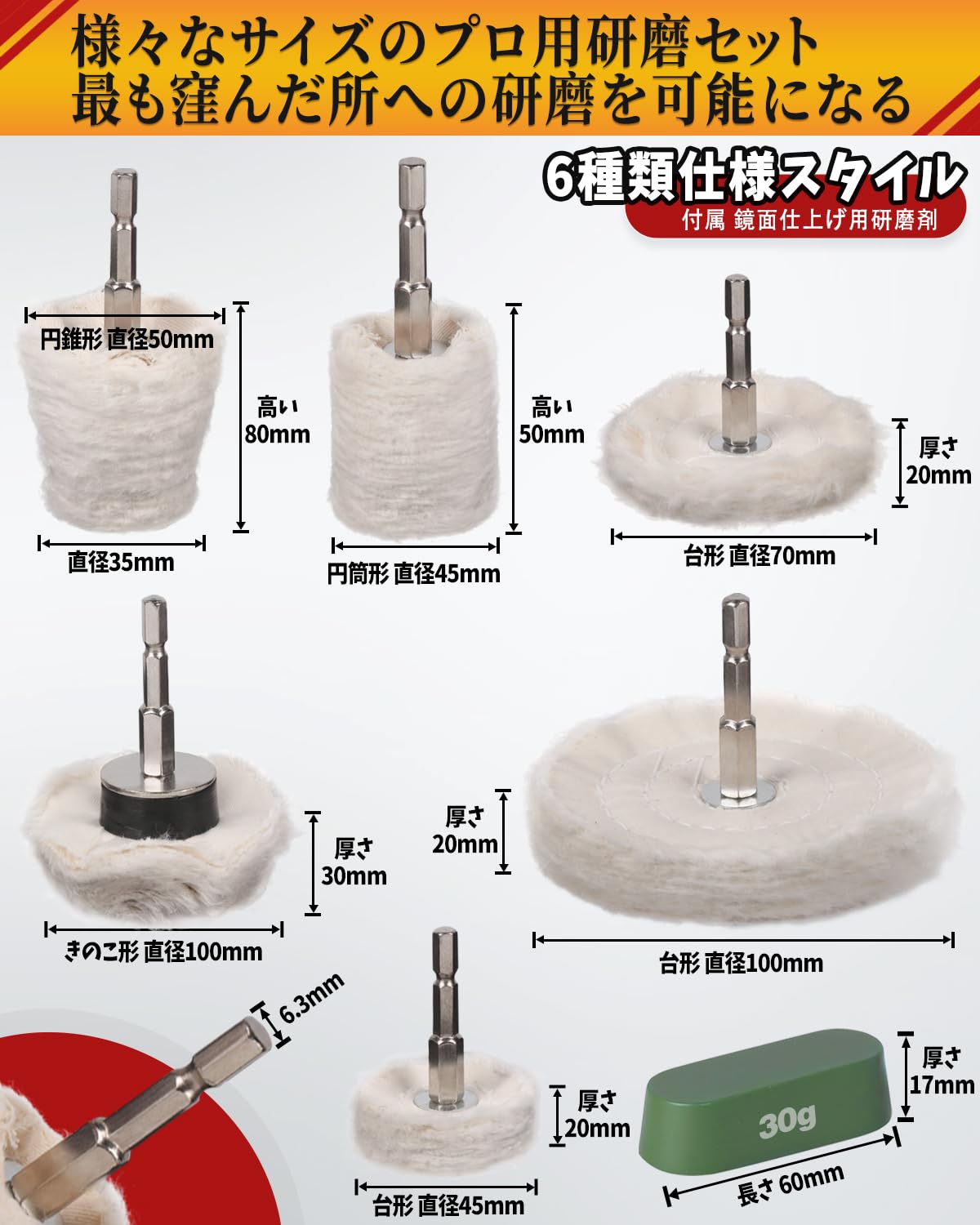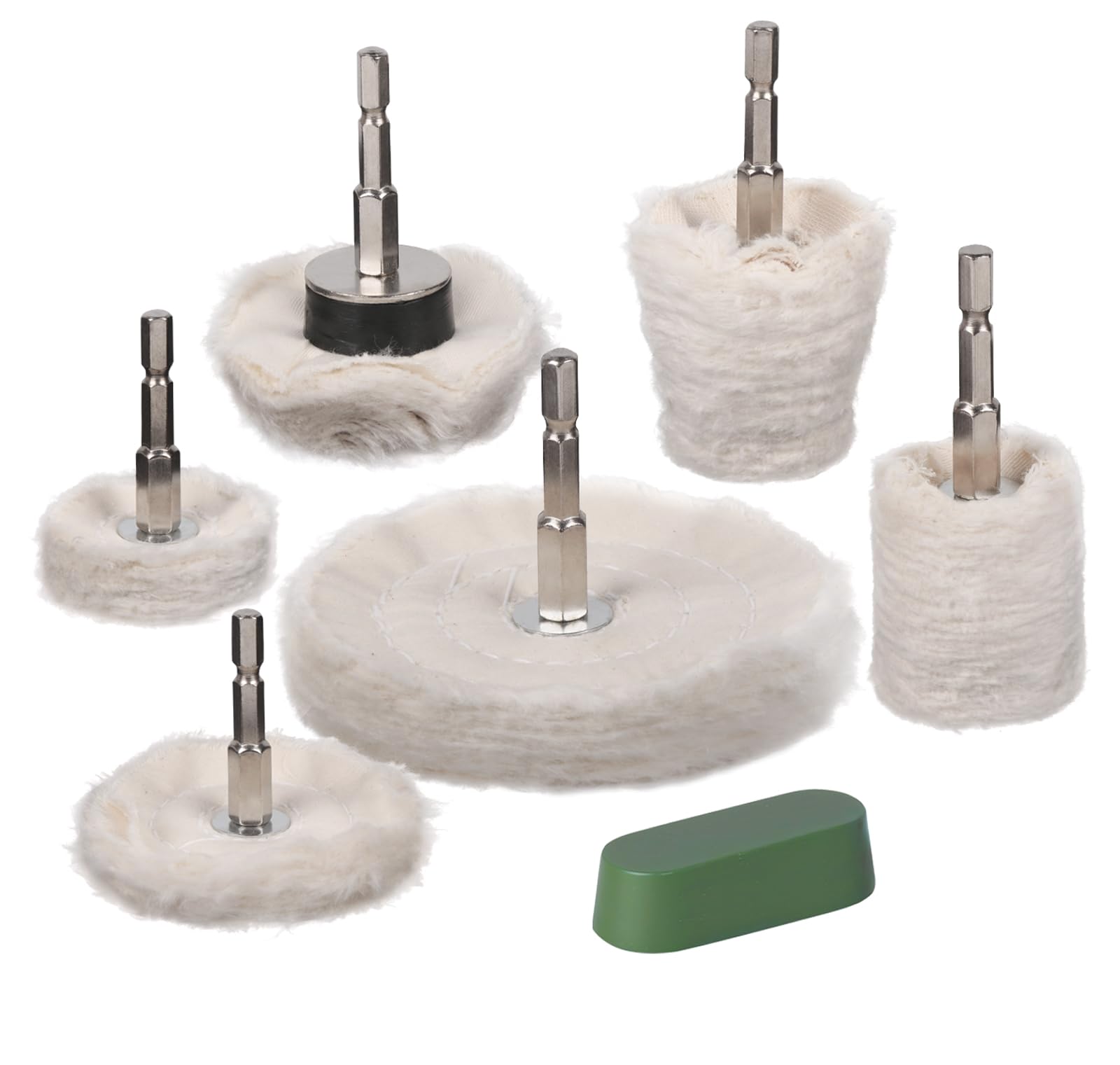 HWXINIE 電動ドライバー バフ 車磨き用 ウールバフ 7個セット 六角轴 付属 バフ用研磨剤,鏡面仕上げ 洗車用品 スケールを取り除く ガラス磨き