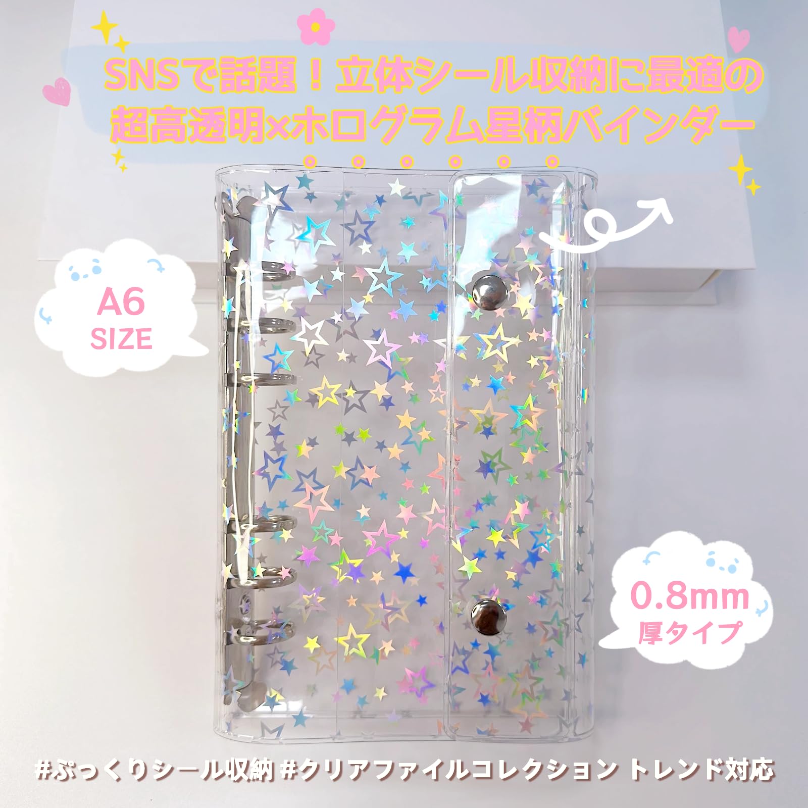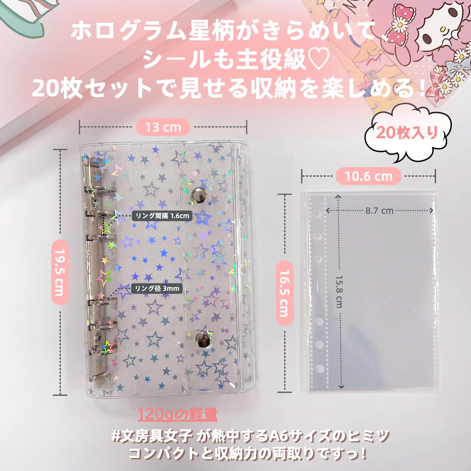 zenoco シール帳 透明バインダー 推し活グッズ A6 女の子 はがせる 6穴 シール収納 厚め 台紙付き(リフィル20枚セット・レーザースタータイプ)