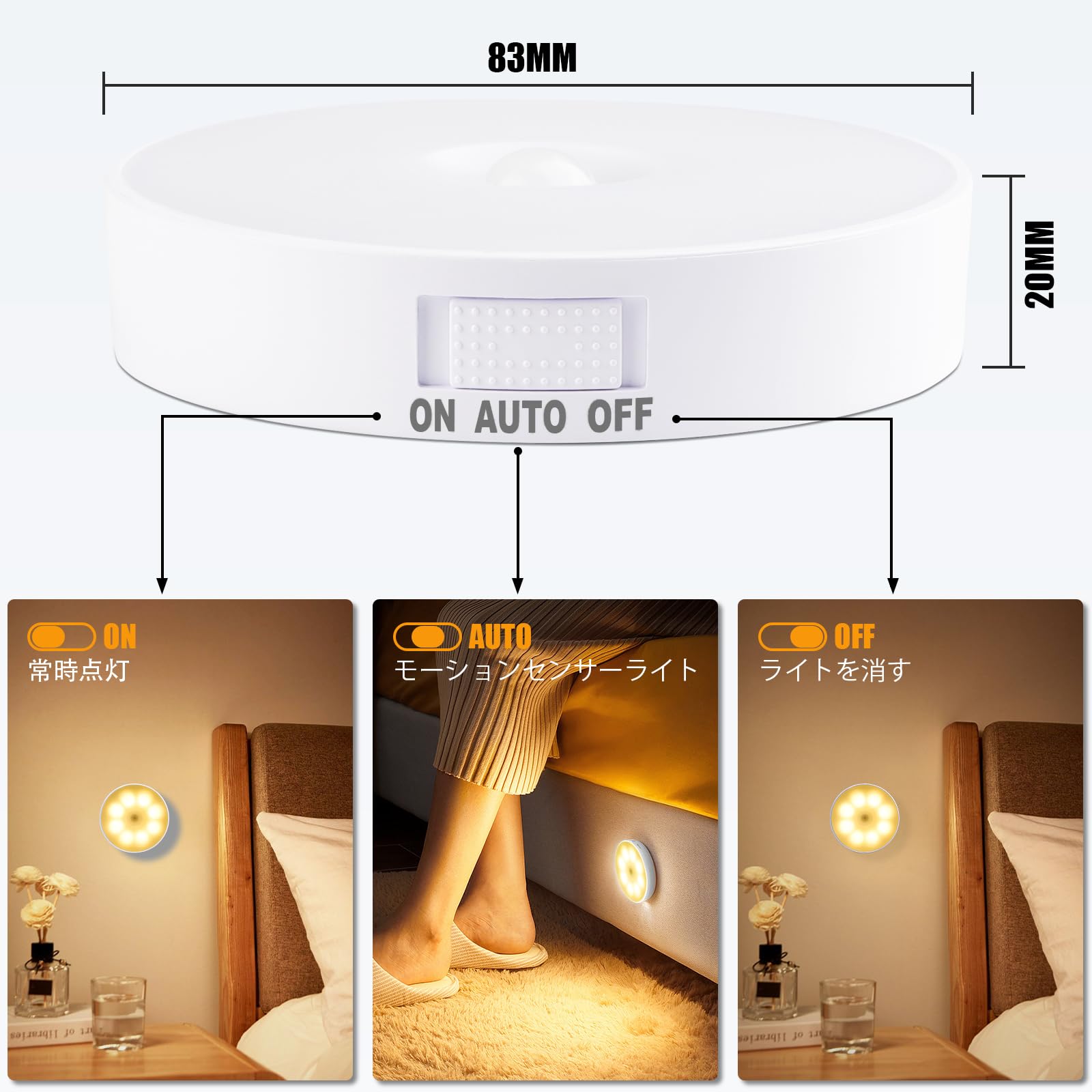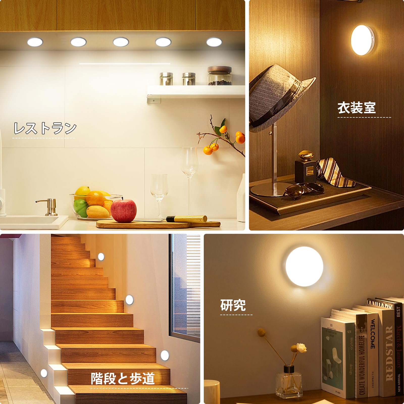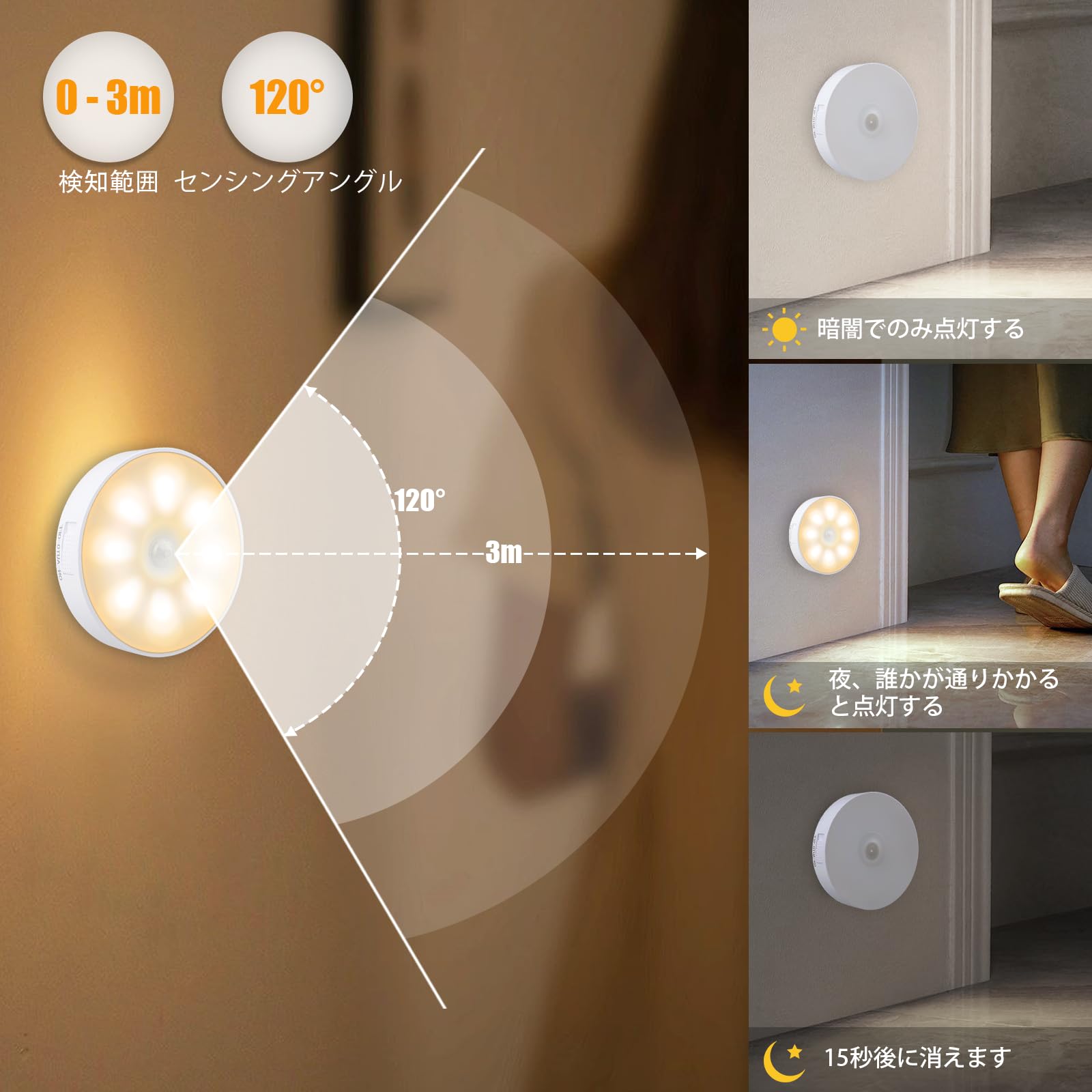 4pcs 小型LEDランプ人感センサーランプUSB充電式室内明暗センサーベッドヘッドライト ニュートラルホワイト6000K、電球色3000K、2色のライト、磁石両面テープ付き4パック