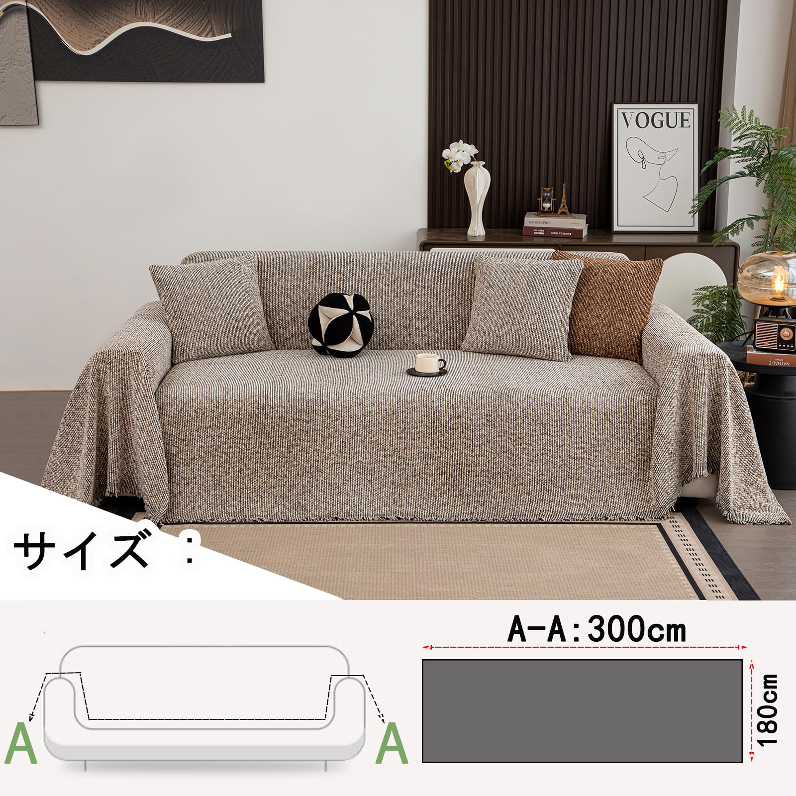 通気性・北欧風 マルチカバー 多彩な・色織り ソファカバー 幅約180cm,長さ約300cm, 厚手 ソファプロテクター フリンジ付き 高密度 長持ちソファスロー チェック柄 ふんわり肌ざわり・洗濯機対応 ソファーベッドカバー リビング用・ソファ用