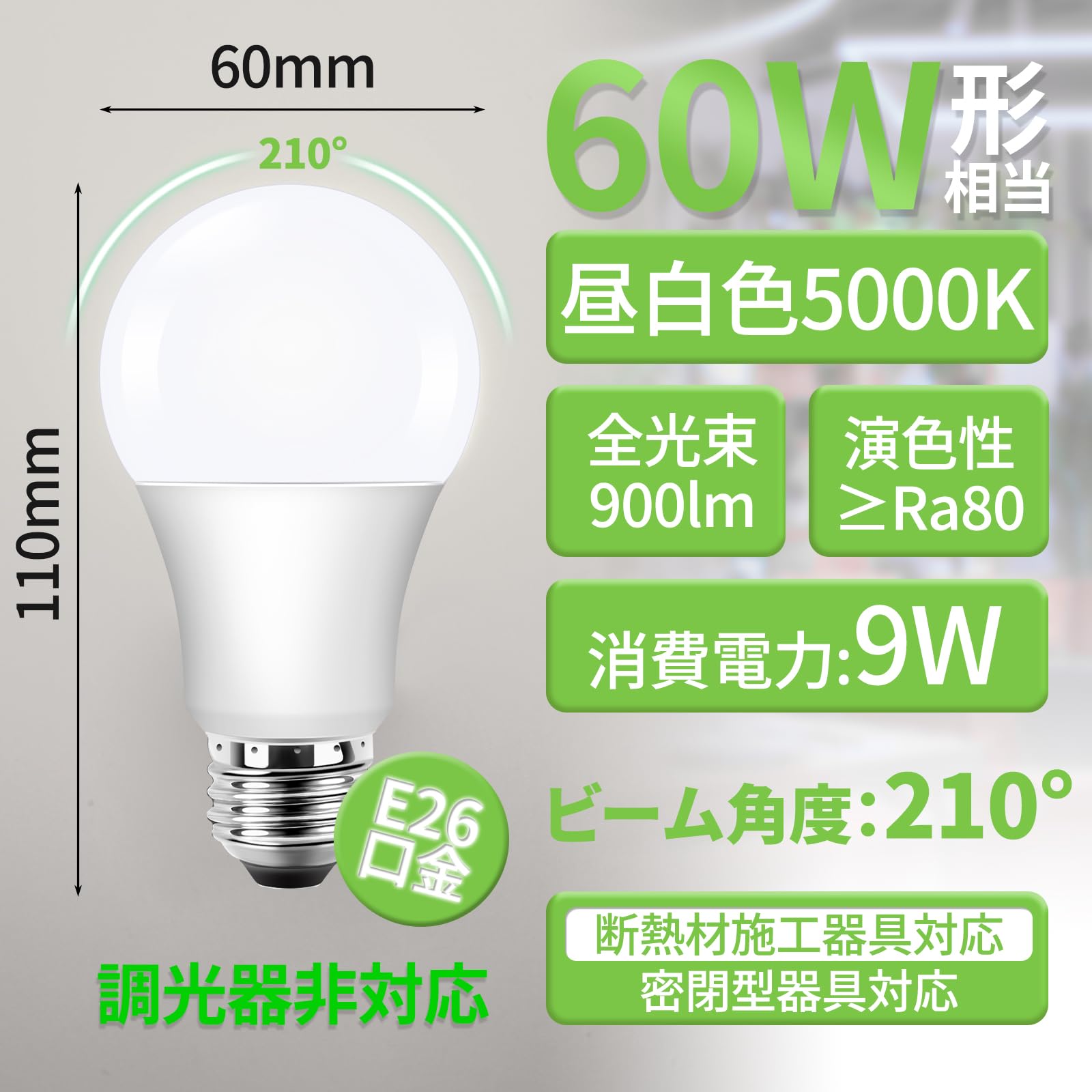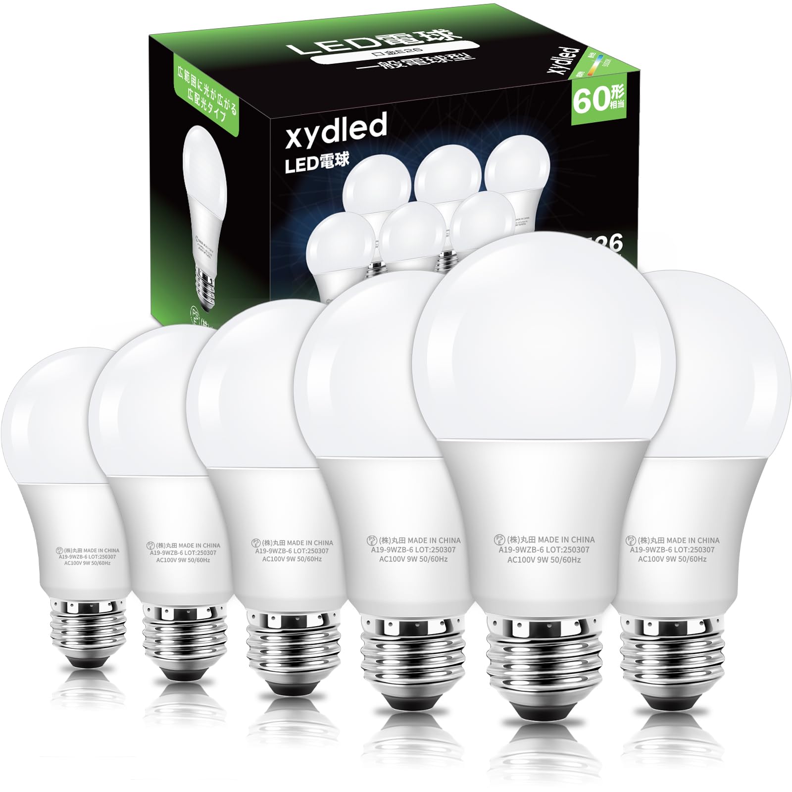 xydled LED電球 E26口金 60W形相当 9W 900lm 昼白色 5000K 広配光タイプ 高演色 省エネ 調光器非対応 密閉器具対応 断熱材器具対応 PSE認証済み 6個セット(昼白色)