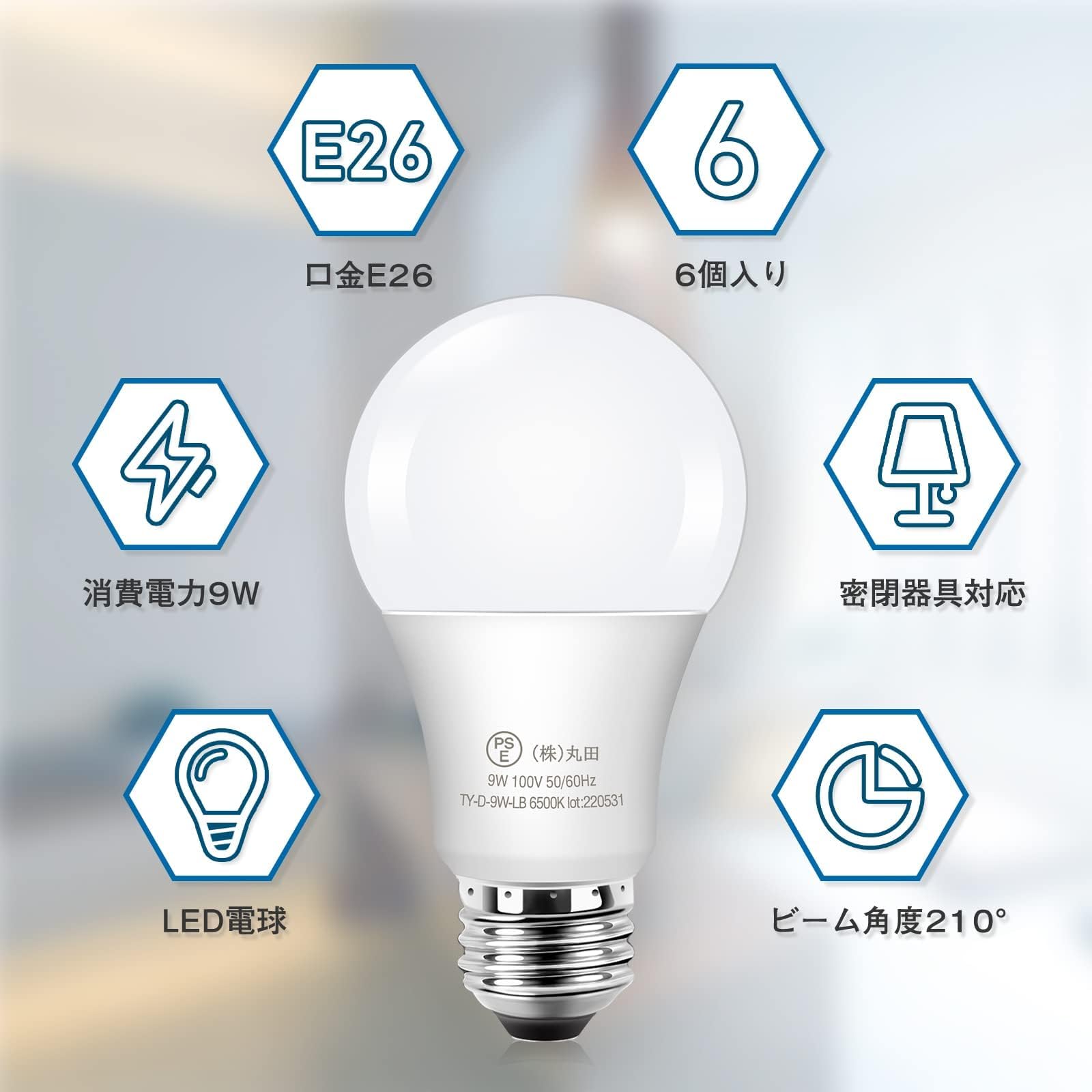 Tengyuan LED電球 E26口金 9W 60W形相当 昼光色 6500K 900lm 広配光 高輝度 高演色性 省エネ 密閉形器具対応 断熱材施工器具対応 調光不可 【6個入り】