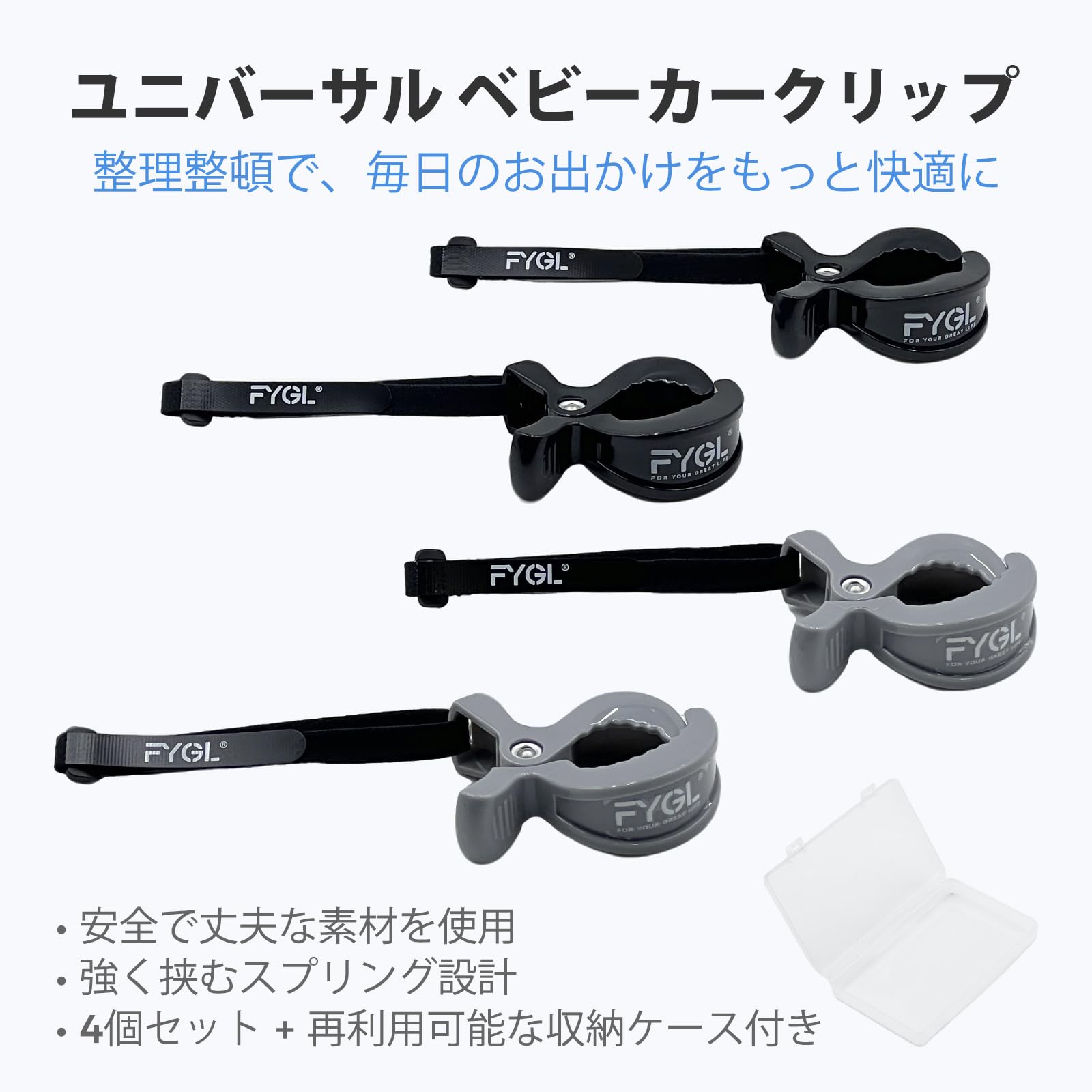 FYGL ブランケットクリップ 4個セット 伸縮ベルト付き 収納ケース入り ベビーカー ベビーベッド 毛布 タオル固定 マルチクリップ - グレー