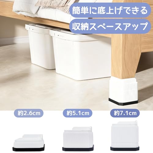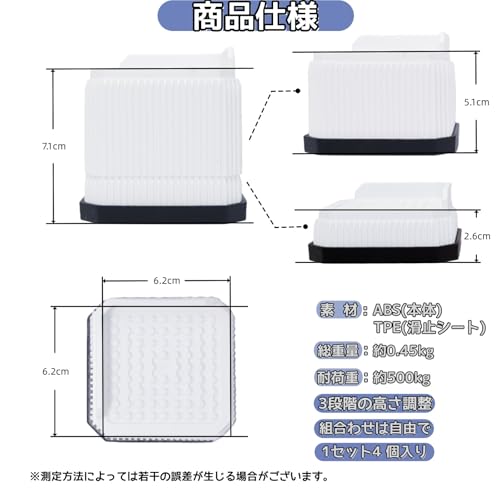 「ちょうどいい高さ」が、暮らしの質を変える。洗濯機の振動音、家具の下の掃除の手間、合わない高さによる疲れ…。これらの日常の不便を、3つの選択肢で解消する高機能かさ上げ台です。単なる「台」ではなく、ご自宅の環境に合わせてカスタマイズできるスマートな家具サポーターとしてお役立ていただけます。◎ 製品仕様材質: 本体 / 高強度ABS樹脂、防滑パッド / 柔軟TPEセット内容: 薄型かさ上げ台 (2.4cm) x 4、厚型かさ上げ台 (4.9cm) x 4、TPE防振滑り止めパッド (0.8cm) x 4カラー: ブラック、ホワイト総重量: 約450g◎ 高さ調節の構成 (1セットあたり)A. 低め調整 (2.6cm): 薄型本体 + TPEパッド → 洗濯機の微調整、軽い家具に。B. 標準調整 (5.1cm): 厚型本体 + TPEパッド → 冷蔵庫、こたつ、一般的なベッドの高さ調整に最適。C. 高め調整 (7.1cm): 薄型本体 + 厚型本体 + TPEパッド → 大きな排水ホーススペースの確保、ベッド下の大容量収納を実現。◎ 私たちがこだわった、5つの安心正確な高さ設定: 適当な積み重ねではなく、明確な3パターンを設計。お客様が迷うことなく、目的に合った高さを選べます。確かな防音対策: 全ての組み合わせにTPEパッドを標準装備。振動源と家具・床の両方から音を遮断します。全面保護設計: 家具を固定し、床を守る。賃貸住宅にお住まいの方にも自信を持っておすすめできます。軽量で頑丈: ABSの特性を活かし、取り回しのしやすさと長期使用に耐える強度を両立させました。汎用性の高さ: リビング、寝室、キッチン、洗面所…家中のほぼすべての「脚があるもの」に対応可能です。工具不要、ただ置くだけの簡単設置。この小さな工夫が、毎日の生活に大きな快適さをもたらします。