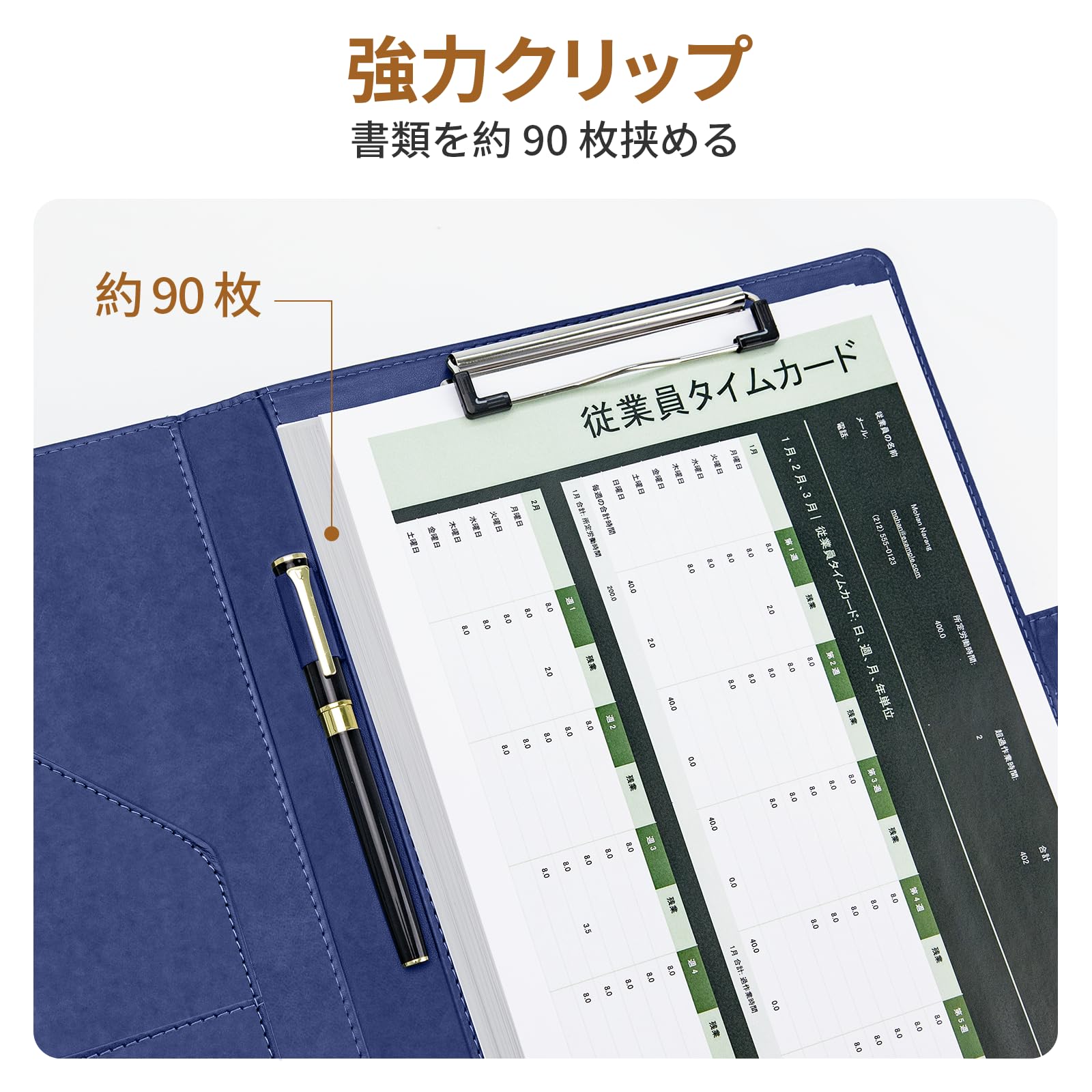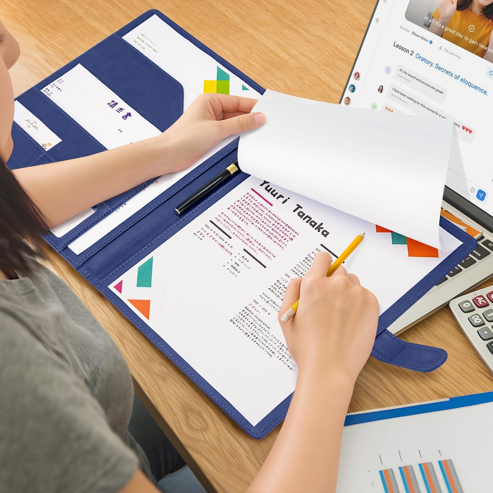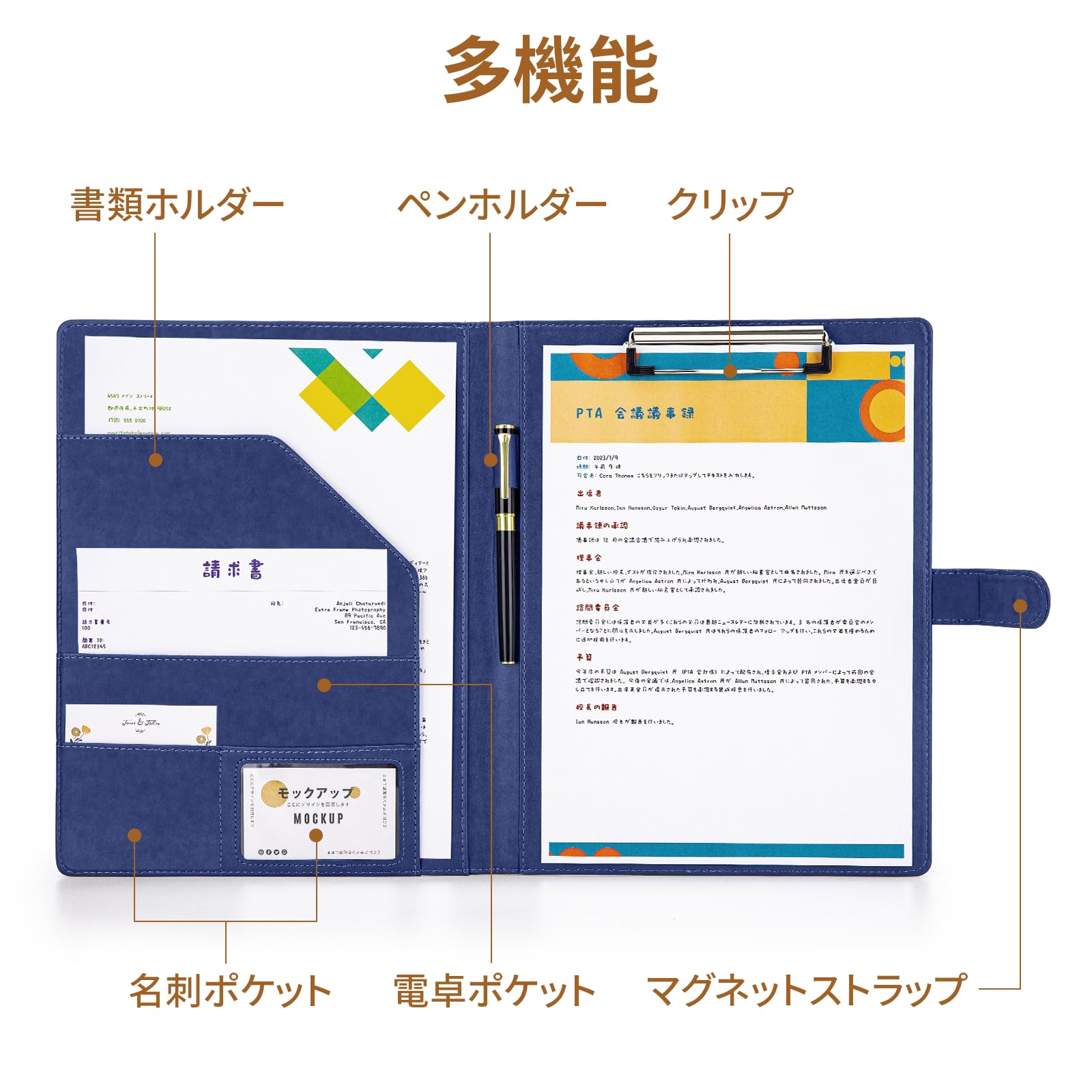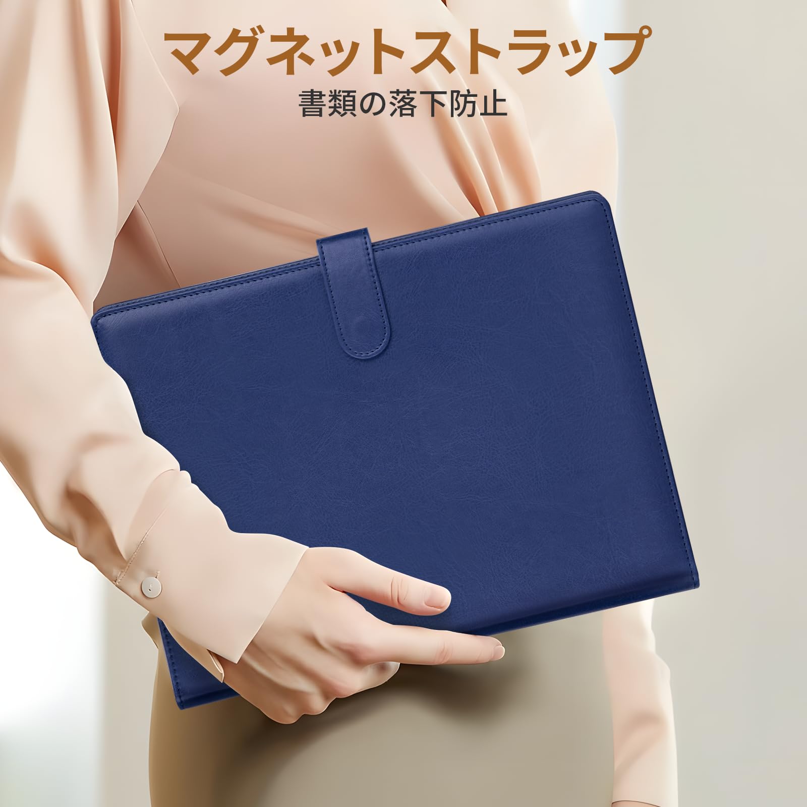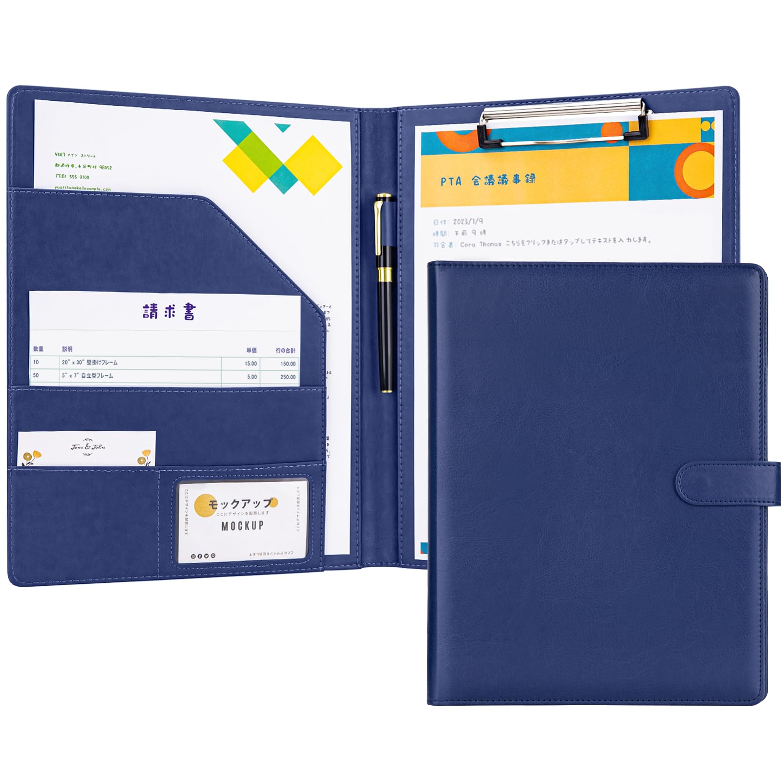 OWLKELA バインダー A4 クリップボード 2つ折り PUレザー クリップファイル 多機能 クリップバインダー 折りたたみ ペンホルダー付き 名刺入れ メモ帳付き ポケット付き プレゼント 贈り物 ギフト オフィス用品 事務用品 (ネービーブルー)