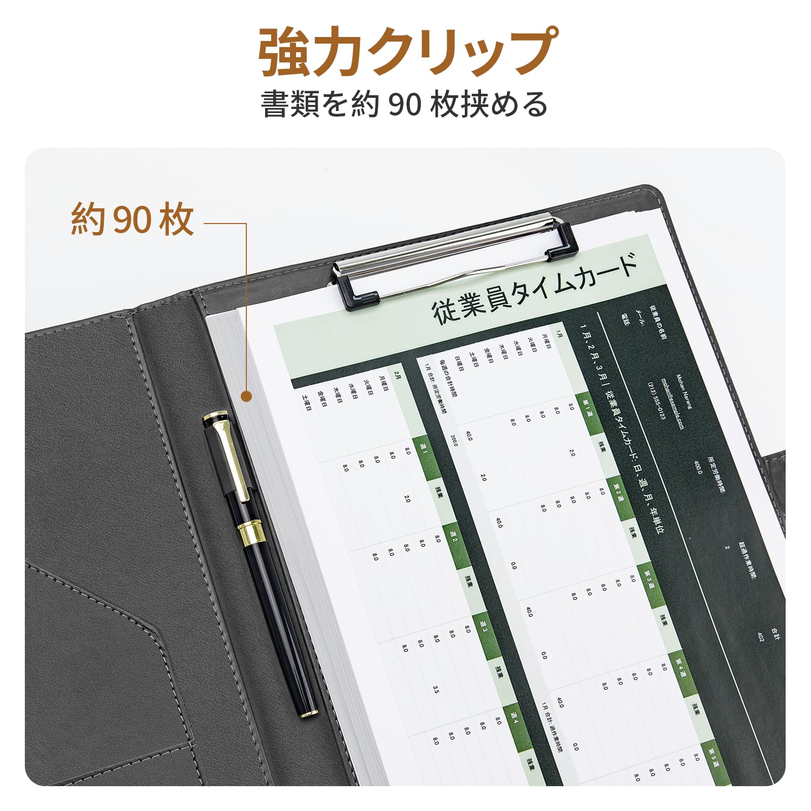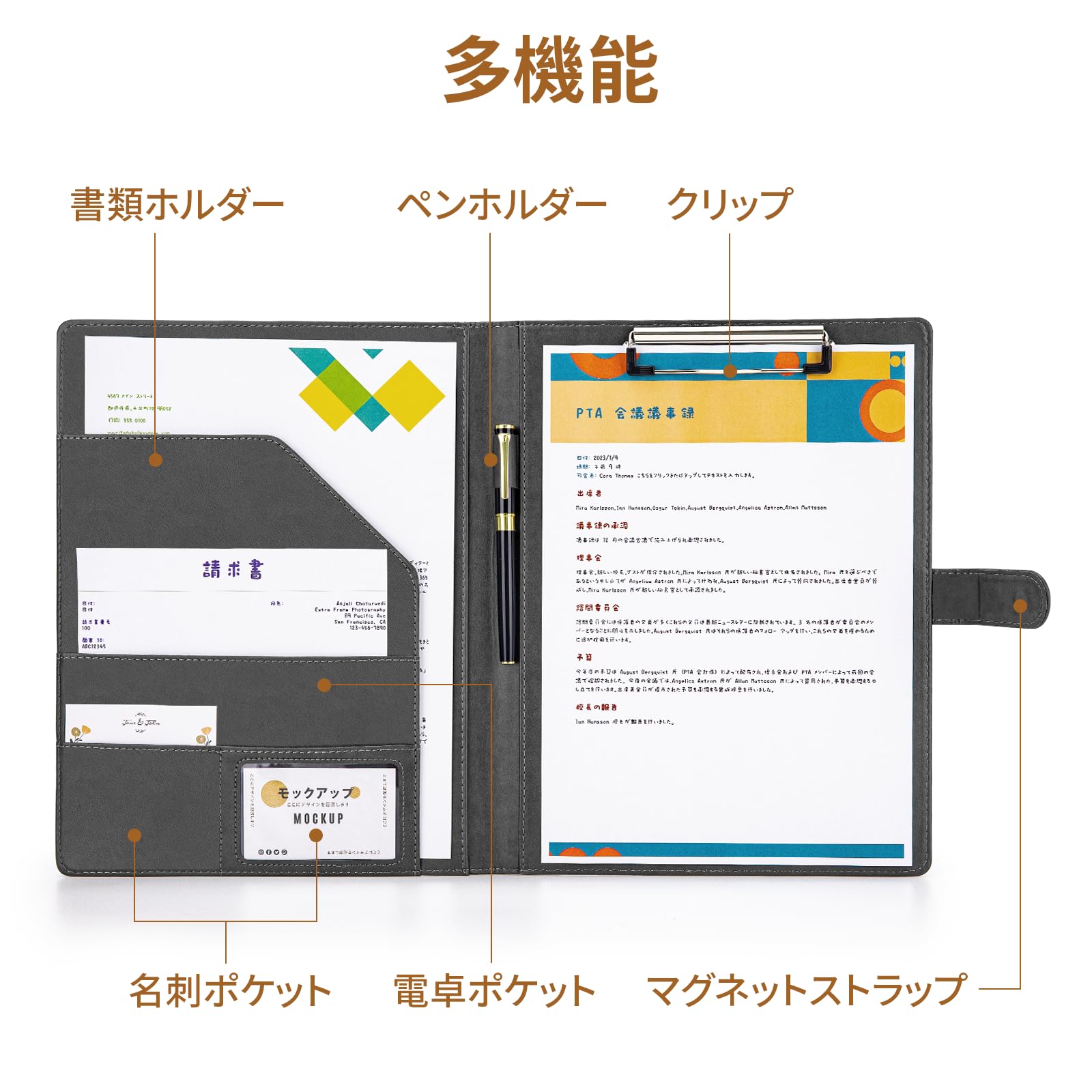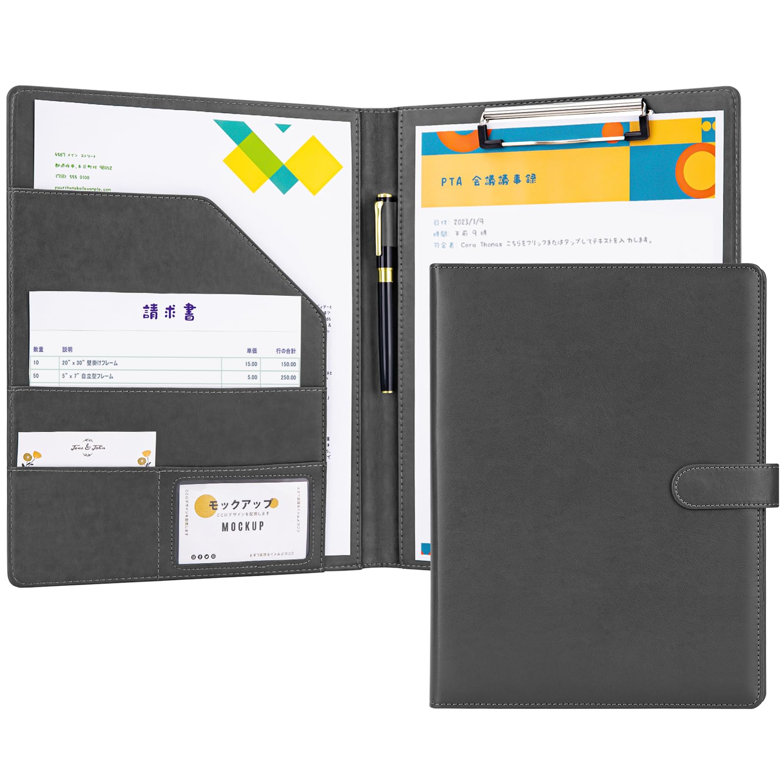 OWLKELA バインダー A4 クリップボード 2つ折り PUレザー クリップファイル 多機能 クリップバインダー 折りたたみ ペンホルダー付き 名刺入れ メモ帳付き ポケット付き プレゼント 贈り物 ギフト オフィス用品 事務用品 (グレー)
