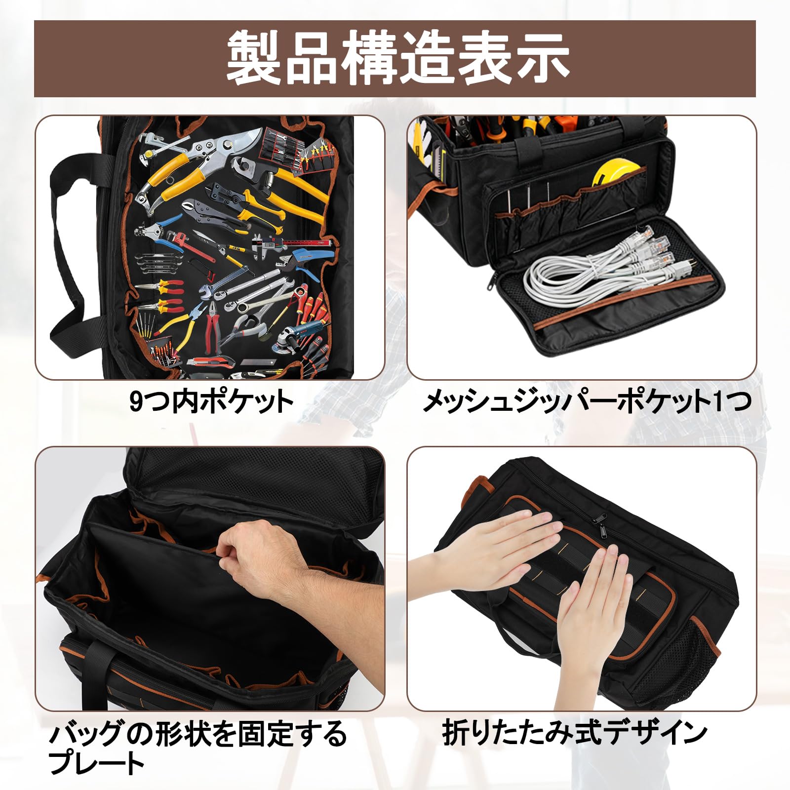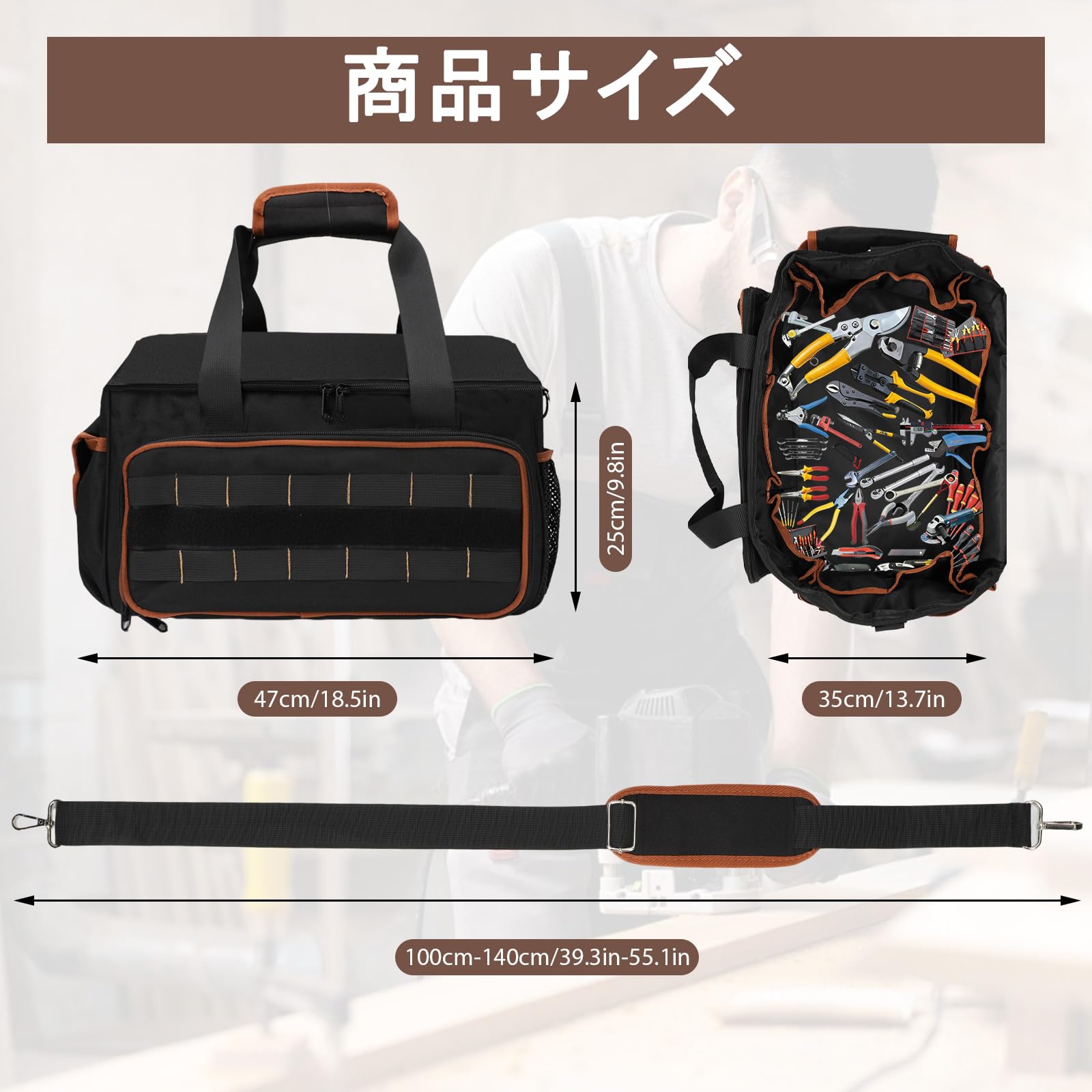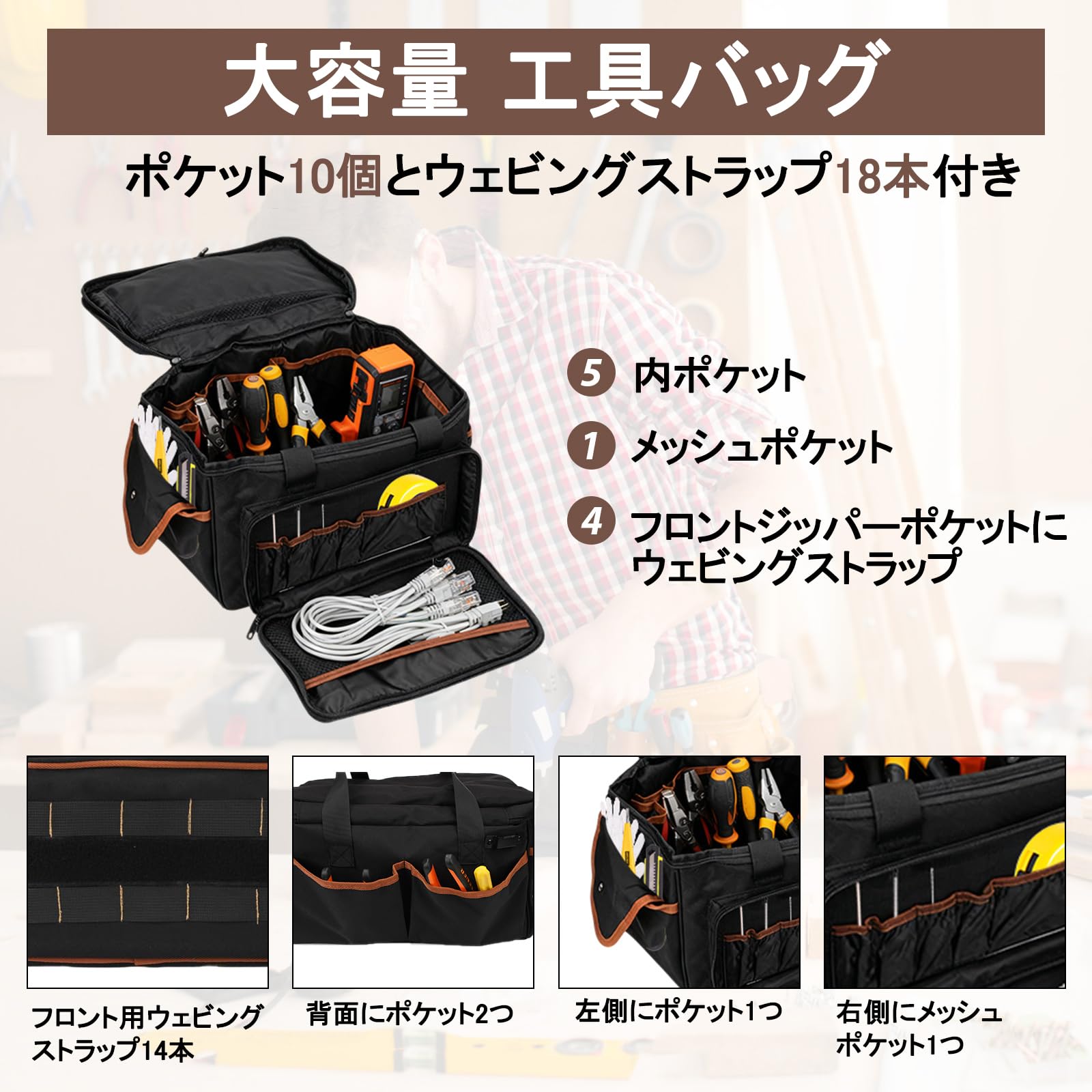 ツールバッグ 工具バッグ 大容量 工具入れ ばっぐ 多機能 工具袋 工具差し入れ 工具収納 ツールキャリーバッグ 900Dオックスフォード 肩掛けベルト付き ツール収納ばっぐ 道具袋 整備工具 工具収納 電気工事 木工用 47x35x25cm