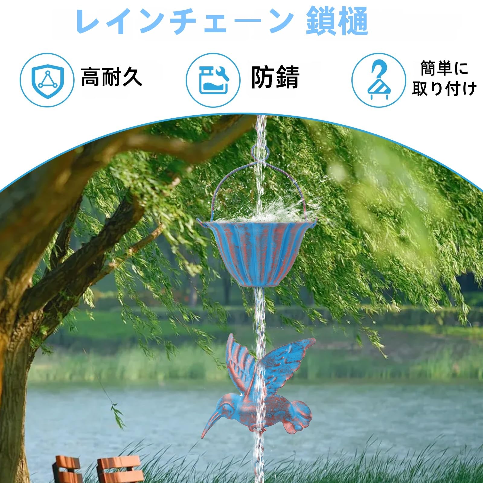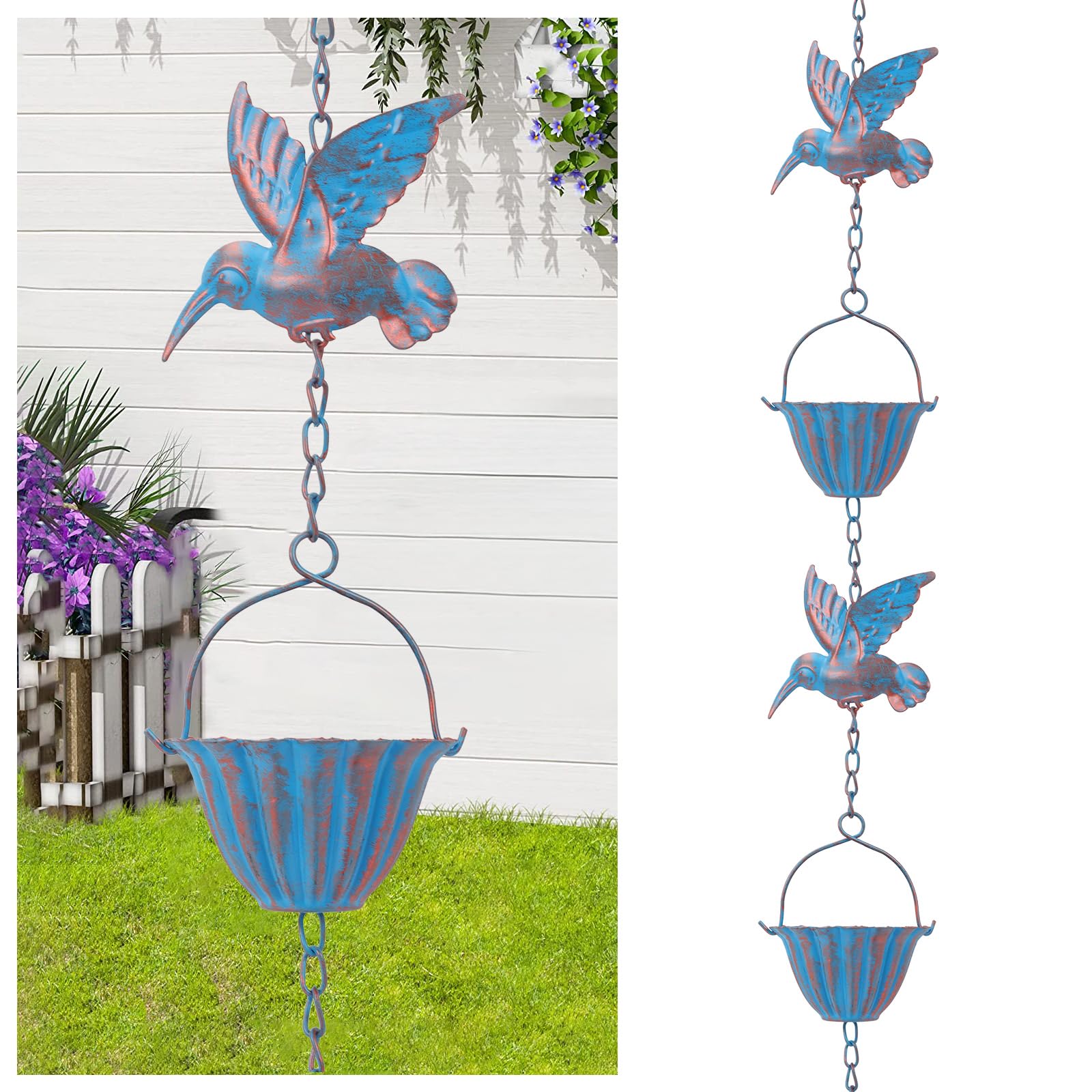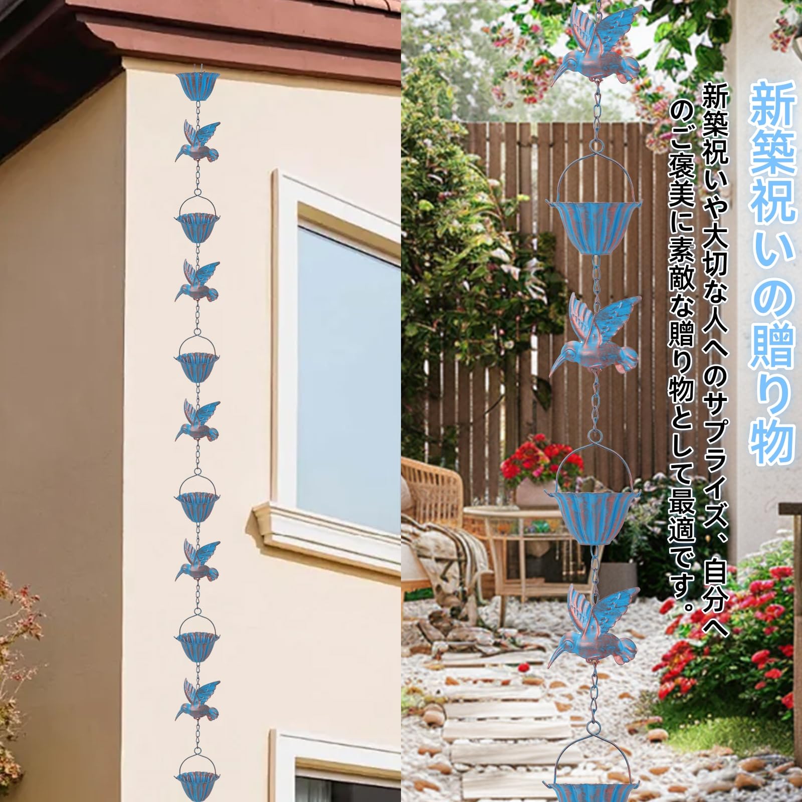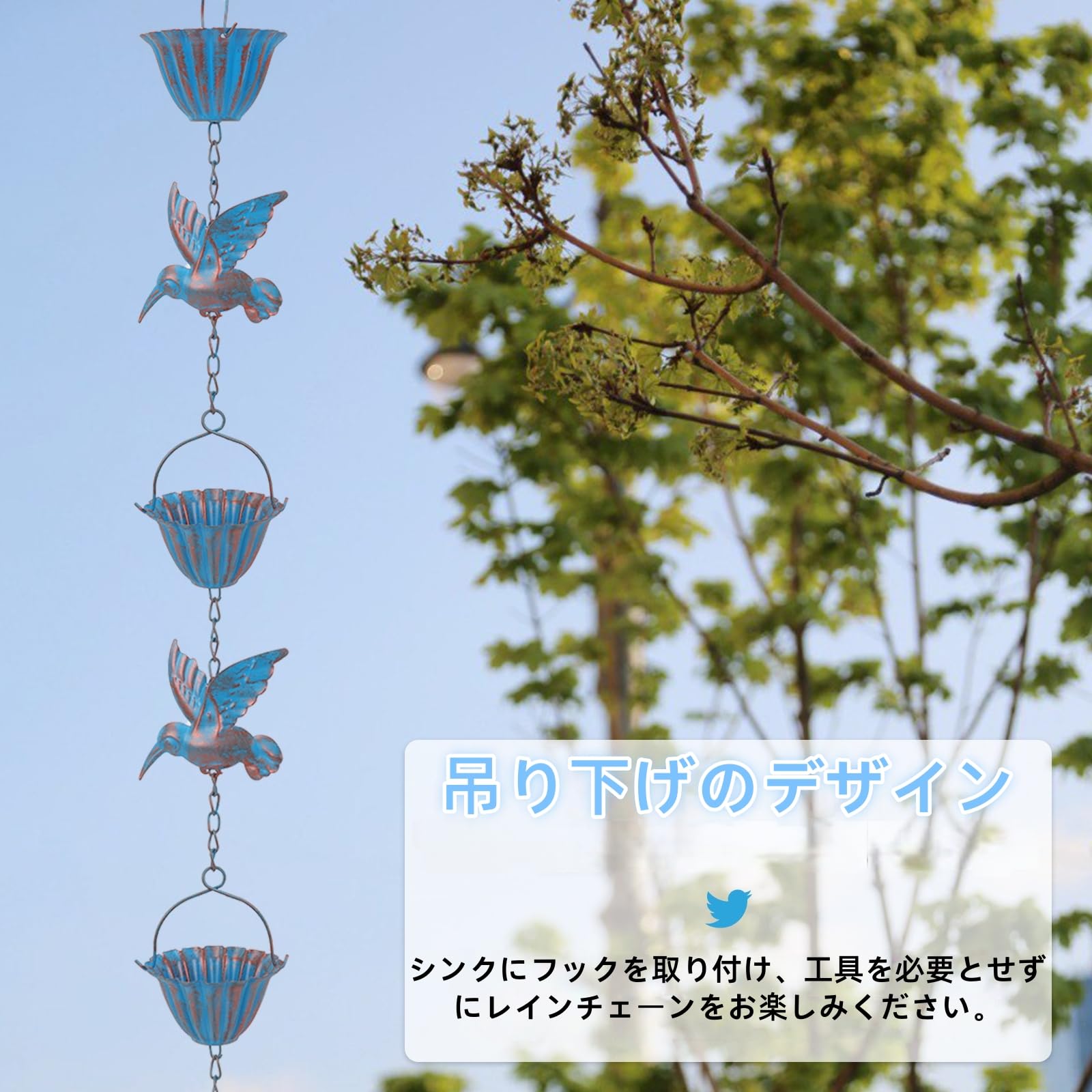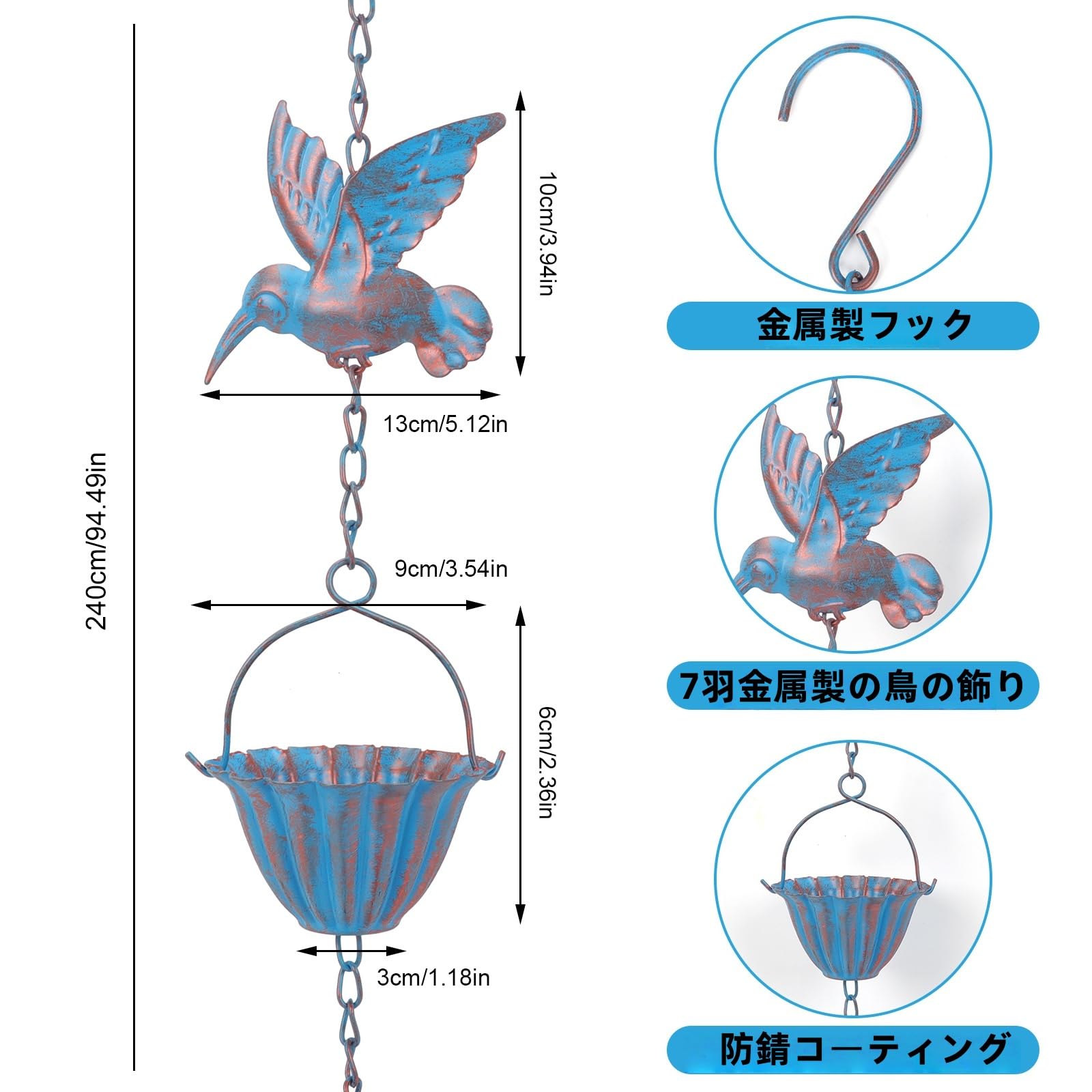 雨樋雨 どい 部品 側溝用雨鎖 レインチェーン 可愛いカップの上に鳥鎖樋 カーポート 雨樋新居用 吊り下げ 金属製風鈴 ウィンドチャイム癒し音 庭飾り 室外室内装飾ギフト 鳥雨チェーン 取り付け簡単 長さ2.4m Rain Chain(ブルー)