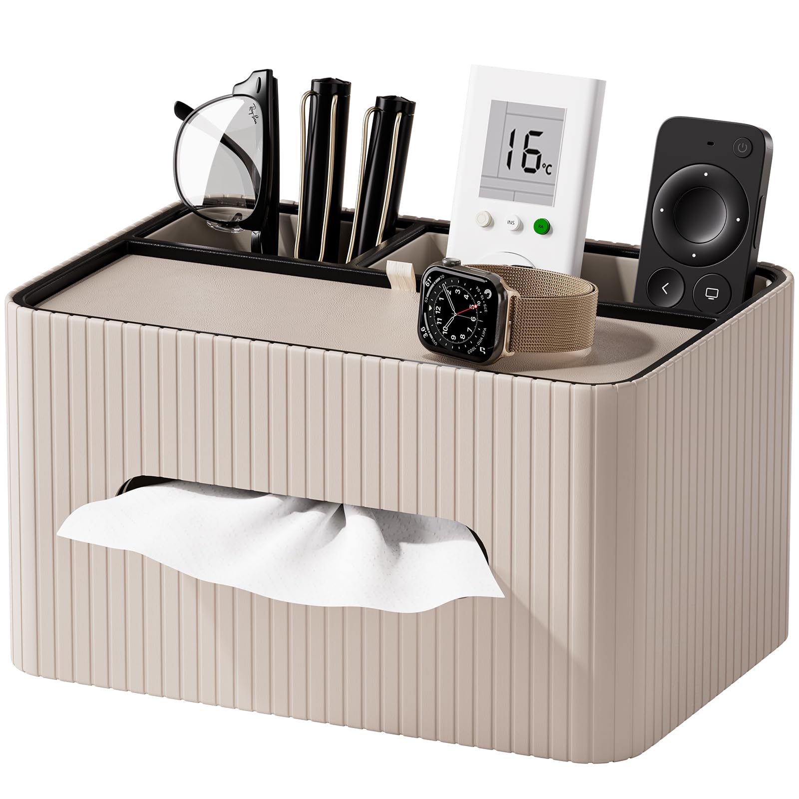 Richblue ティッシュケース 多機能 卓上収納ケース ある縦縞レザー リモコン 収納 小物入れ ペン立て デスク周り 収納 インテリア おしゃれ デスク周り 便利グッズ 北欧風 (ミルクティーベージュ)