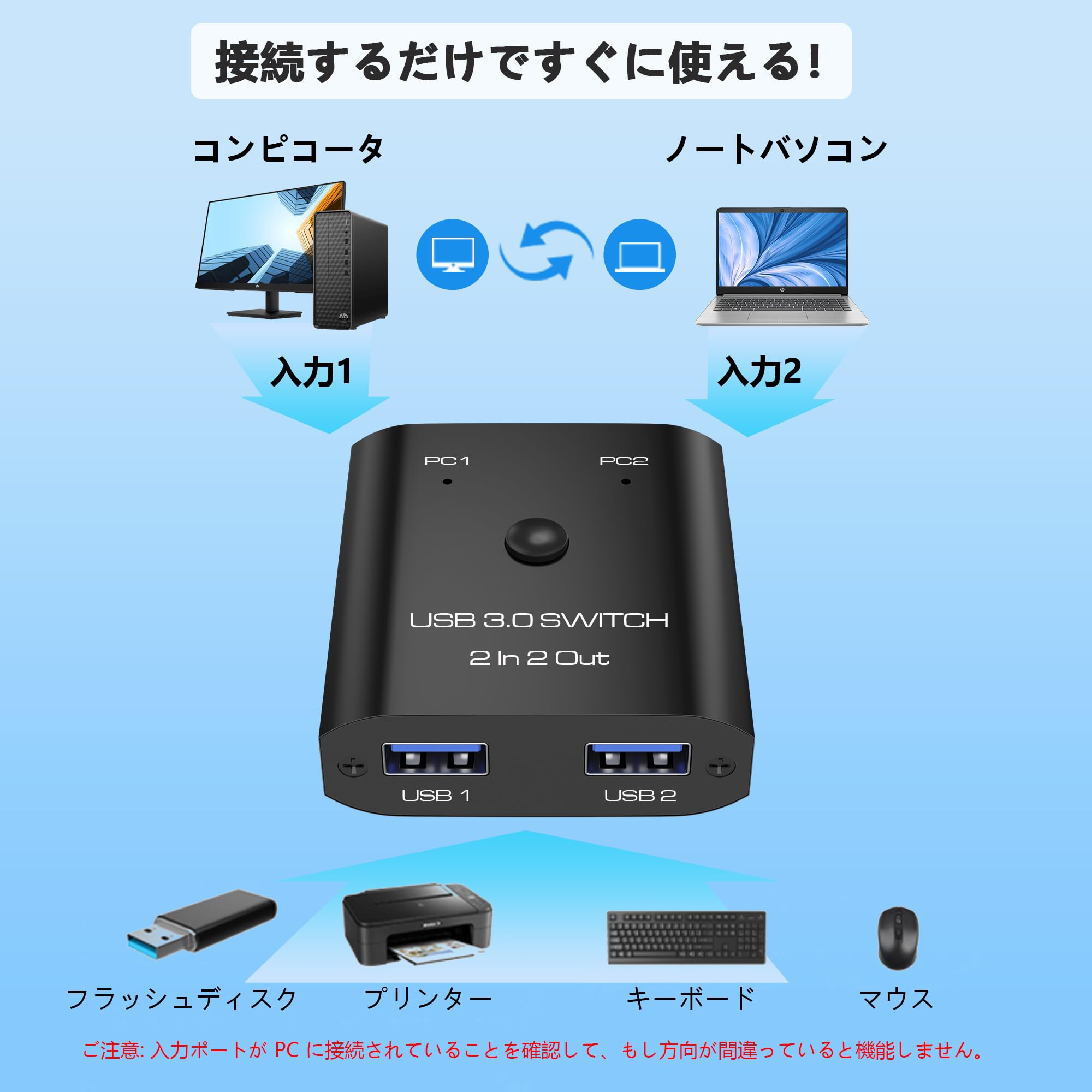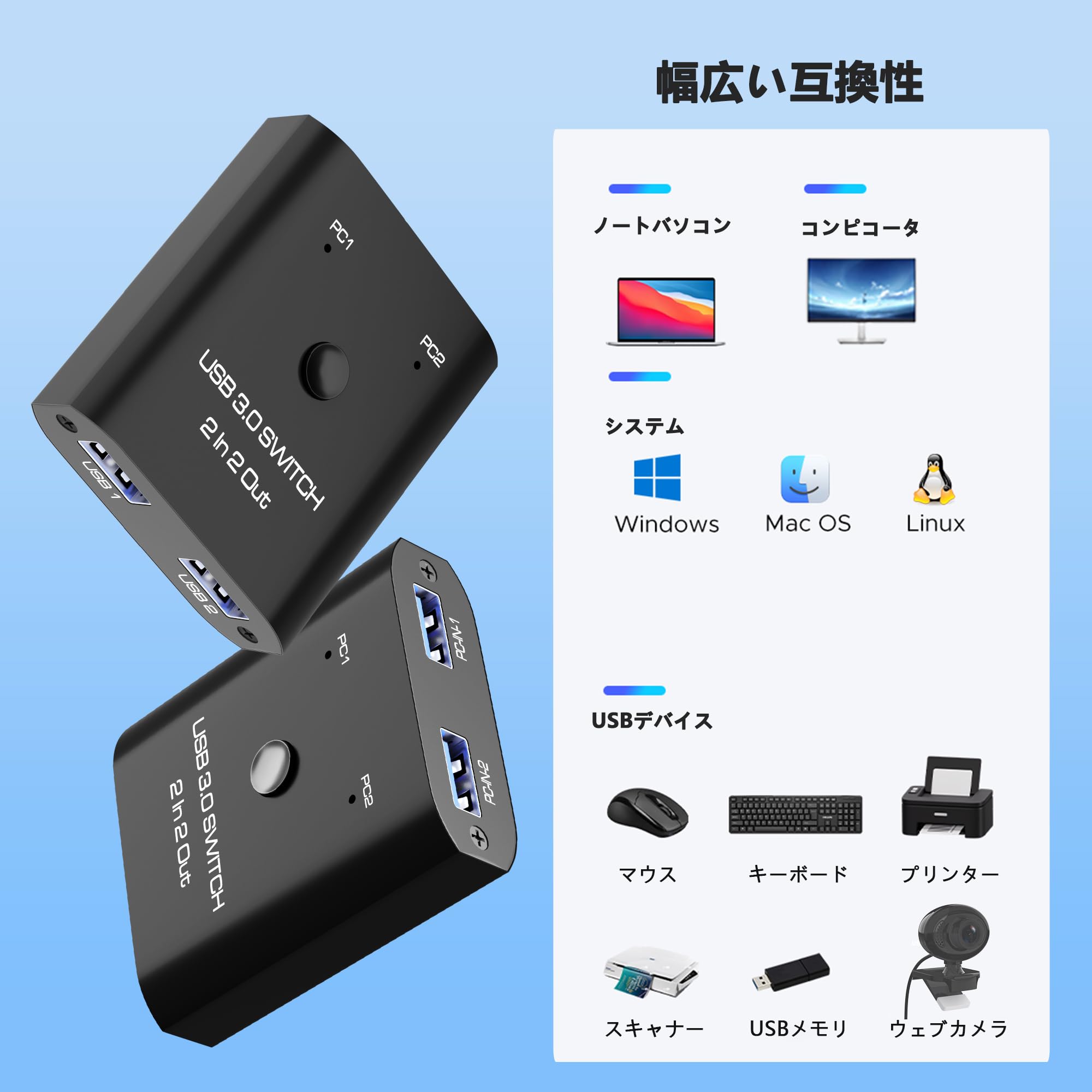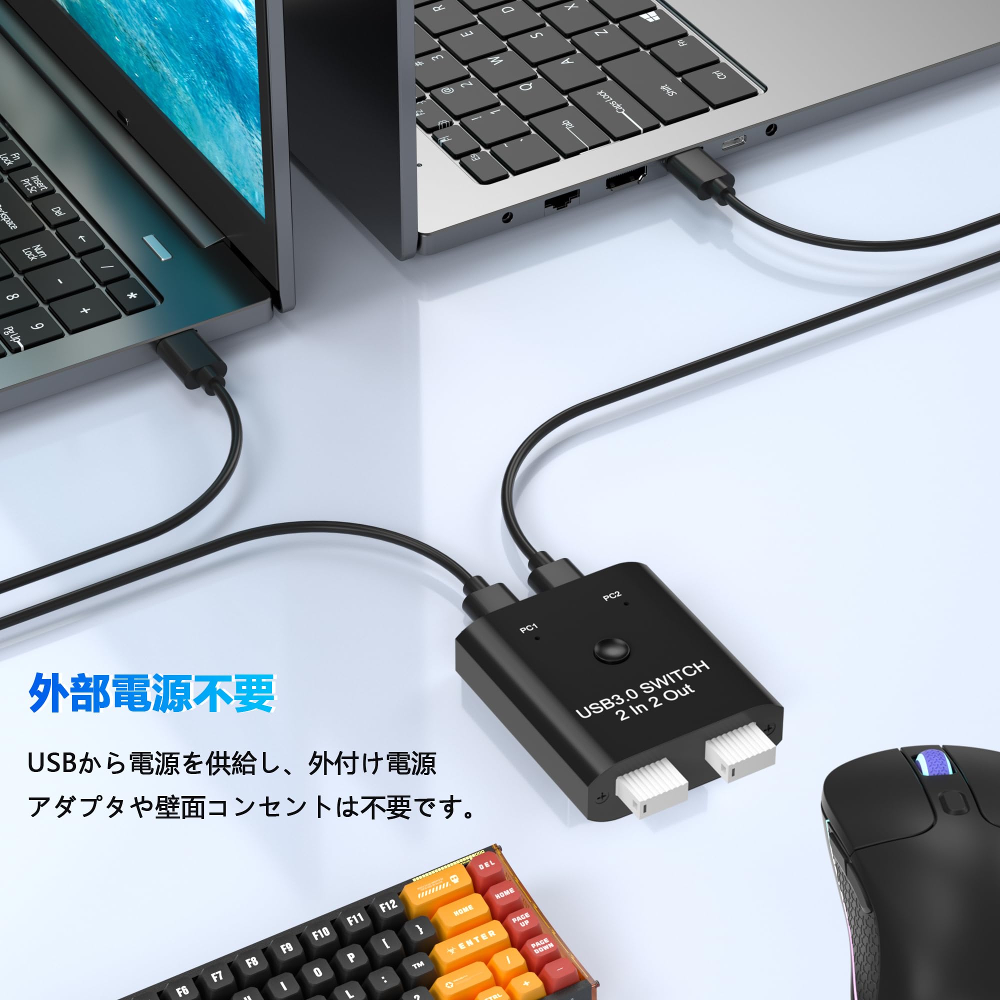 USB3.0 切替器 PC2台用 2入力2出力 2本のUSB3.0ケーブル付き USB 切り替え器 2台PCでキーボード/マウス/プリンタなどを共有 5Gbps高速転送 Type-A切り替え機 1台のプリンターを2台のパソコンで使用 マウス キーボード 切り替え USB 分岐 Type-A セレクター スイッチャー