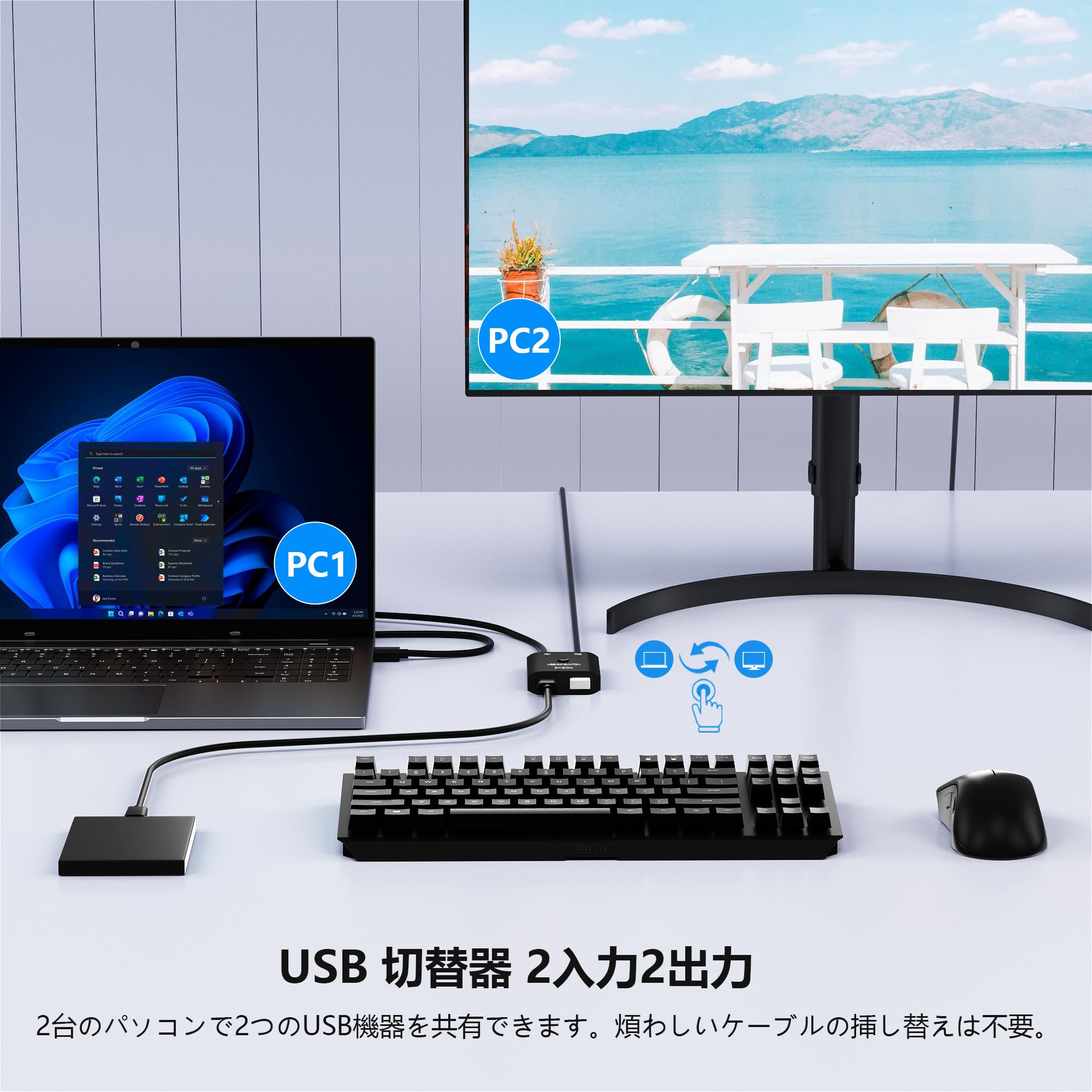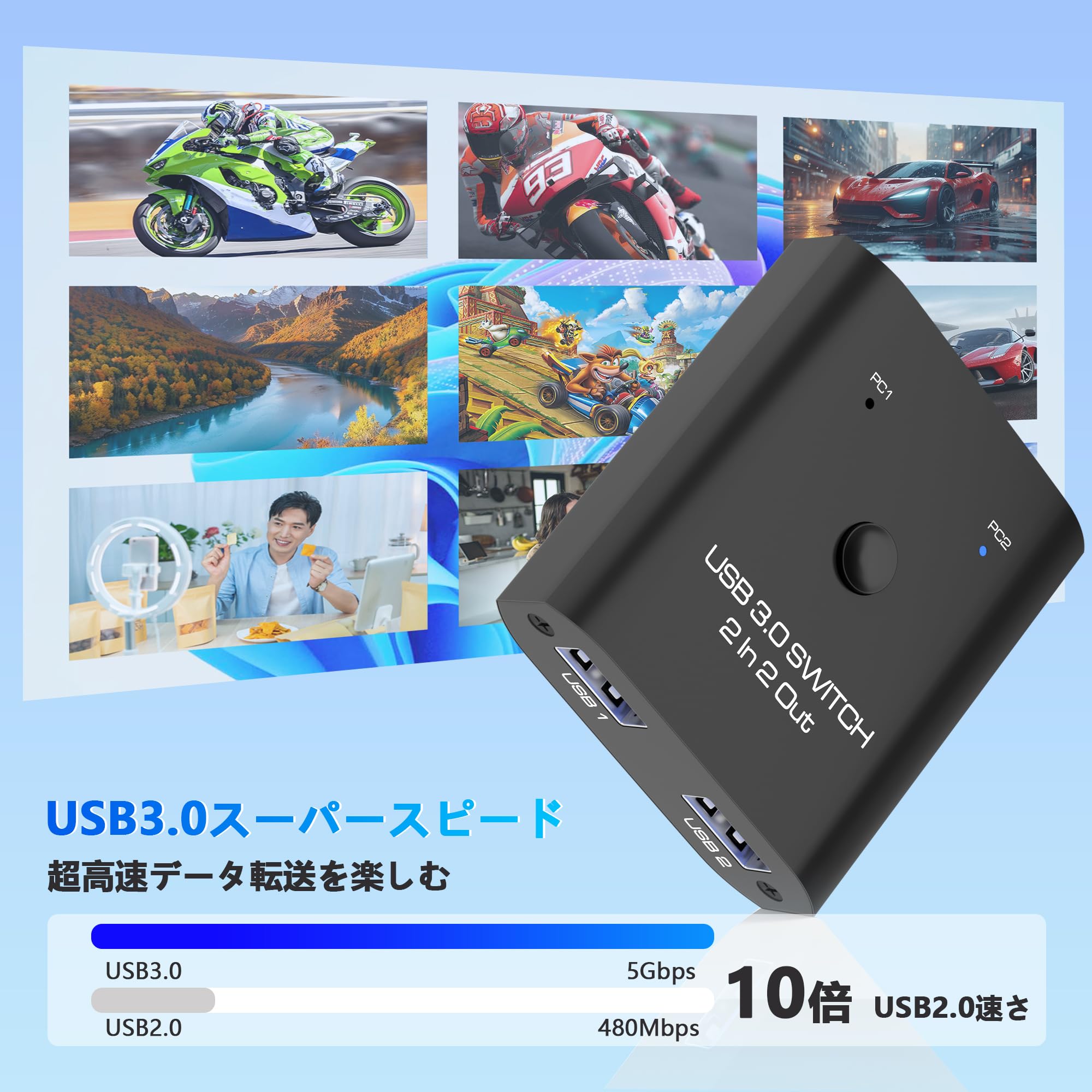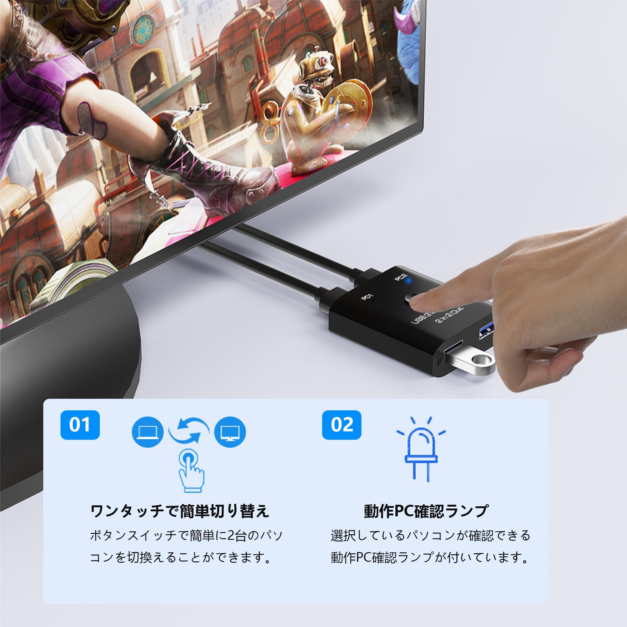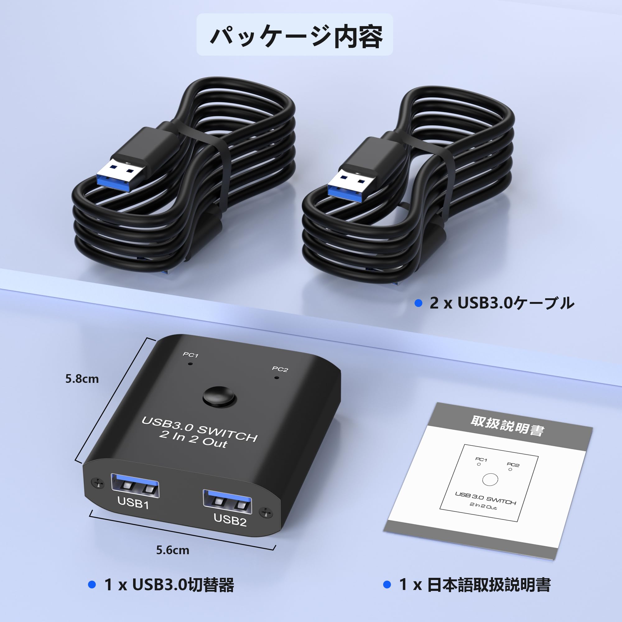 USB3.0 切替器 PC2台用 2入力2出力 2本のUSB3.0ケーブル付き USB 切り替え器 2台PCでキーボード/マウス/プリンタなどを共有 5Gbps高速転送 Type-A切り替え機 1台のプリンターを2台のパソコンで使用 マウス キーボード 切り替え USB 分岐 Type-A セレクター スイッチャー
