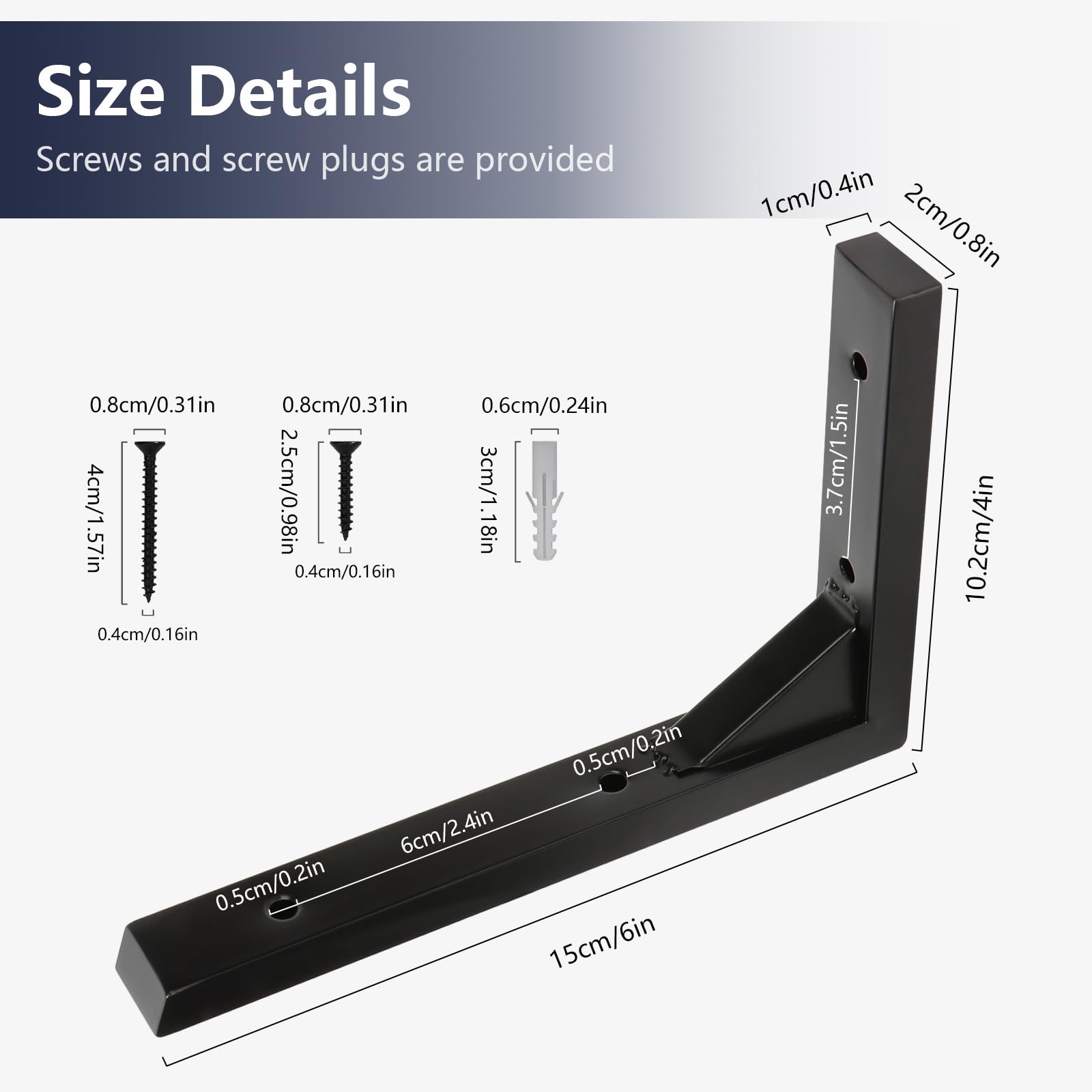 MLOQI 棚受け金具 ブラケット 厚さ5mm 頑丈棚受け 金具 ビス付 最大荷重50KG 隠し棚受け 棚の補強 l字金具 ブラック(6本 25cm)