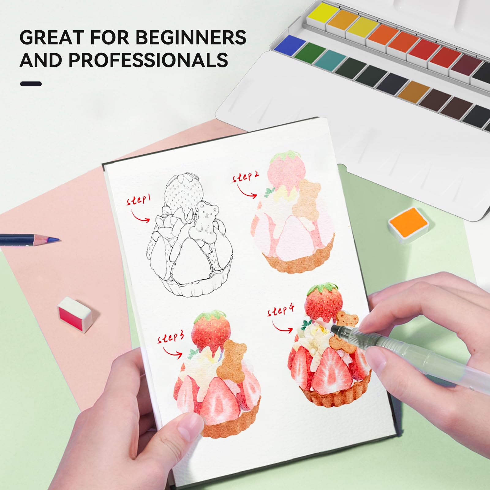 水彩絵の具セット 128色、水彩絵の具大人用セット 水彩紙、ブラシ、鉛筆、消しゴム、ポータブル旅行水彩セット 初心者向け