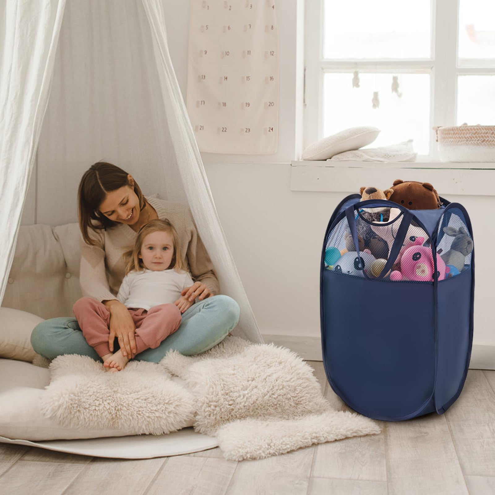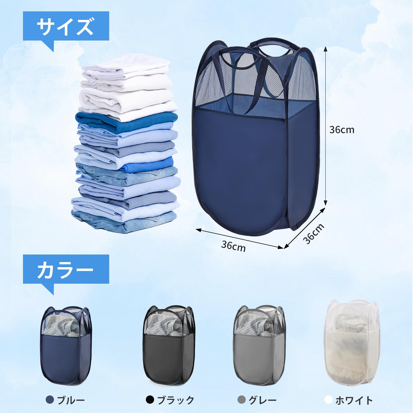 TECHMILLY ランドリーバスケット 折りたたみ 洗濯かご 洗濯カゴ 大容量 71L メッシュ ポリエステル 省スペース 取っ手付き 洗濯籠 ランドリー収納 ランドリー バスケットランドリーバッグ 自立 縦型 脱衣カゴ 収納 洗濯物 袋 かご 持ち運び可能 おしゃれ 軽量 旅行 ゴミ箱 (ブルー・ポリエステル、2PCS)