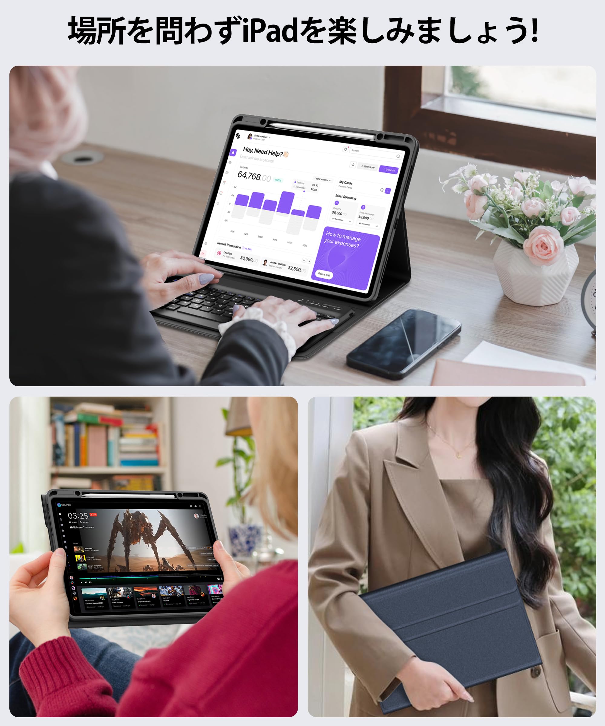 【高級版】iPad 10世代 キーボードケース 日本語配列 脱着式 2台デバイスマルチペアリング 対応 横置きも縦置きもトラックパッド付き iPad 第10世代 ケース キーボード 多角度調整 Type-C充電式 日本語取扱説明書(黒)