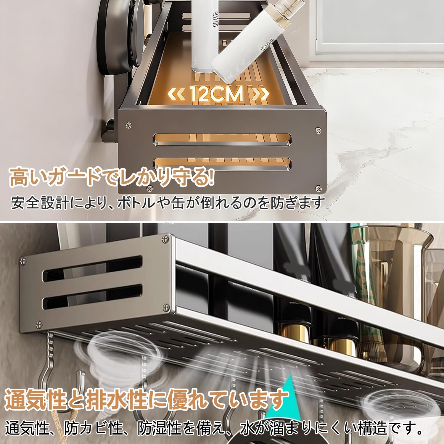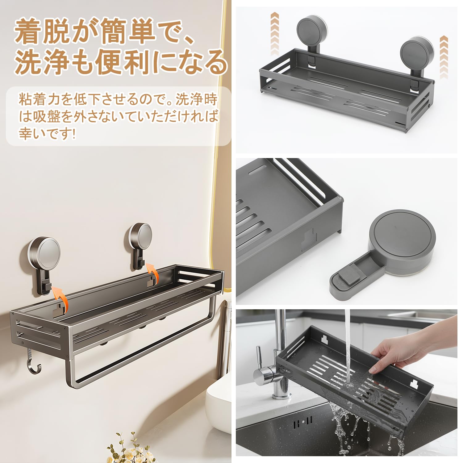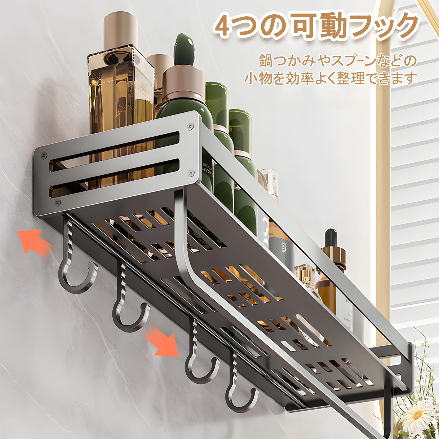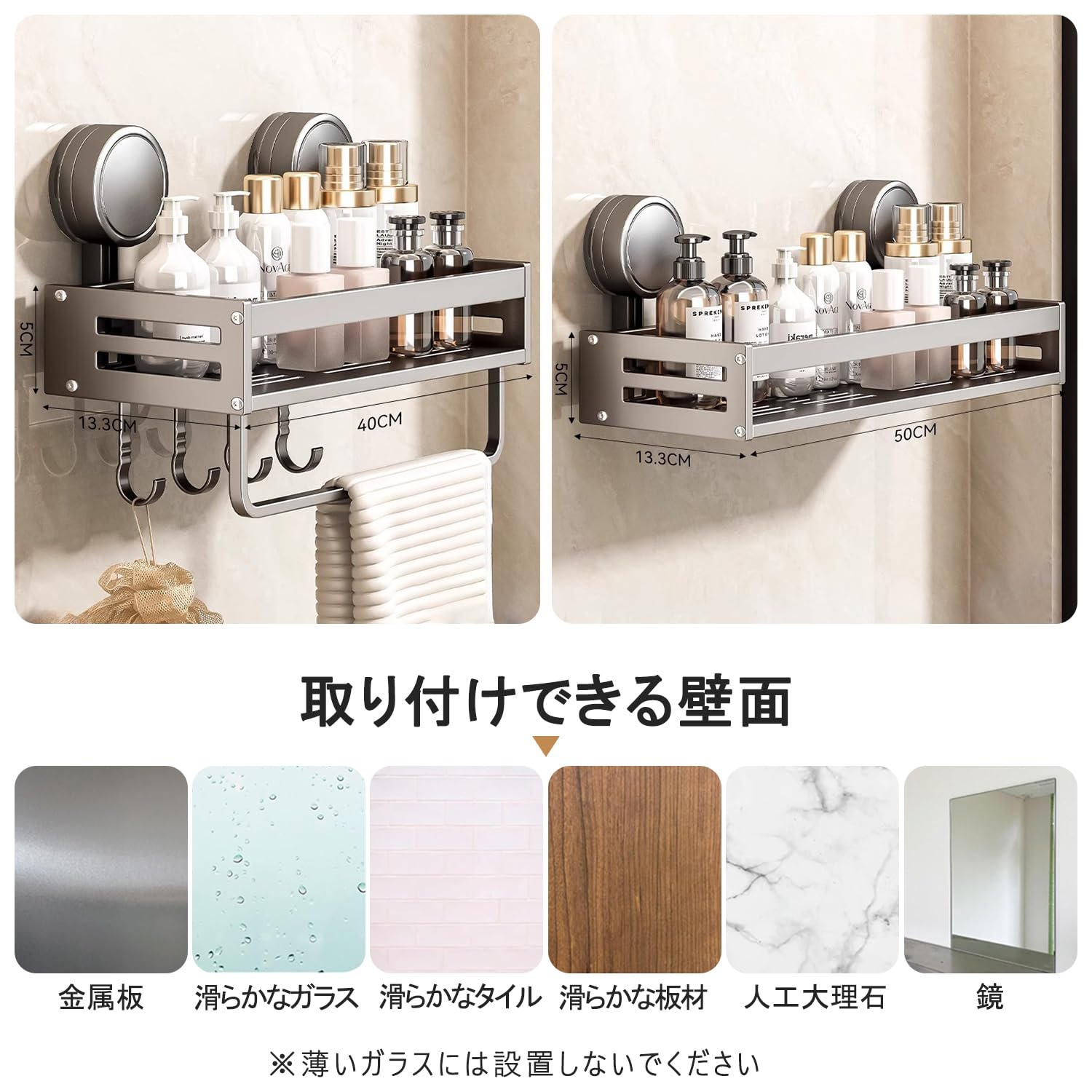 Vinnatsu調味料ラック 吸盤 強力 アルミニウム合金 調味料入れ 吸盤 棚 キッチン収納 浴室ラック 防水防錆 調味料ストッカー 壁掛け 調味料 置き 4個移動式フック 耐荷重10kg (50×13.3×5cm)