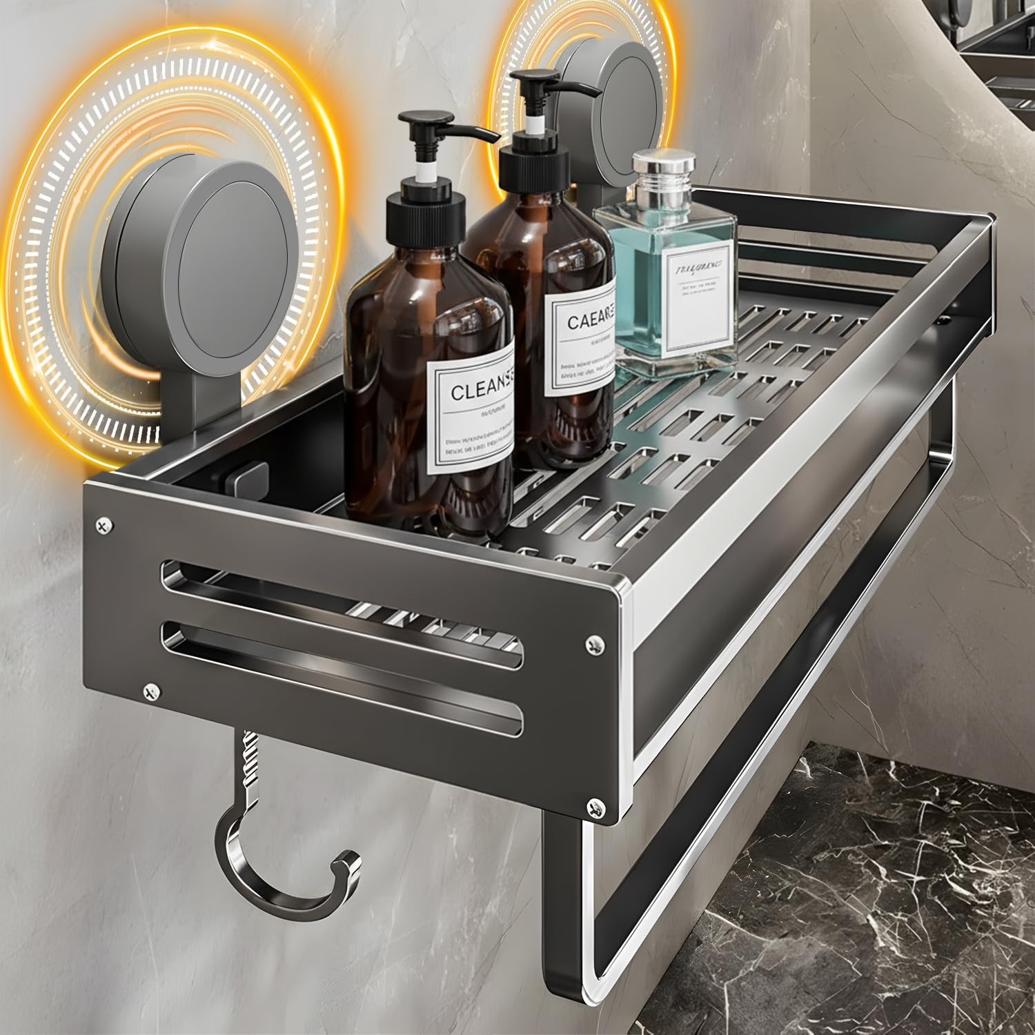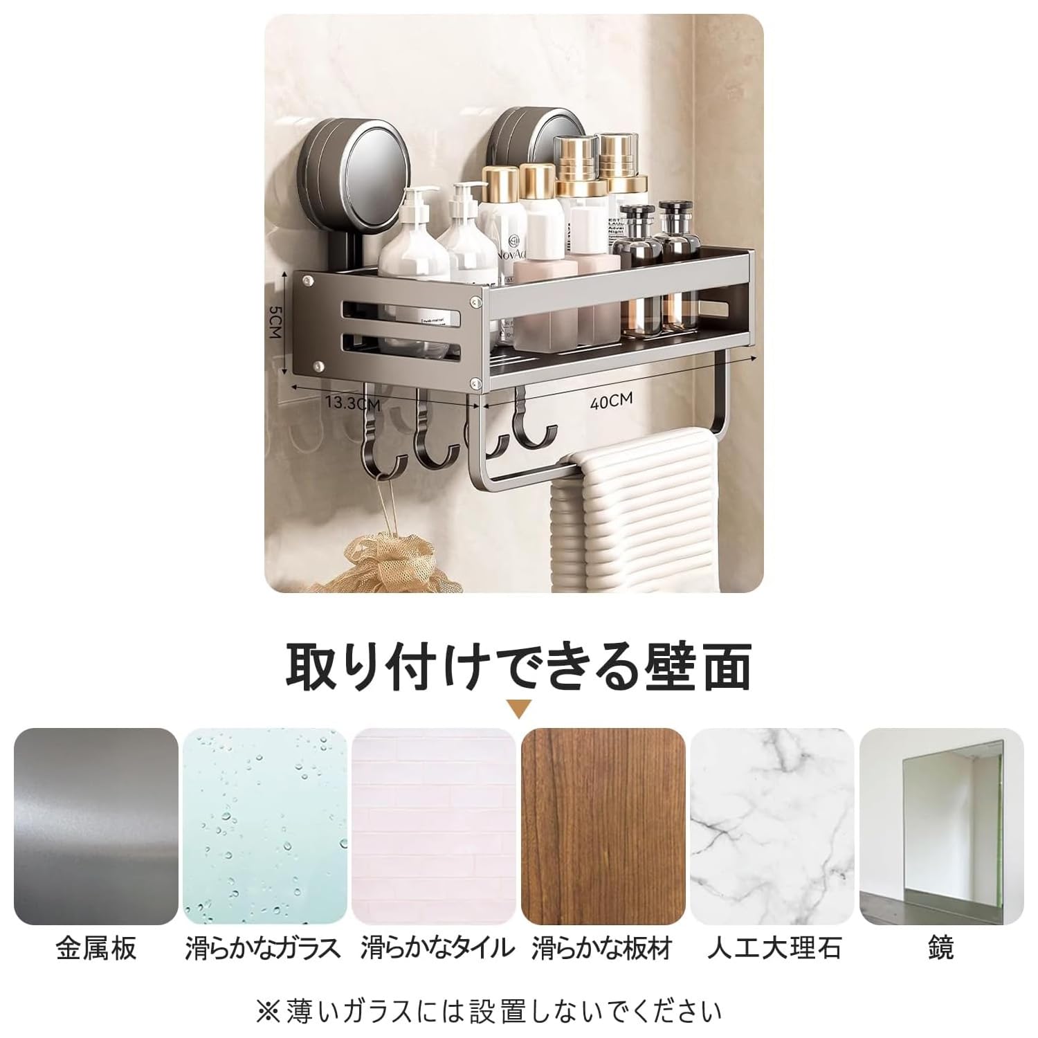 Vinnatsu調味料ラック 吸盤 強力 アルミニウム合金 調味料入れ 吸盤 棚 キッチン収納 浴室ラック 防水防錆 調味料ストッカー 壁掛け 調味料 置き 4個移動式フック 耐荷重10kg (40×13.3×5cm,ラック付き)