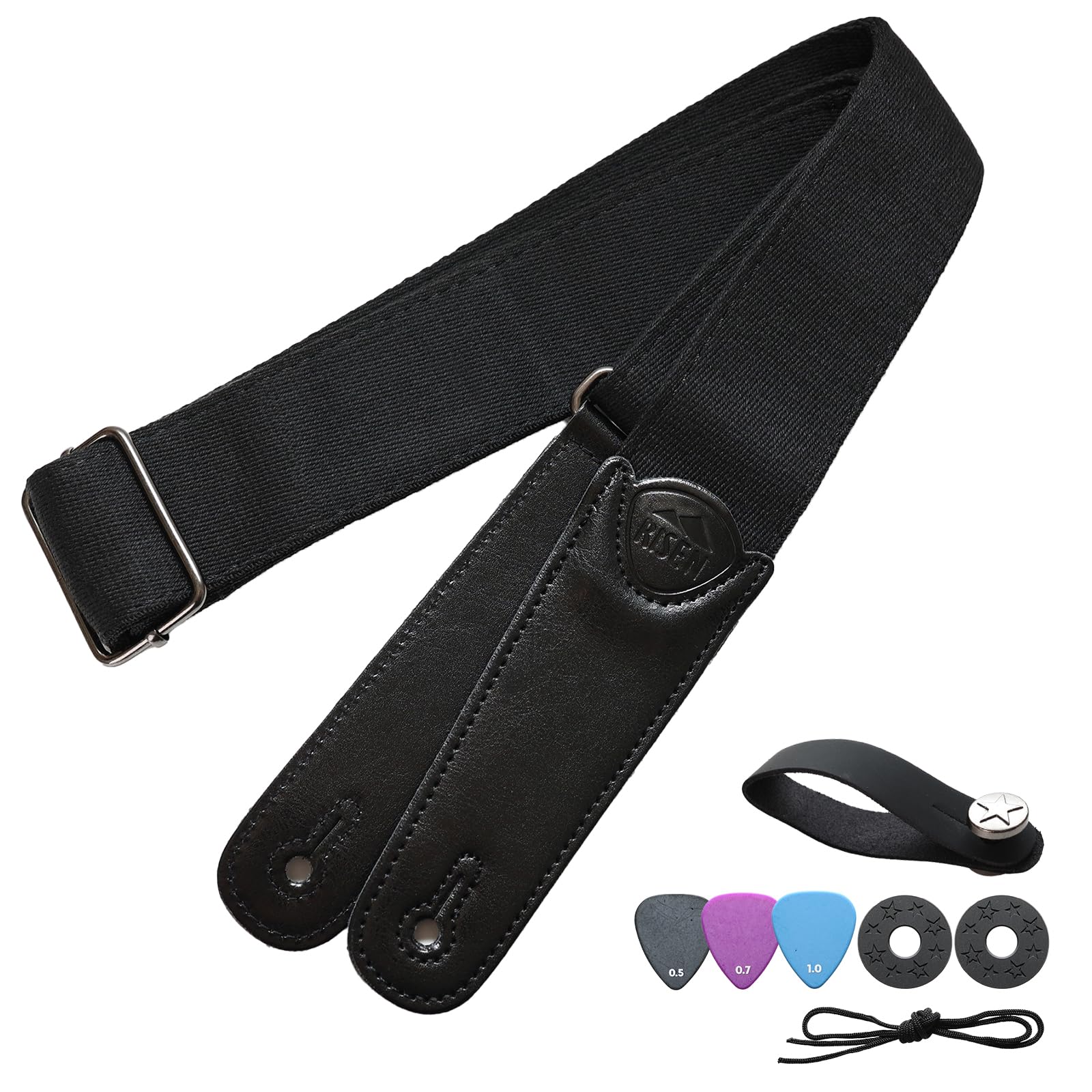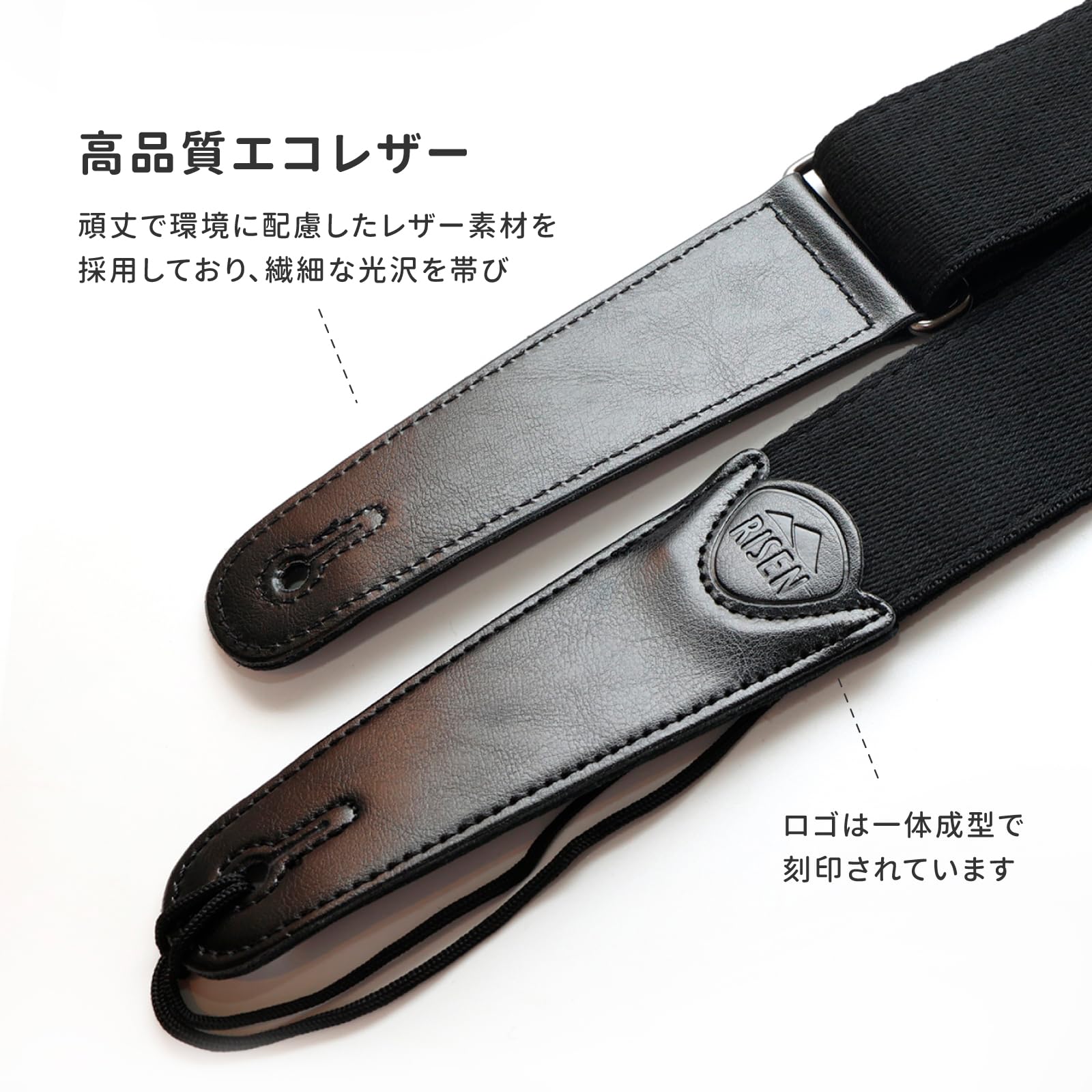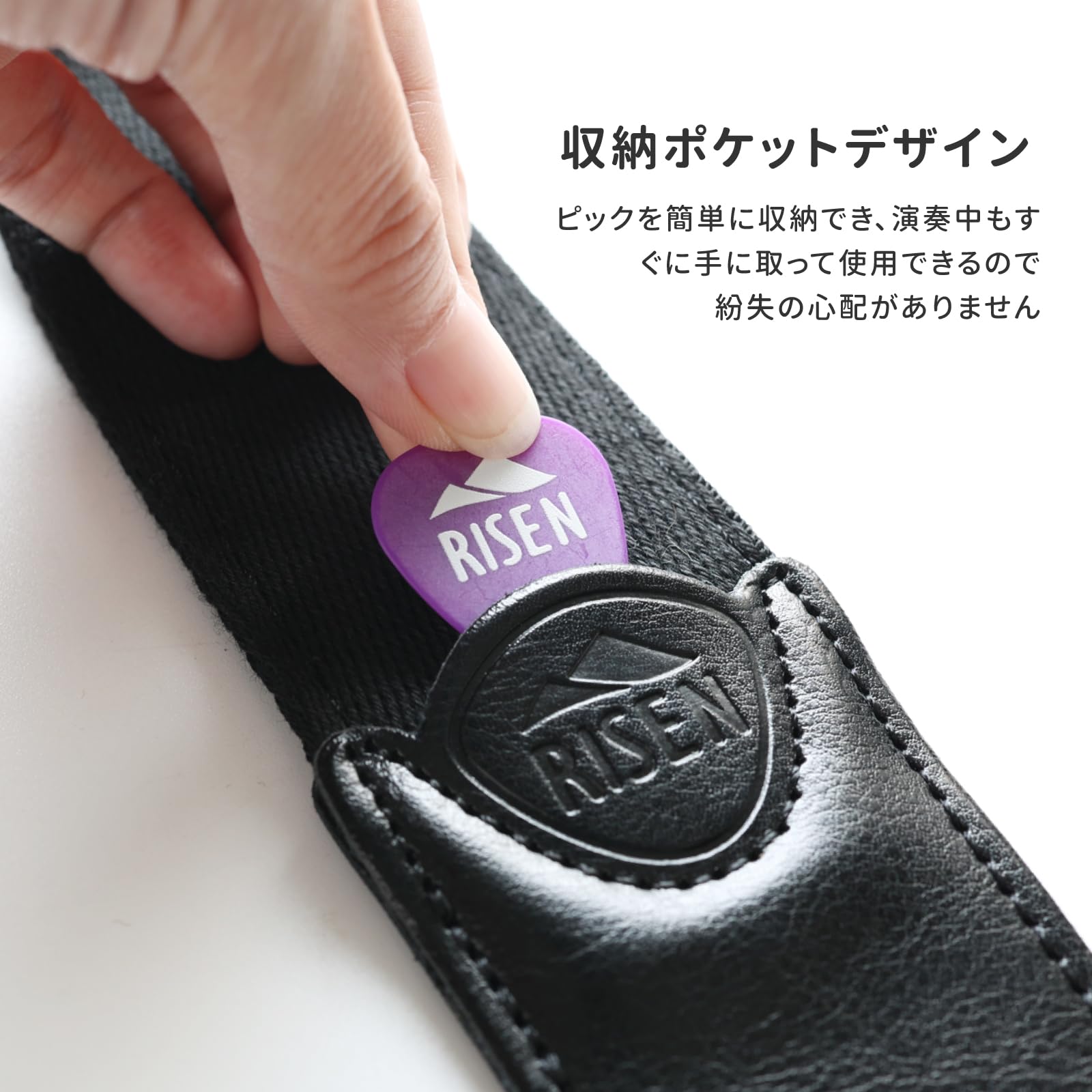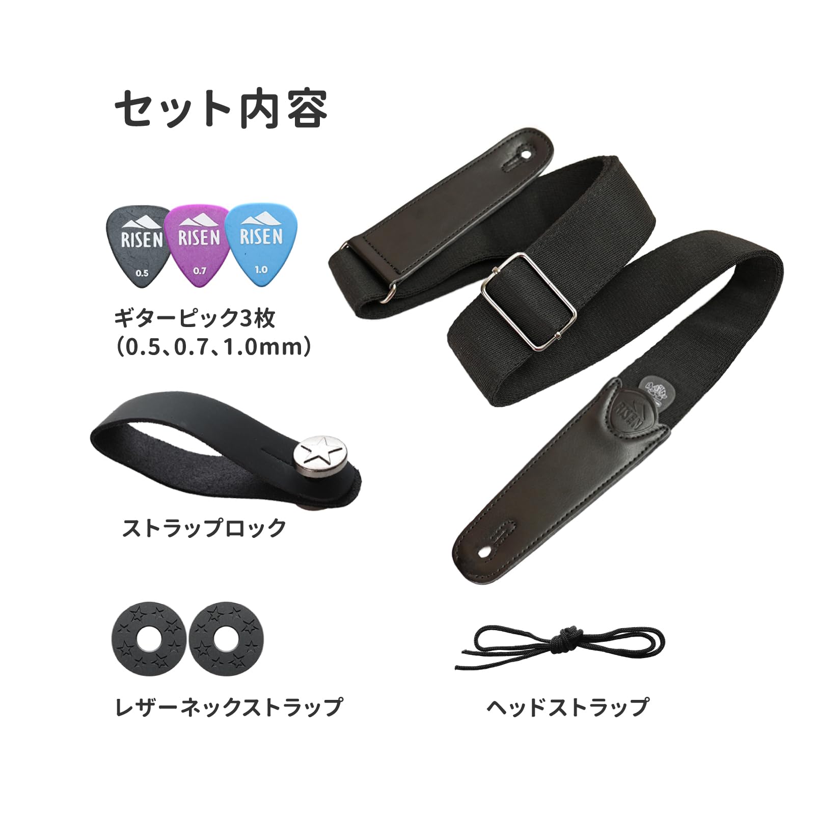 [RISEN LIFE] RS005 ギターストラップ コットンウェビング ピック収納可 ウクレレ・エレキギター・ベース対応 調節可能ストラップ ブラック(セット内容:ピック3枚、ヘッドストラップ、ストラップロック、レザーネックストラップ)