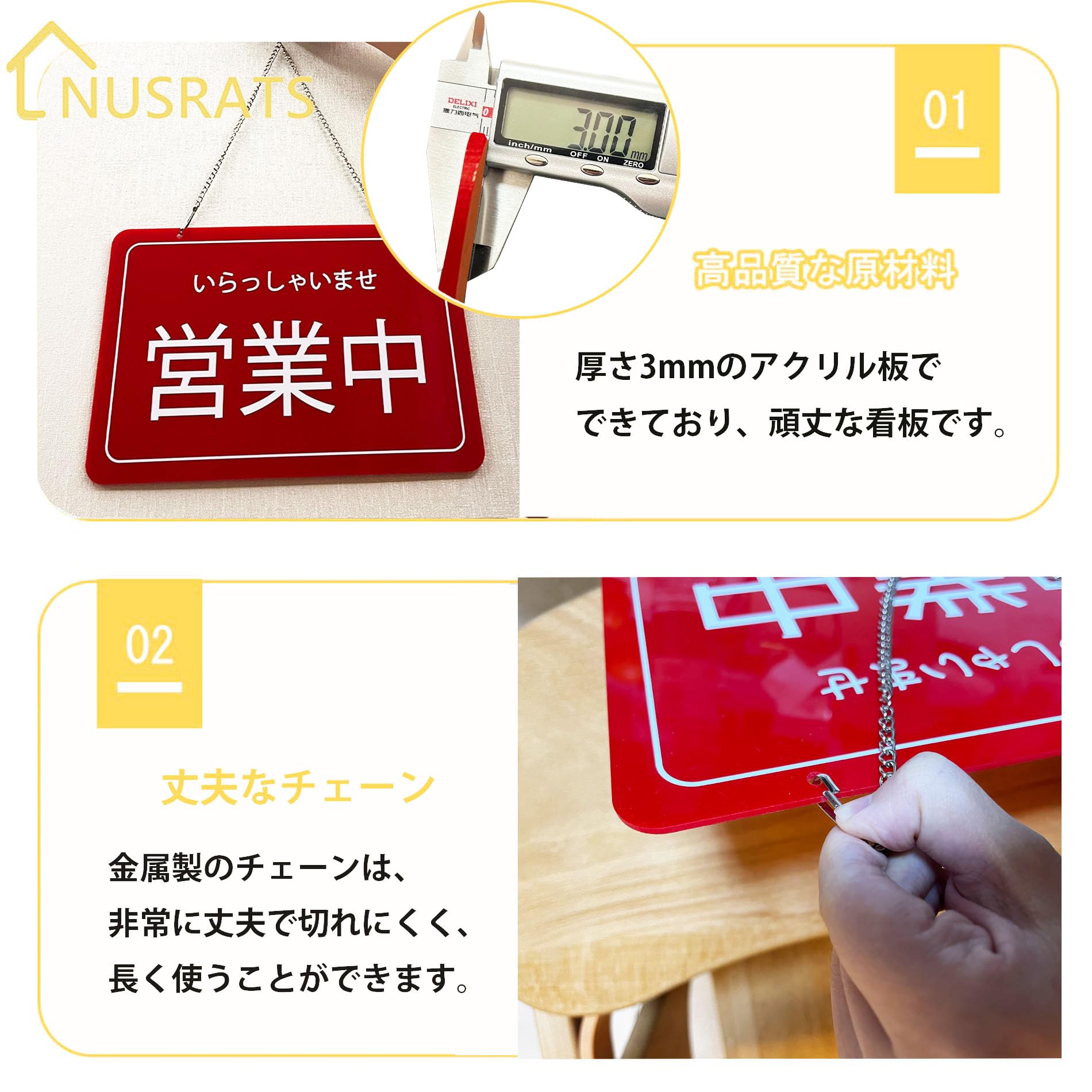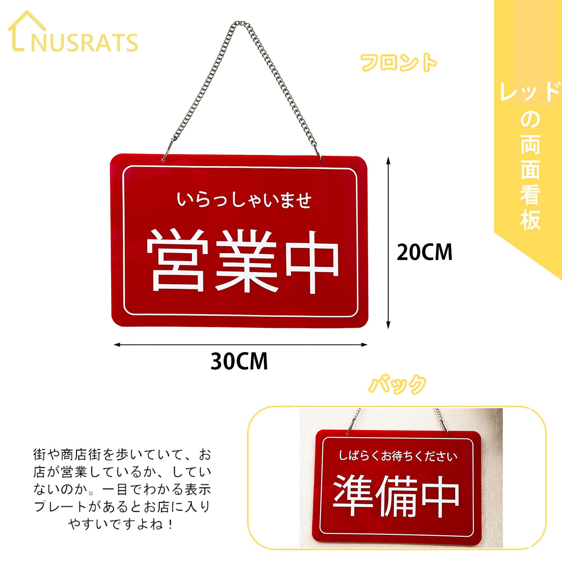 営業中 準備中 両面用 店舗用看板 プレート レッド 30×20CM アクリル 厚さ3MM 日本語 オープンクローズ看板