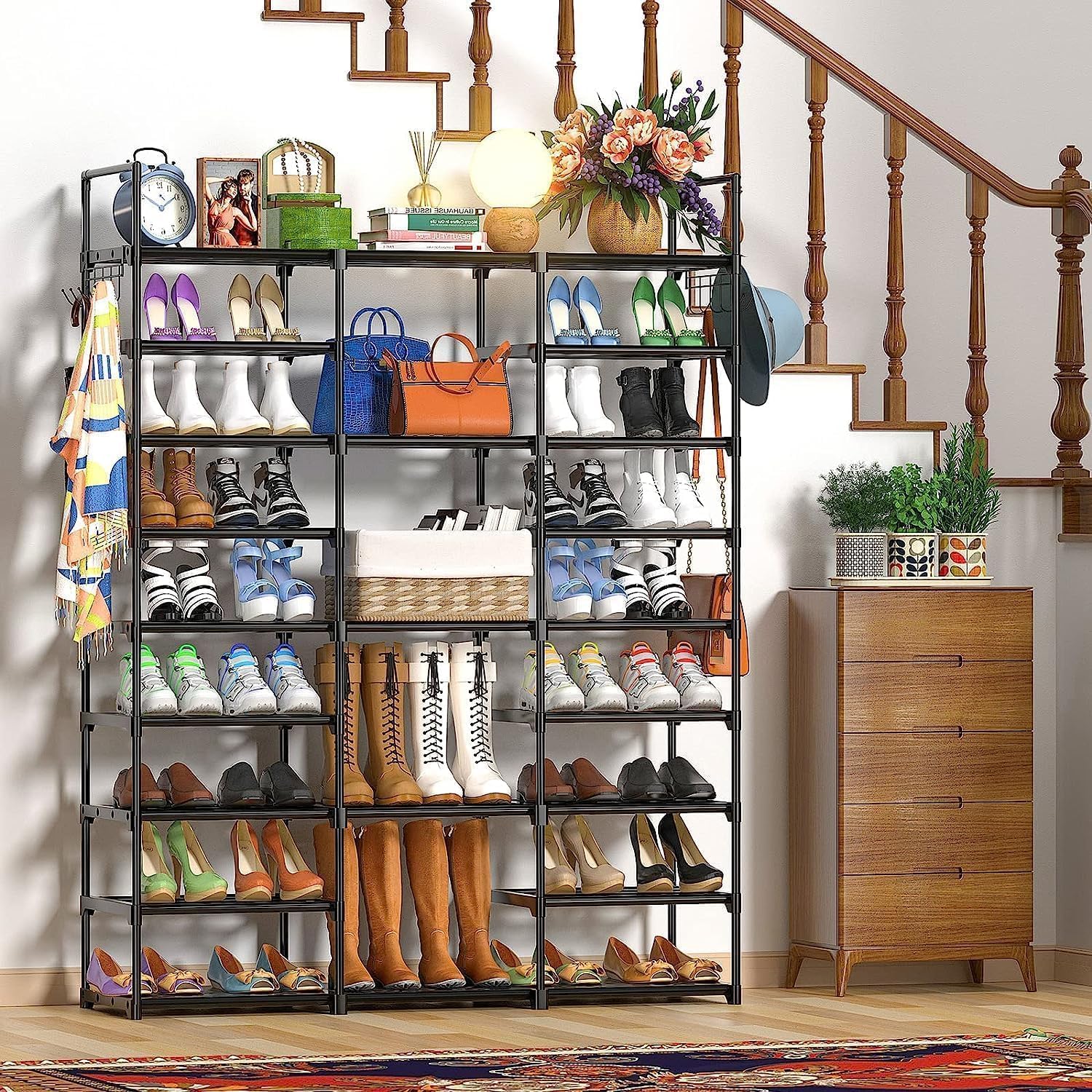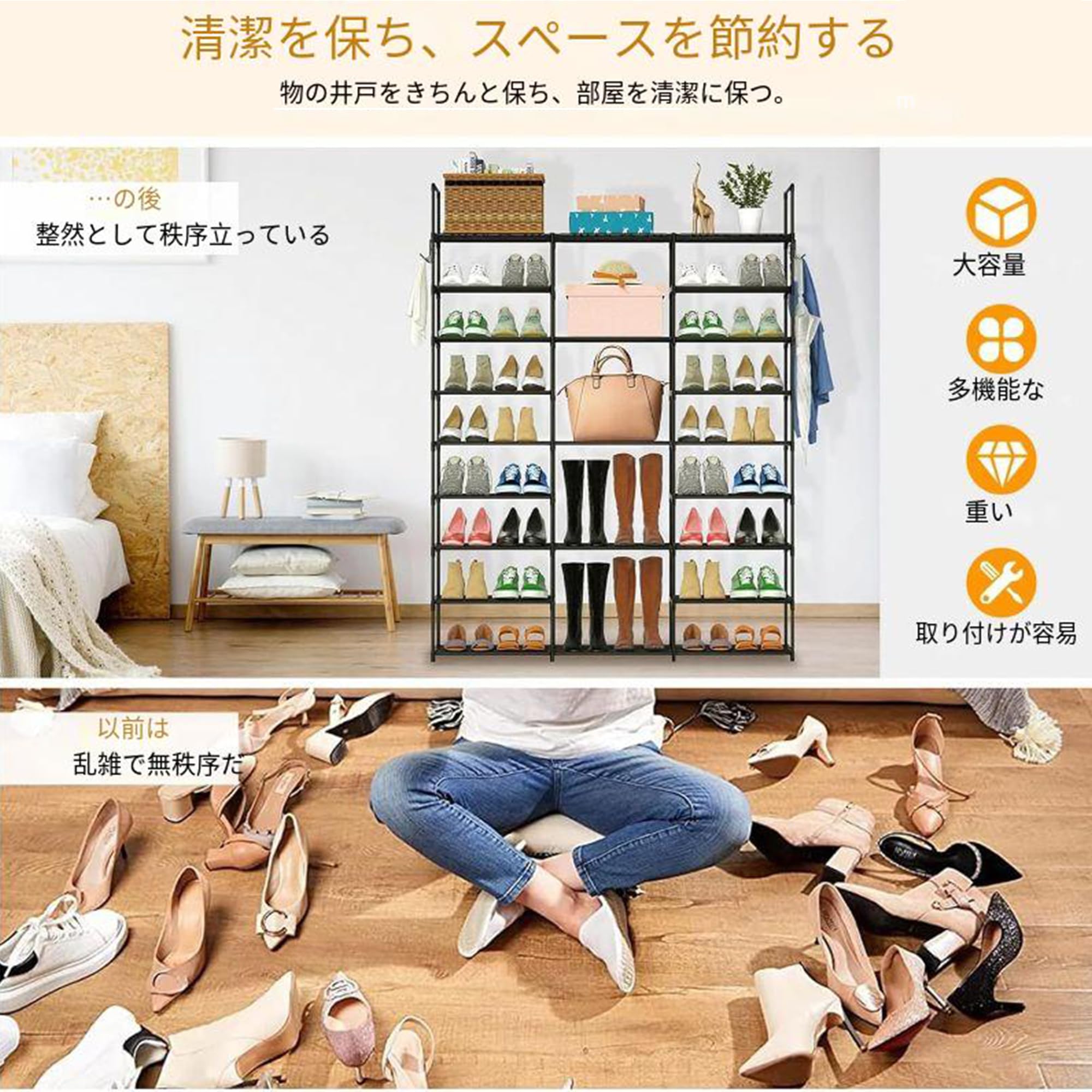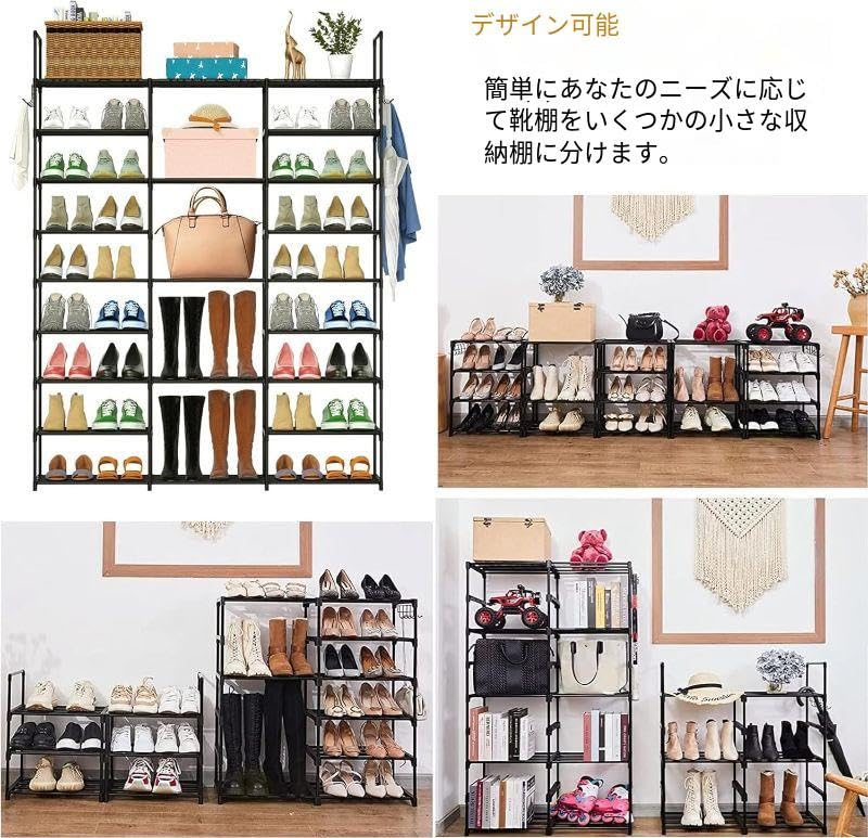 スペースを有効活用できる9段シューズラック「LANJUY」が、あなたの玄関やクローゼットを効率的に整理します。全高158cm、幅30cmのスリムな設計で、最大55足もの靴を収納可能。ブーツ、ヒール、スニーカーなど、様々なタイプの靴に対応します。各段の高さは自由に調整でき、ロングブーツなども無理なく収納できます。工具不要で簡単に組み立てられ、必要に応じて2段ラックに分割することも可能です。靴以外にもバッグや帽子、工具箱の収納にも活用でき、付属のフックで傘や鍵も掛けられる多機能設計。表面コーティング済みの金属パイプと強化プラスチック製の接続部を採用し、安定性と耐久性を実現しました。玄関やクローゼット、ガレージなど、様々な場所で活躍する実用的な収納ソリューションです。