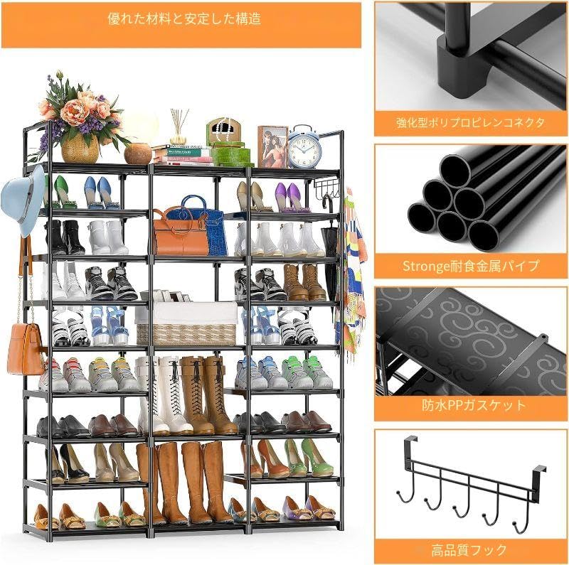 APICIZON シューズラック 靴収納 シューズラックスリム 玄関に靴を効率収納 靴だな 棚 省スペース 下駄箱 不織布 鉄パイプ 廊下 アパート用 (ブラック、10段)