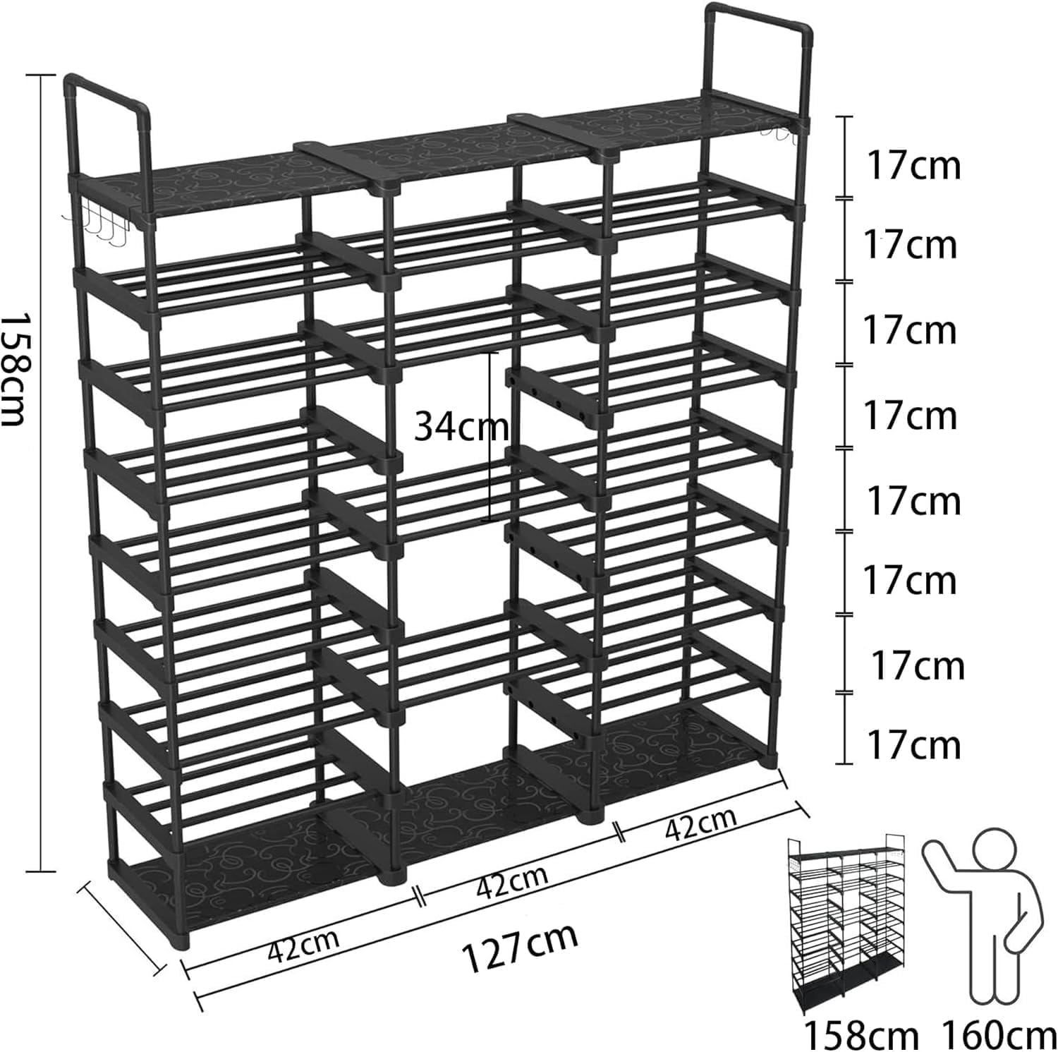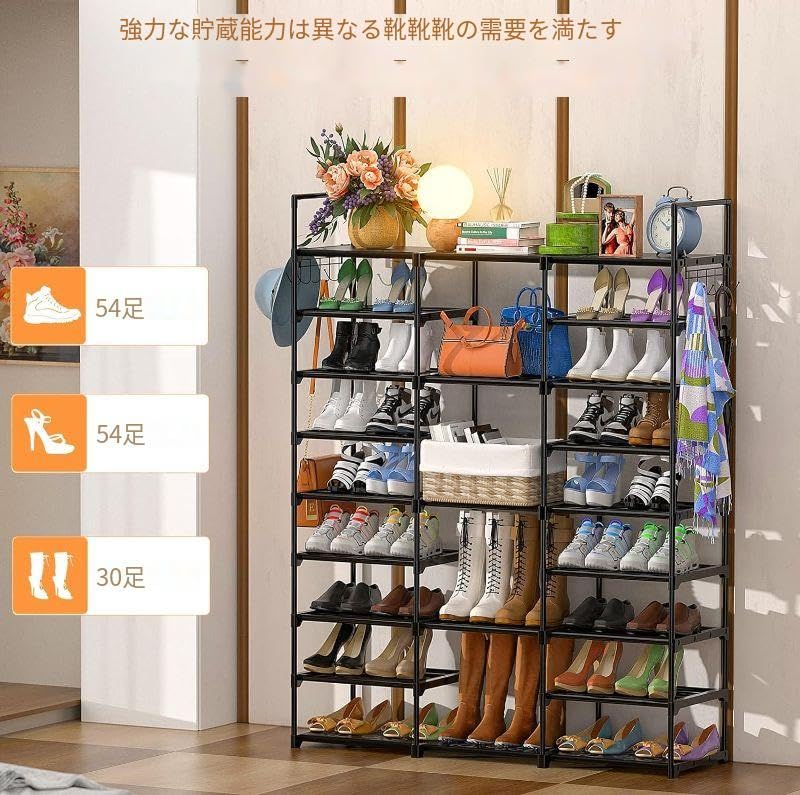 LANJUY シューズラック 9段 幅127cm 奥行30cm 高さ158cm 大容量靴棚 多機能ポータブル靴整理器 最大55足収納 靴・靴箱収納 側面フック付き 鞄・傘掛け 省スペース 玄関収納棚,高さ調節可能, 組立簡単