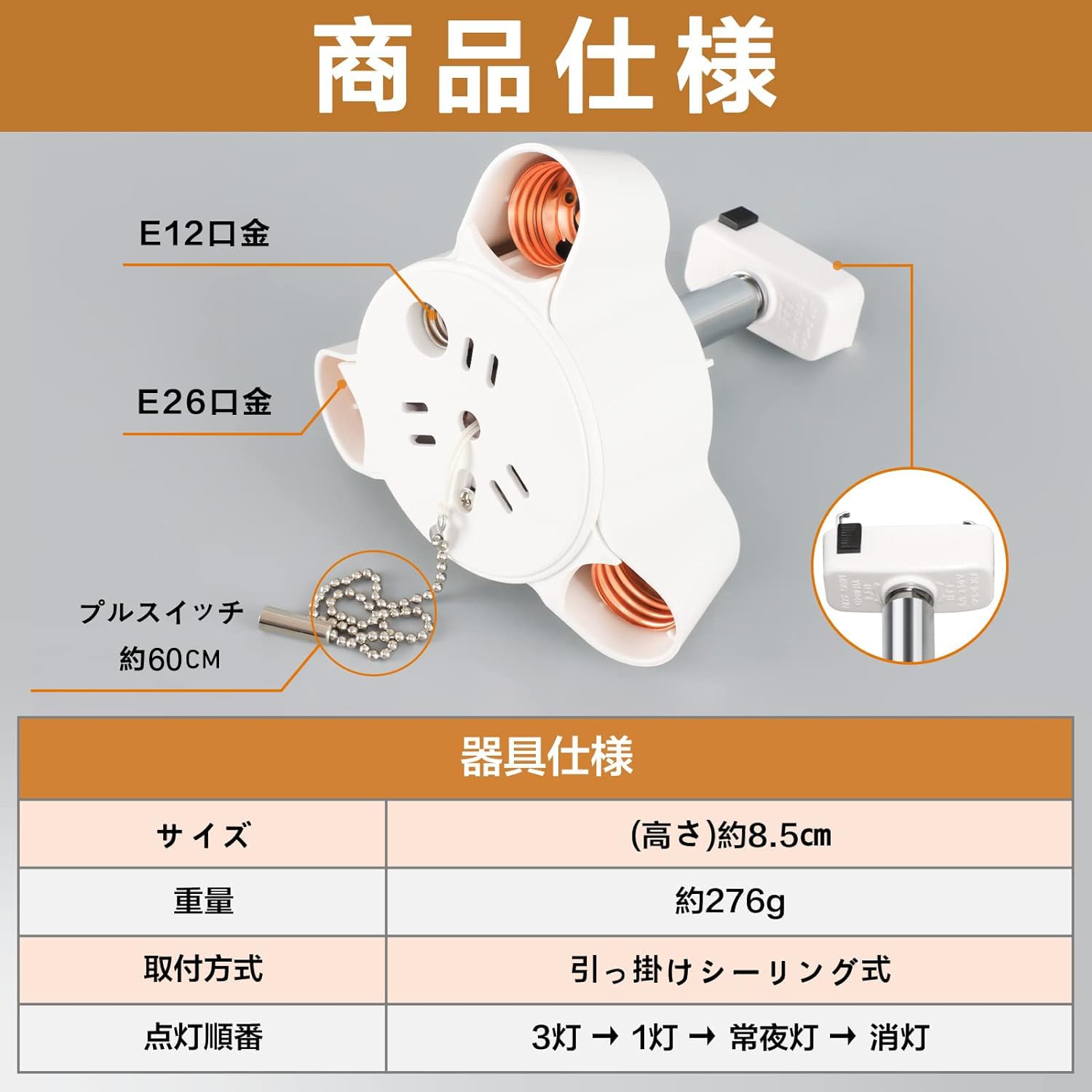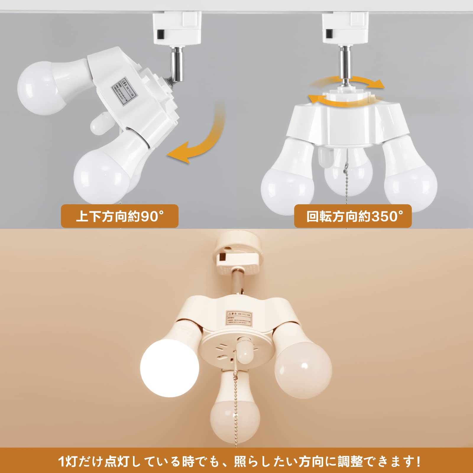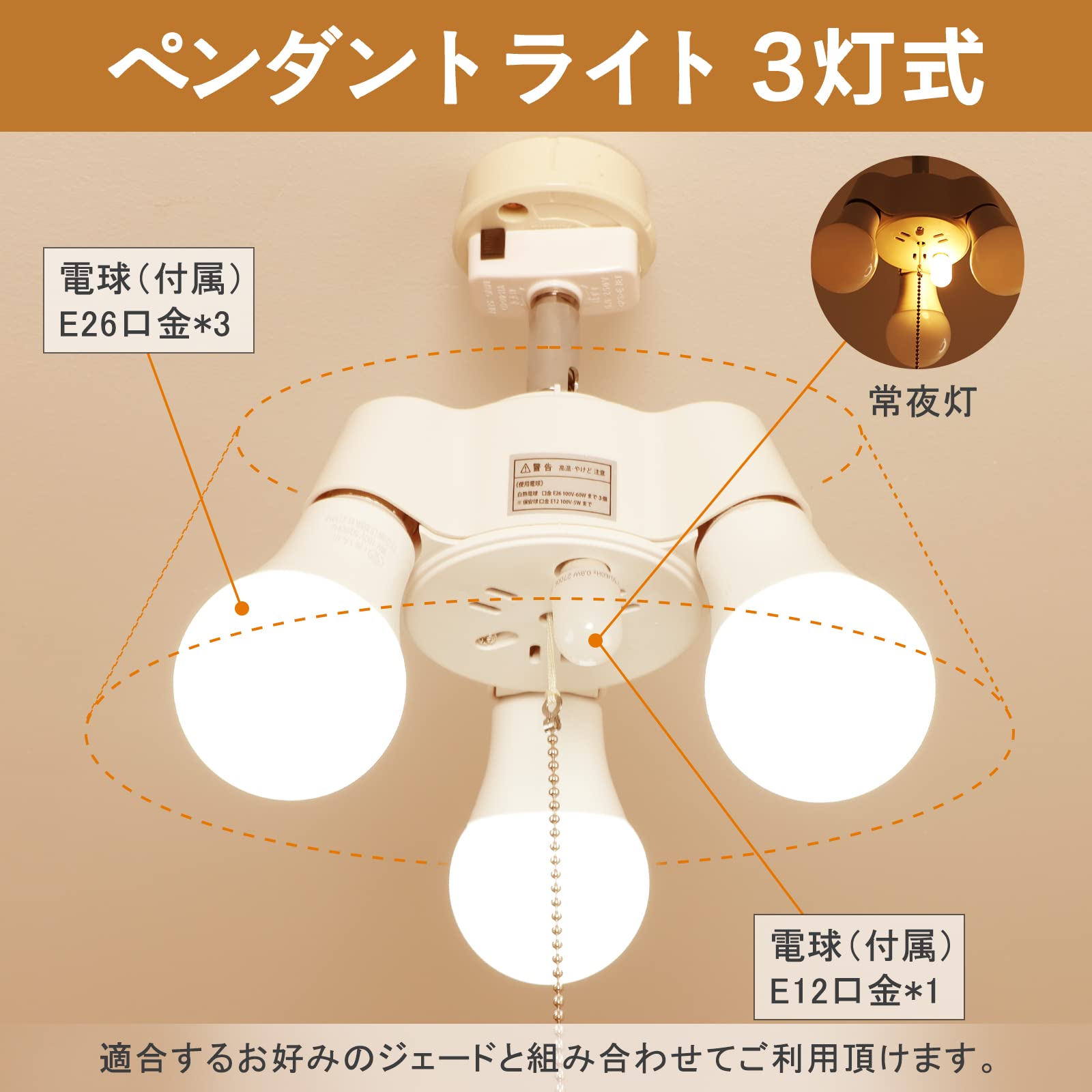 Tengyuan ペンダントライト 3灯 60cm超長いチェーン付き E26 LED電球付き 引掛けシーリング用 天井照明 ソケット 【 60W形 電球色*3+E12 常夜灯 電球色*1】