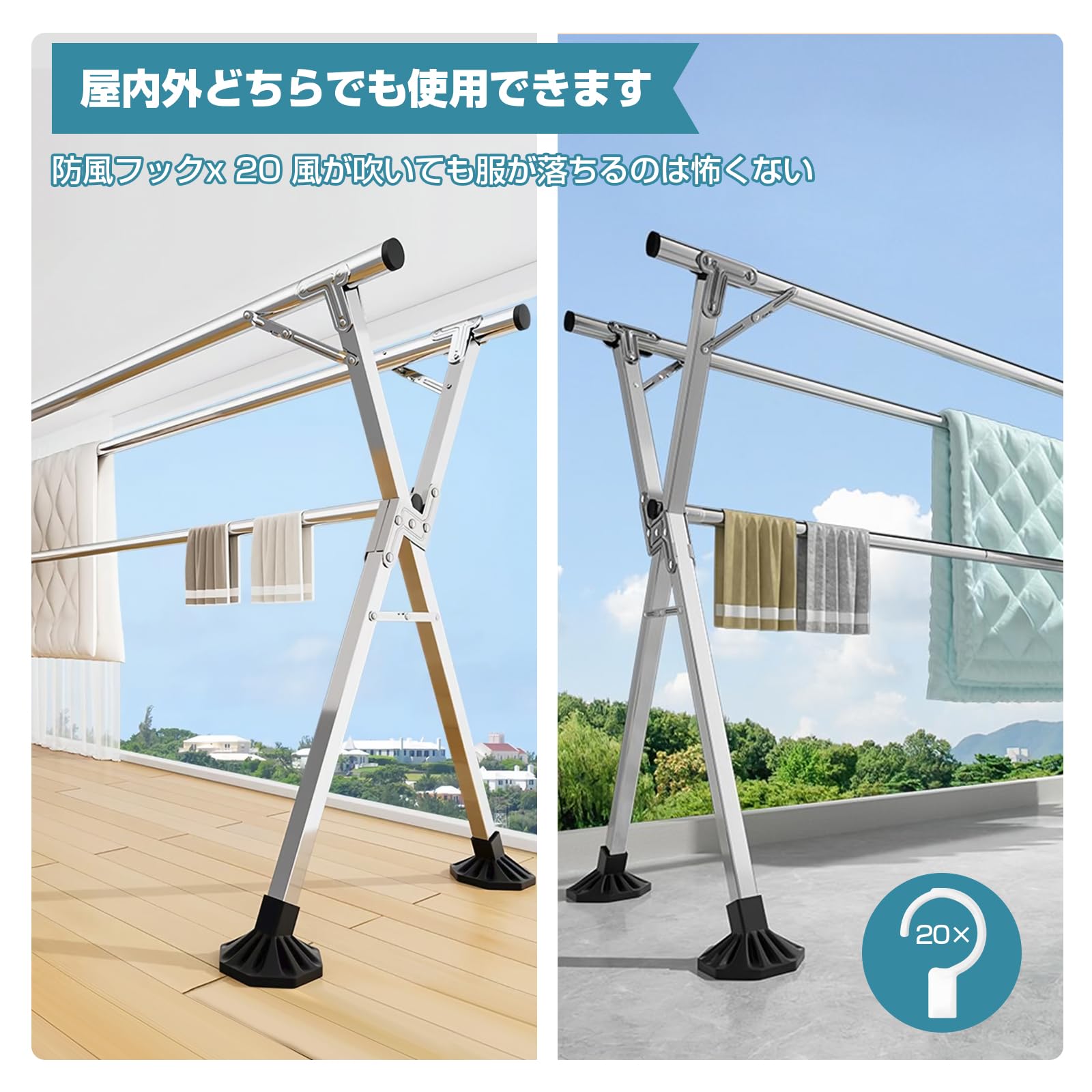 ステンレス、物干しハンガー、物干し竿、洗濯物干しハンガー、組み立て簡単、折りたたみ伸縮式、省スペース、室内干し、室外防風、頑丈設計、調節可能、独立式、防風フック付き*20(シルバー、1.35~2 M)