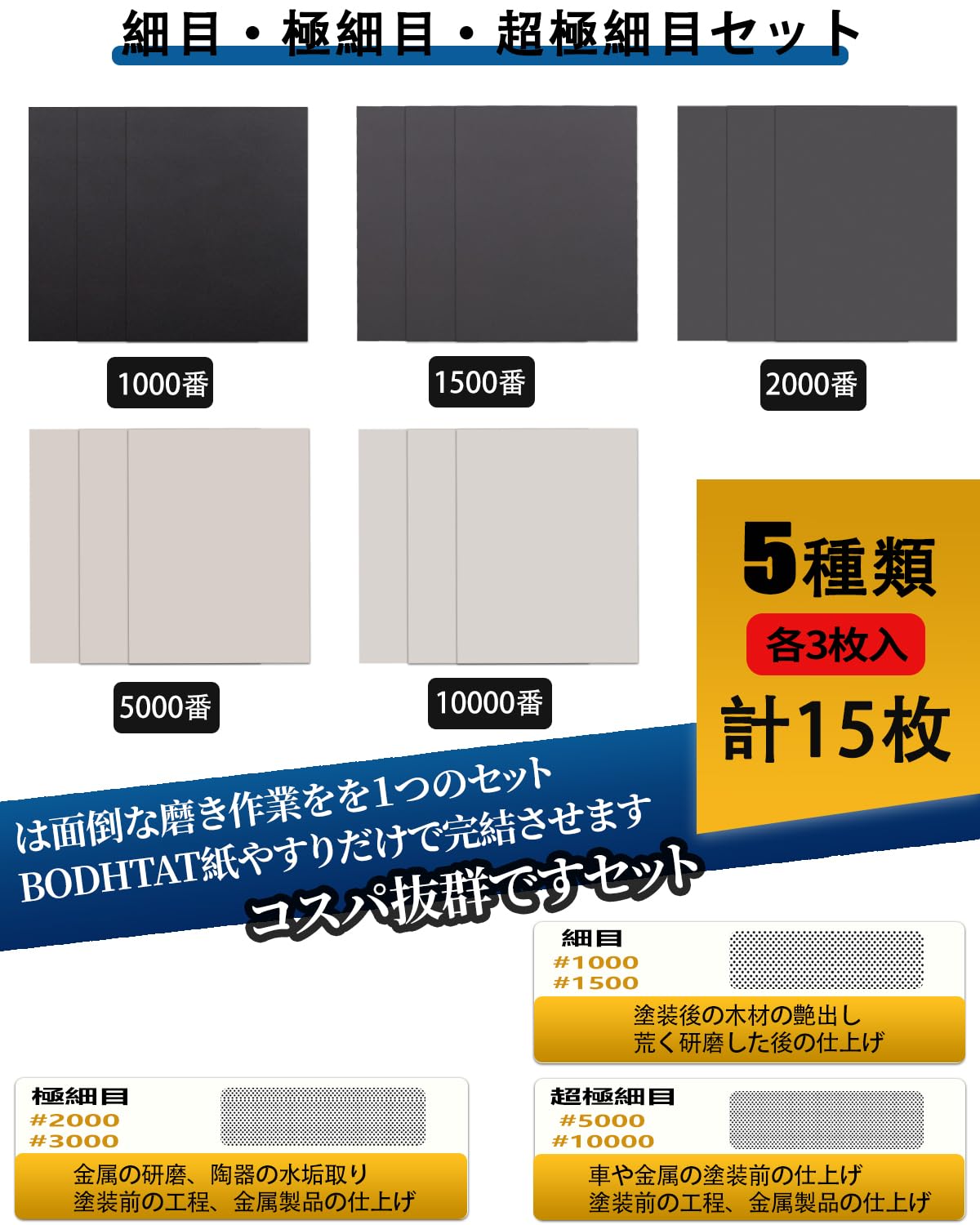 BODHTAT 紙やすり 15枚5種類 1000~5000番 耐水ペーパー セット 280×230mm サンドペーパー (1000/1500/2000/3000/5000 各3枚) 紙ヤスリ 耐水ヤスリ,車 金属磨き 木工DIY作業に キッチンの掃に最適です