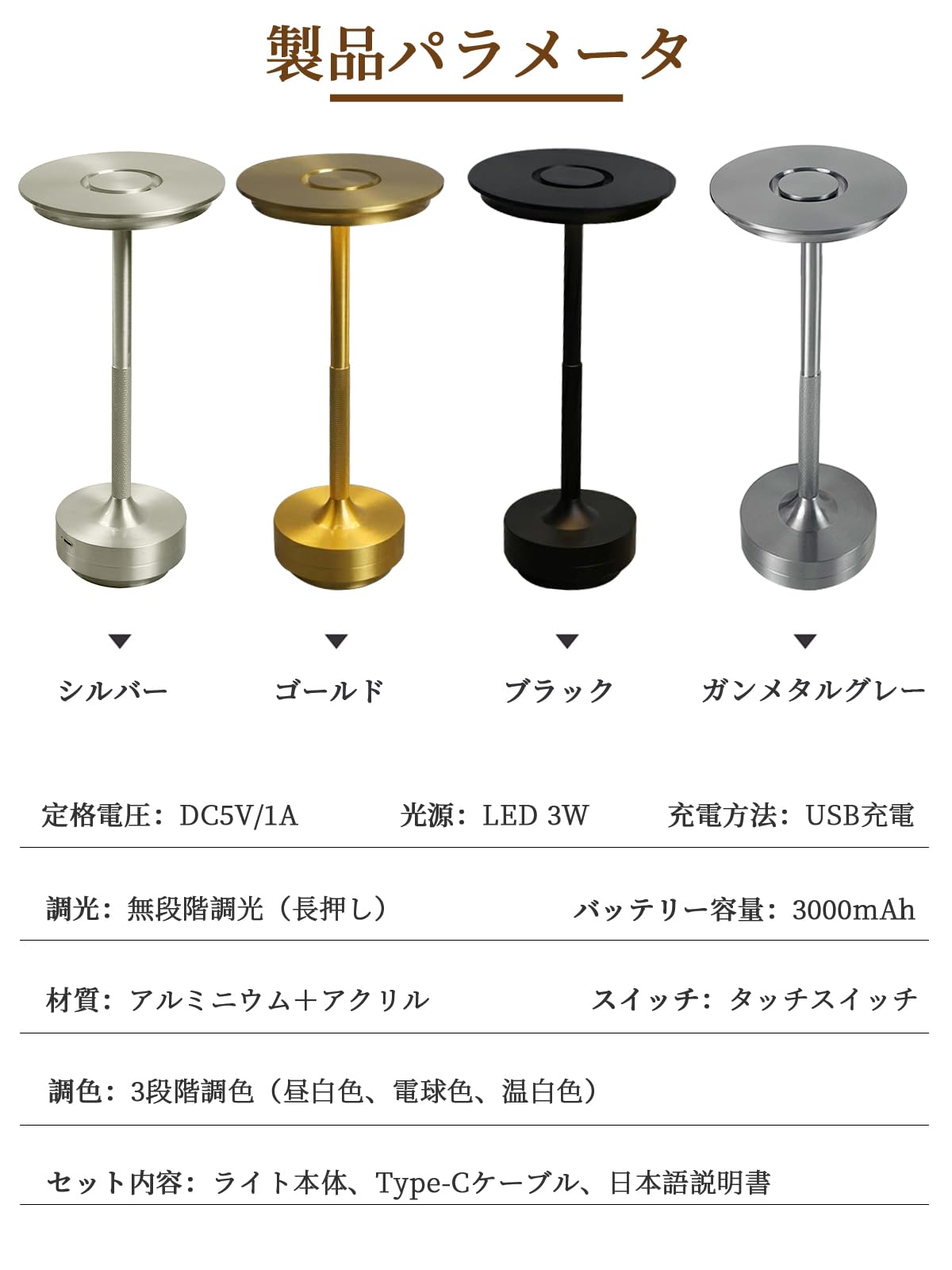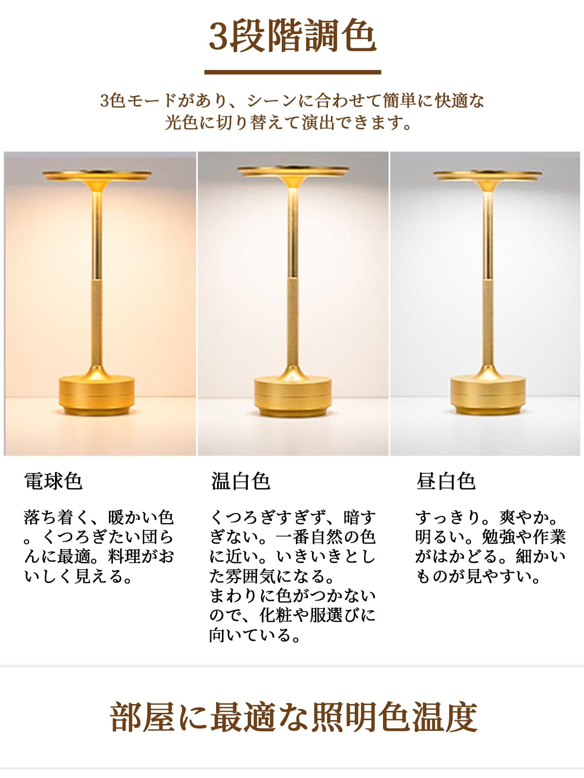 テーブルランプ おしゃれ 間接照明 レトロ コードレス 北欧 タッチセンサー ベッドサイドライト 寝室 卓上 電気スタンド テーブルライト アンティーク 3段階調色 無段階調光 ナイトライト 充電式 ベッドサイドランプ (ゴールド(金))