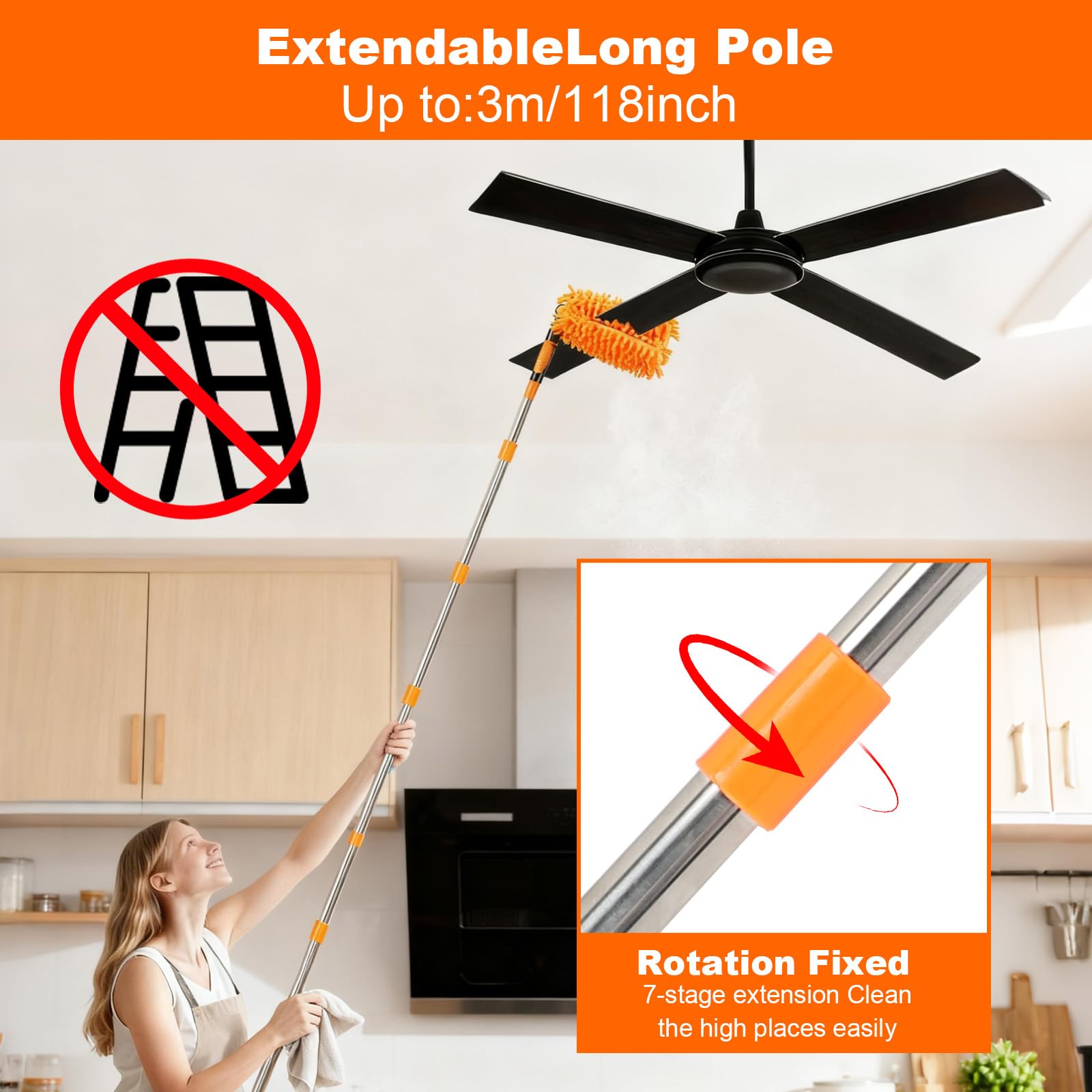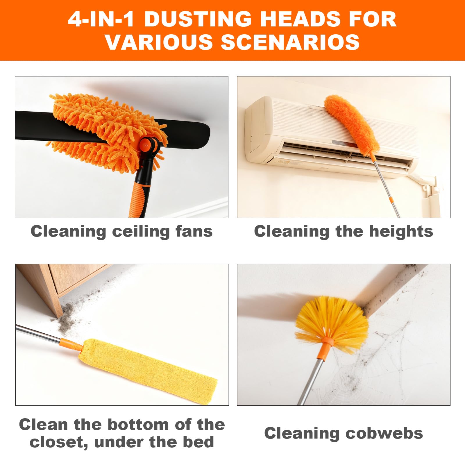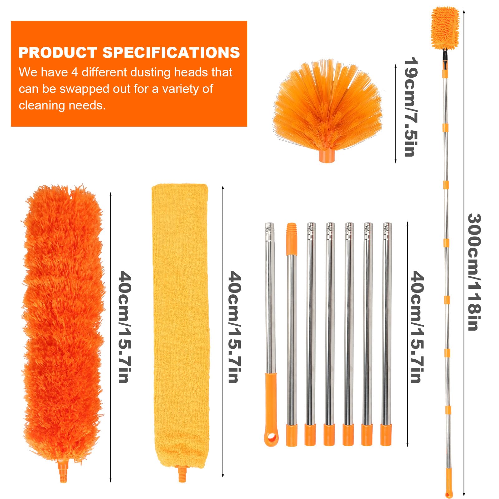 特長:このクリーナーには、長さ9.8フィート(118インチ)の調節可能なポールが付属しています。7つの取り外し可能なポールセクションにより、必要に応じて長さを調節できます。360°フレキシブルなダスティングヘッドにより、通常は届きにくい狭い場所や高い場所の掃除も簡単に行えます。伸縮ポールには、シーリングファンダスティングヘッド、ダスティングブラシヘッド、隙間ブラシヘッド、クモの巣クリーニングヘッドの4つの専用アタッチメントが付属しています。仕様:カラー:オレンジ材質:ステンレススチールサイズ:42×15×8cm付属品:ファンクリーナー延長ハンドル×7ダスターヘッド隙間ダスターヘッドクモの巣掃除ヘッド
