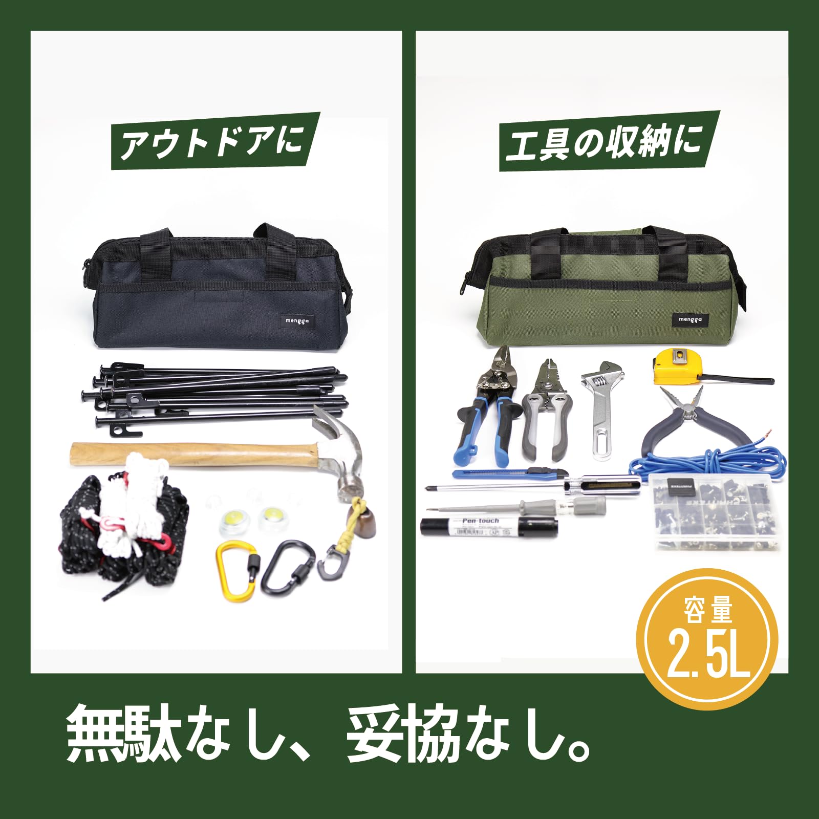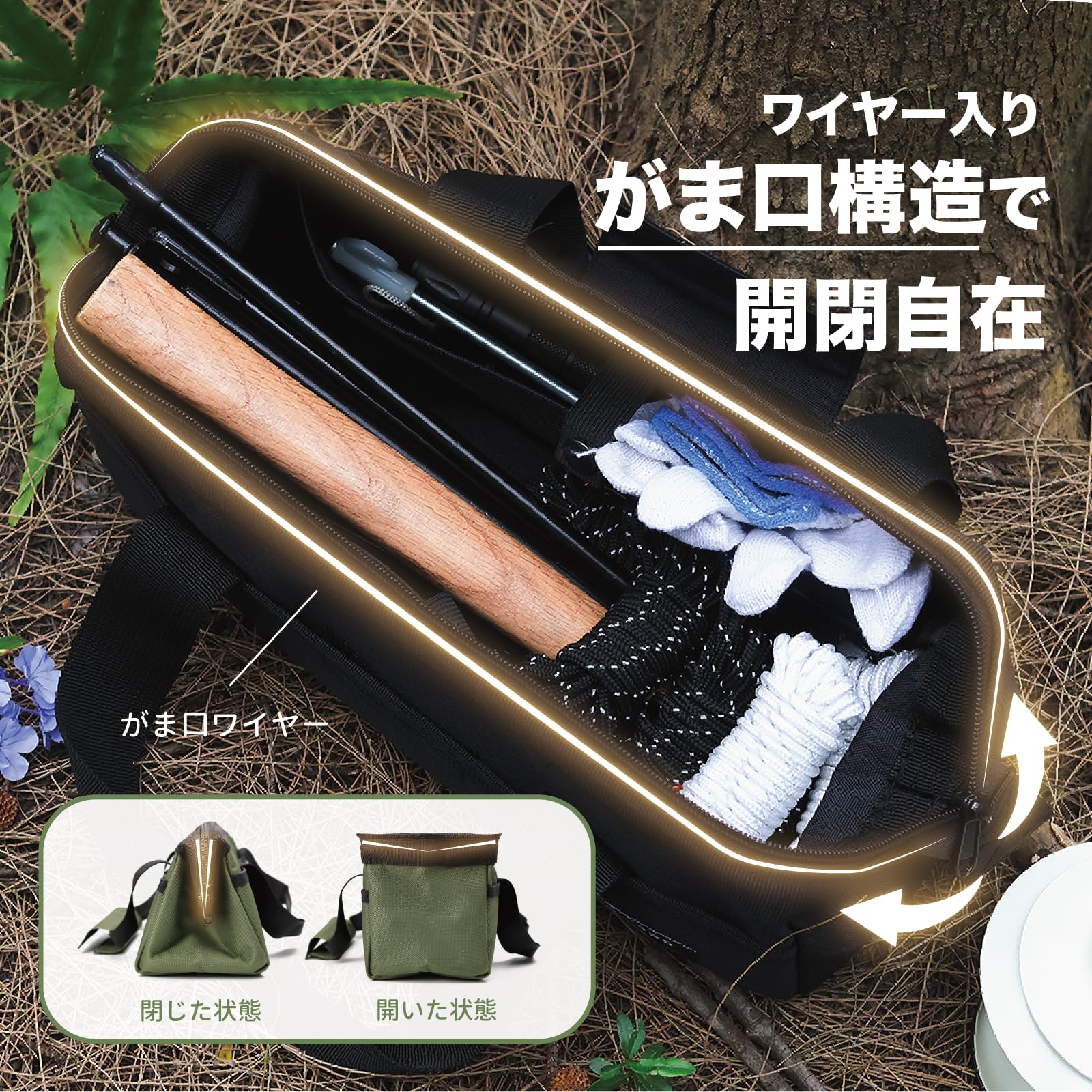 アウトドアツールバッグ ペグケース 工具入れ 600Dオックスフォード PVC一体生地 ワイヤーがま口タイプ 自立 2.5L ペグ・ハンマー30cm以内対応 小型