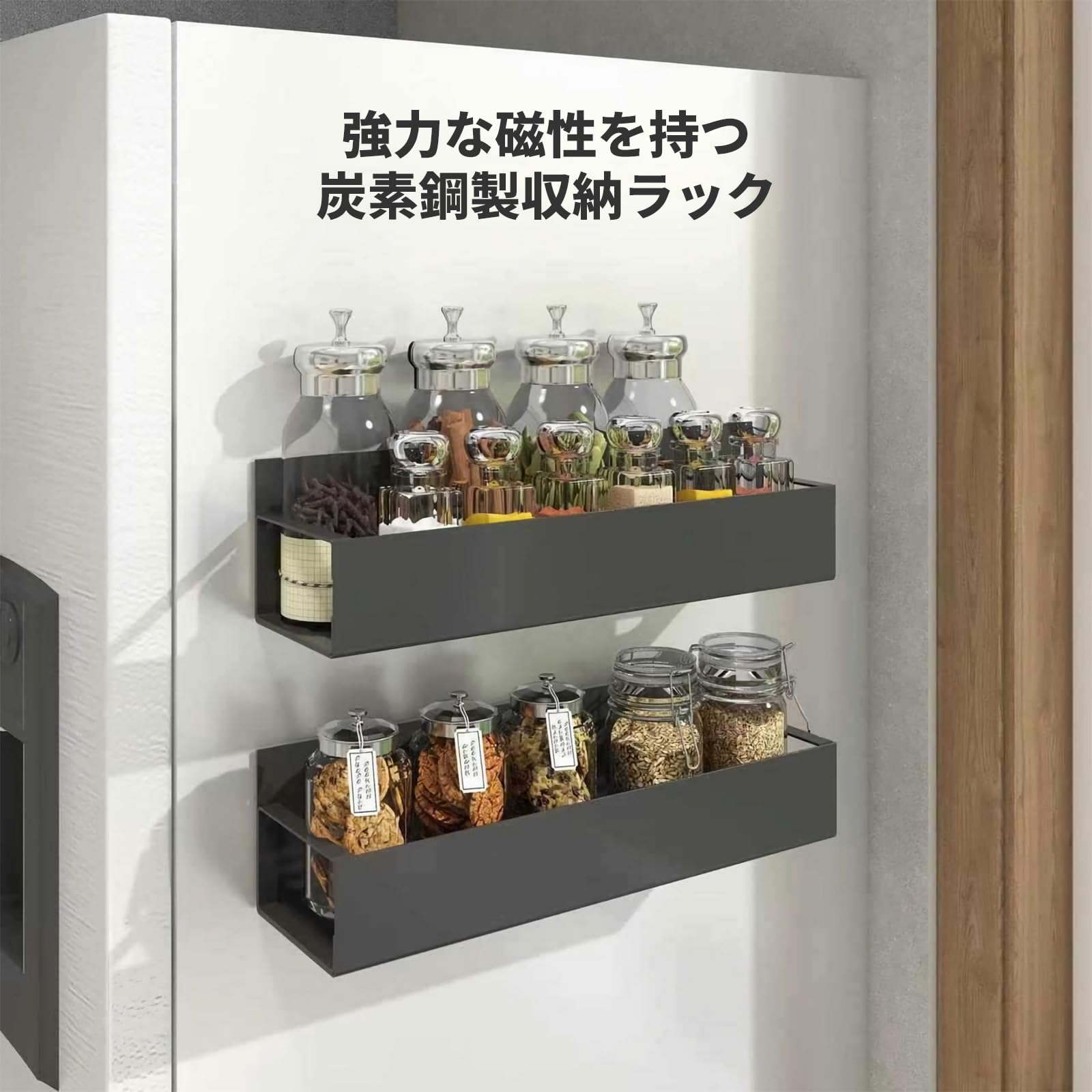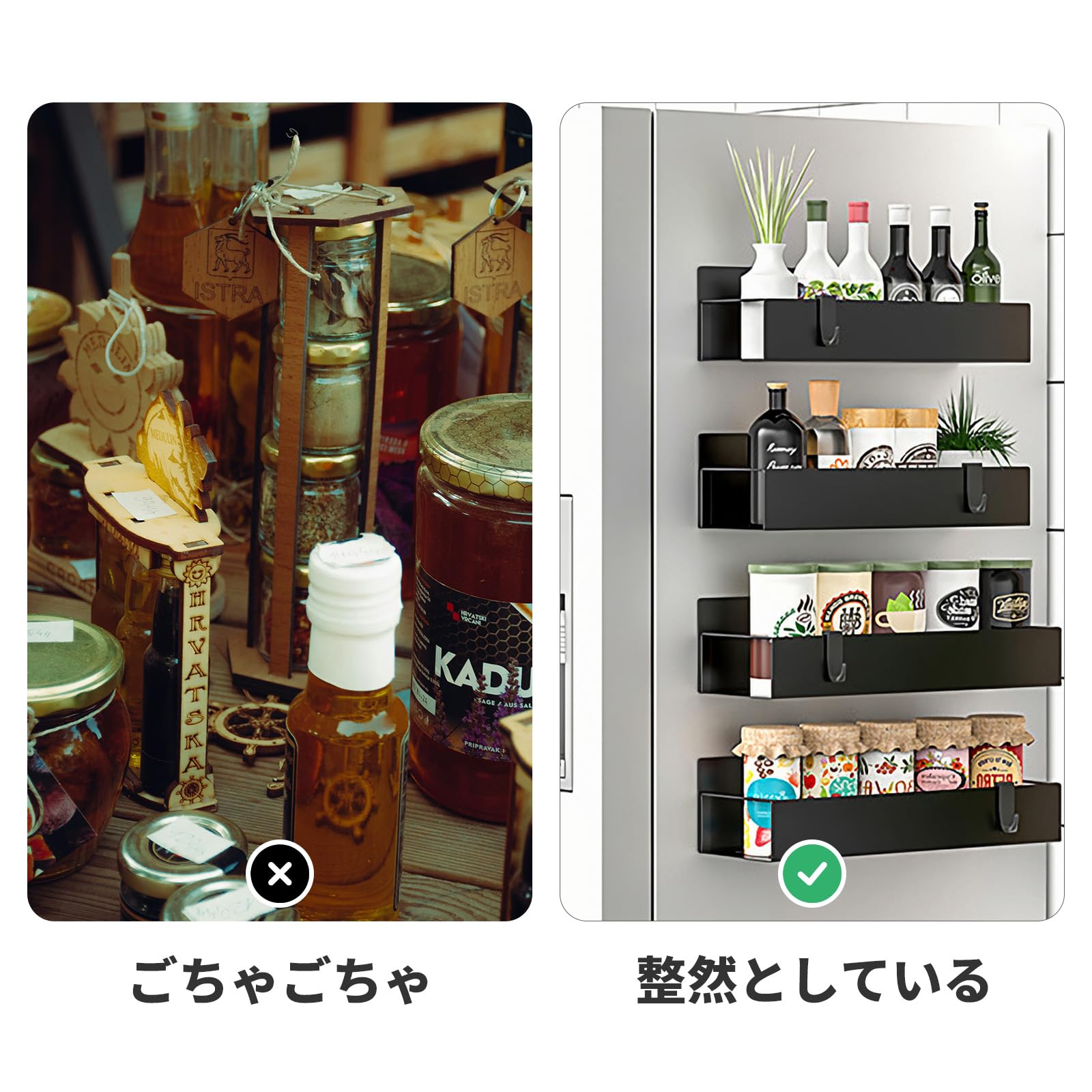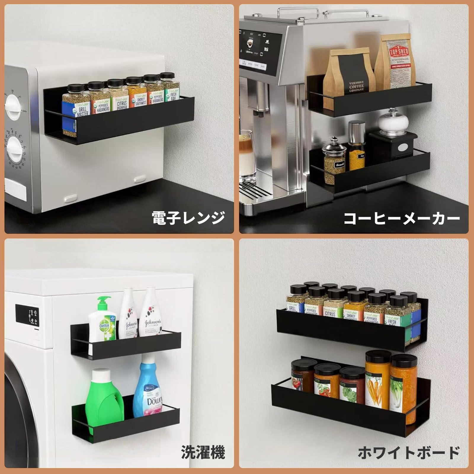 COVAODQ マグネット スパイスラック 冷蔵庫サイドラック 調味料ラック マグネット フック10個付き(ブラック 4点セット)
