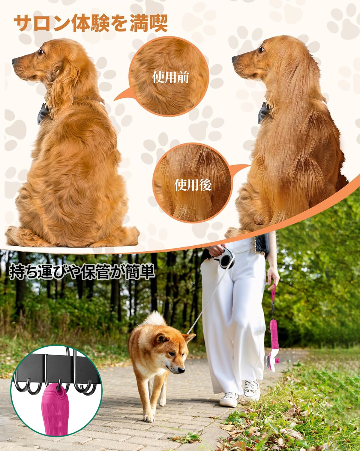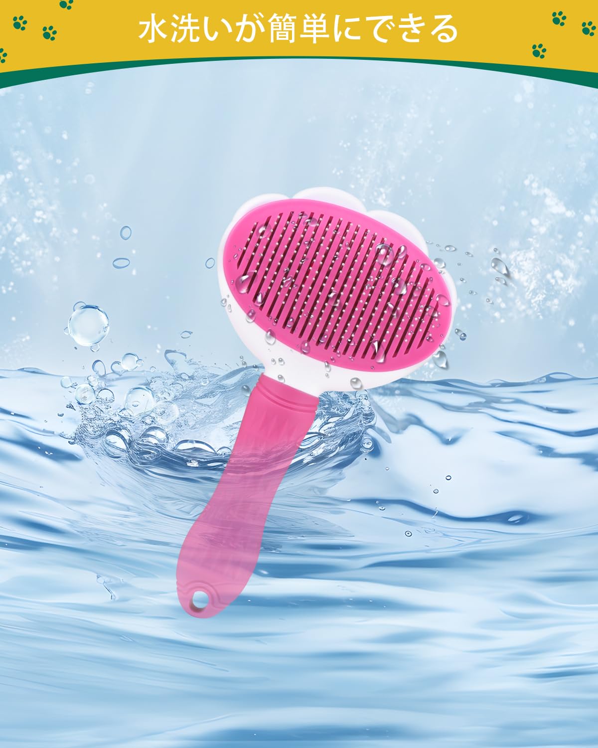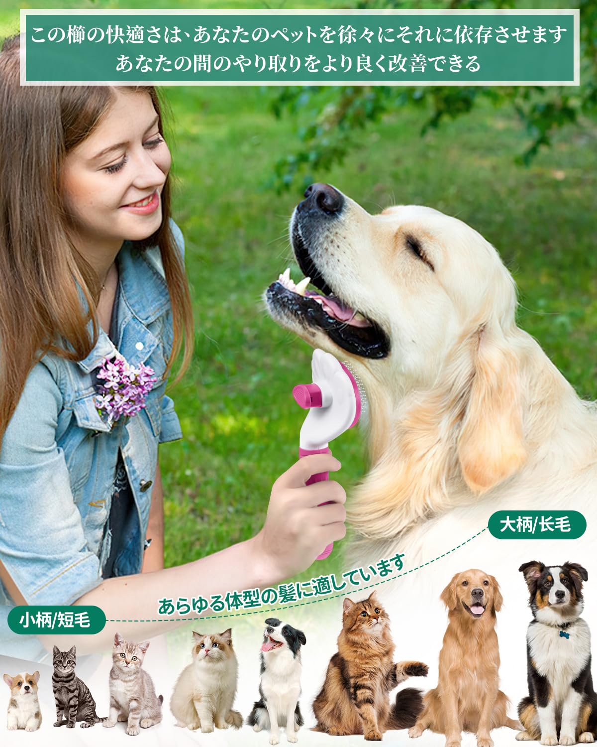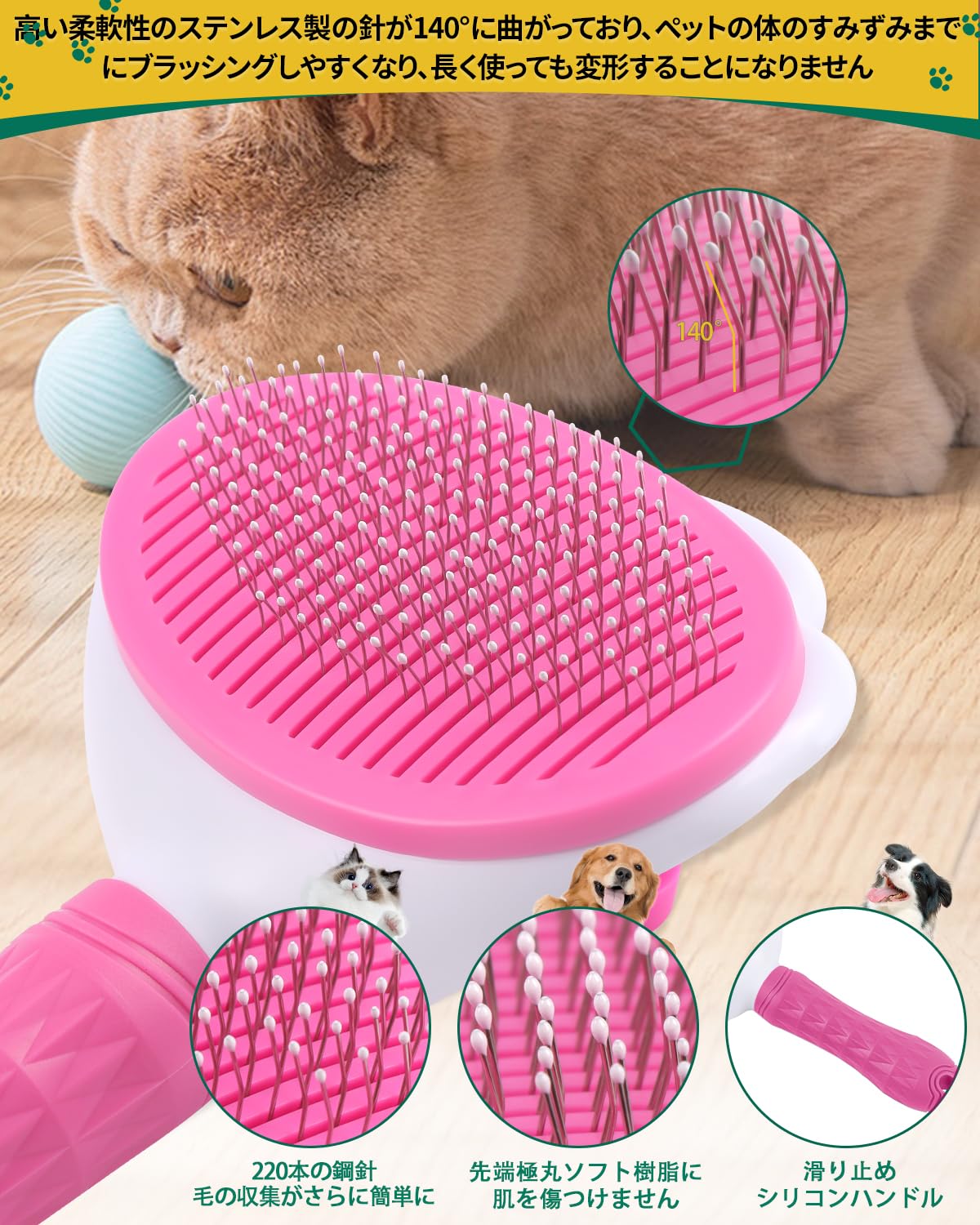 BODHTAT ペットブラシ 痛くない ヒーリングブラシ 長毛・短毛種 猫 犬 スリッカーブラシ(ボタンを押してワンプッシュ式 抜け毛除去簡単)犬猫通用グルーミングブラシ(ピンク)