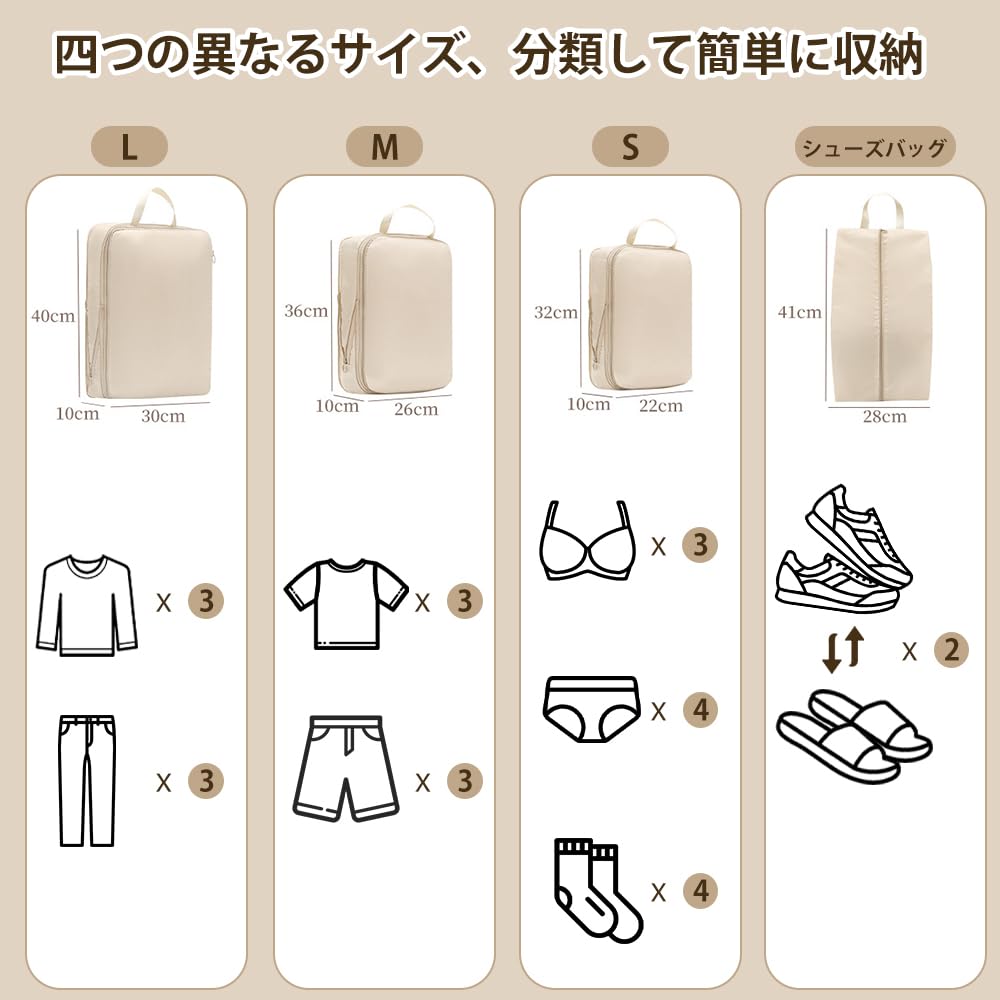 旅行用圧縮袋 4点セット トラベルポーチ 衣類仕分け スペース40%節約 パッキングオーガナイザー 旅行 出張収納ポーチ 撥水性