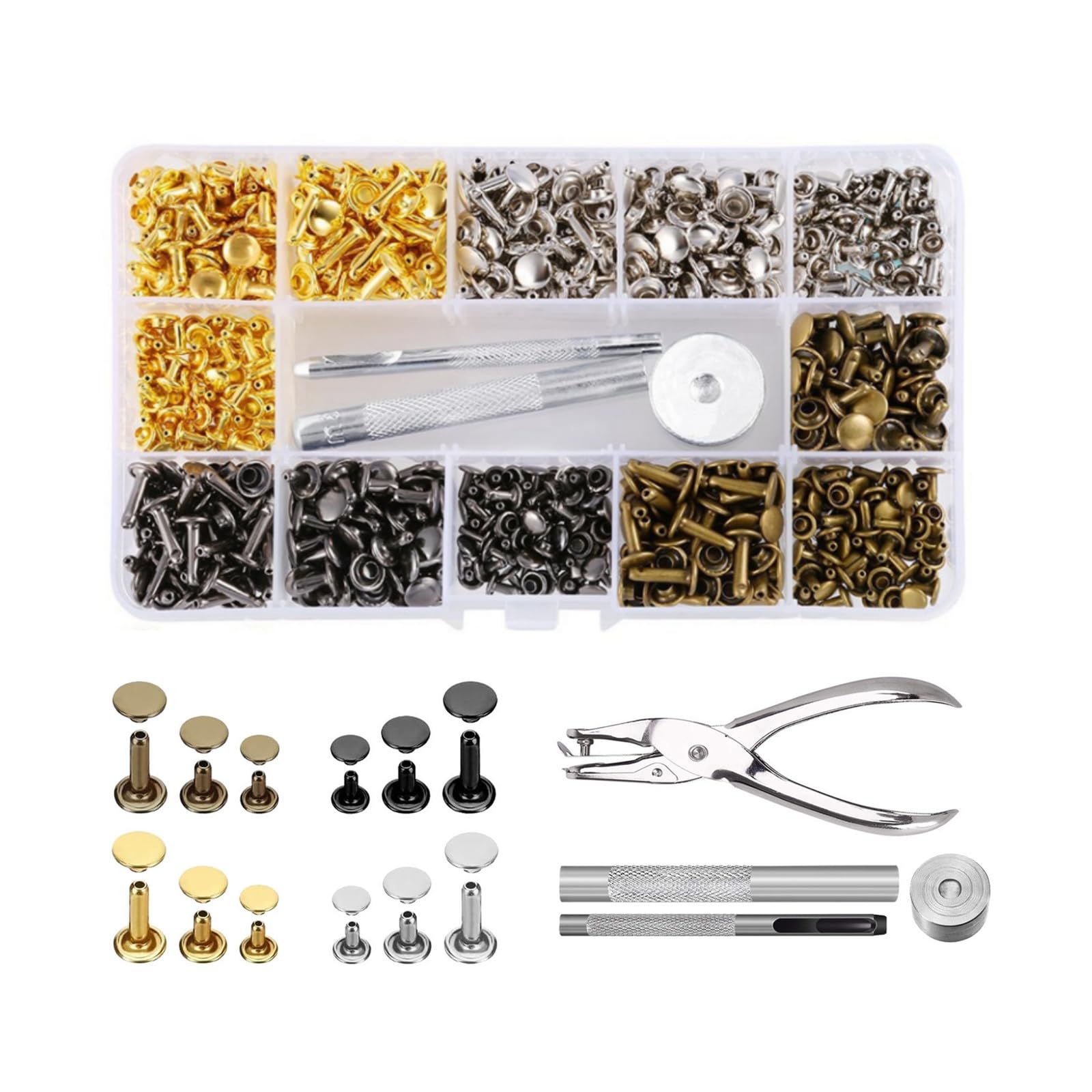 レザークラフト カシメセット 4種色リベット リベット 革細工 工具セット 丸形6mm 8mm 12mm スタッズ 底鋲 打ち具セット DIY 手作り ダンボール財布 布革細工 靴 収納ケース付き