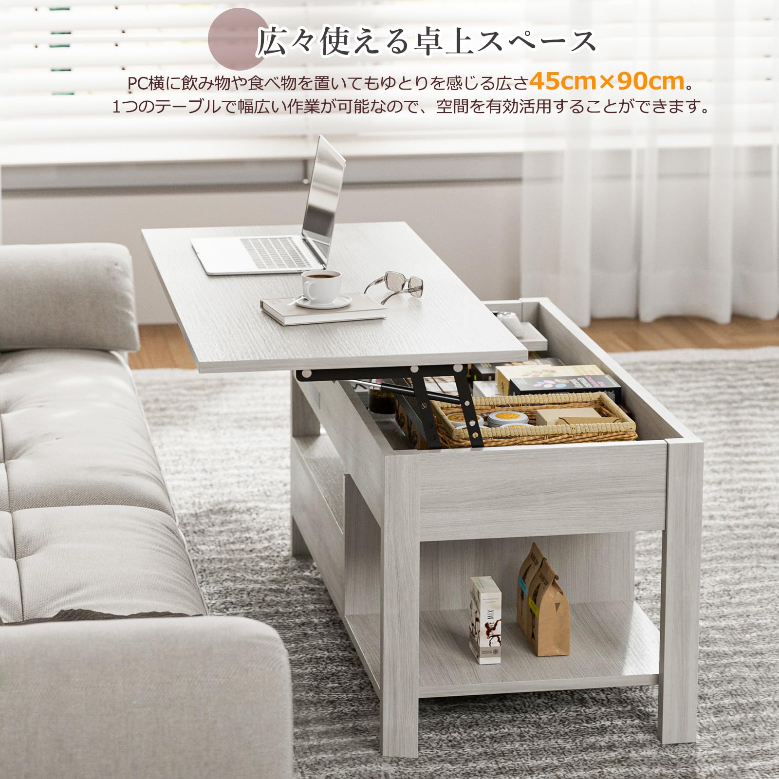 IKIFLY ローテーブル 昇降式 木製 コーヒーテーブル 引き出し付き テーブル 収納付き センターテーブル 大容量収納リビングテーブル 高さ調整リフティングテーブル 簡単開閉 ホンムオフィステーブル 昇降式 コンパクト リビングルーム オフィス用 在宅勤務 食事一人暮らし 幅90×奥行45×高さ46.2-59cm (グレー)